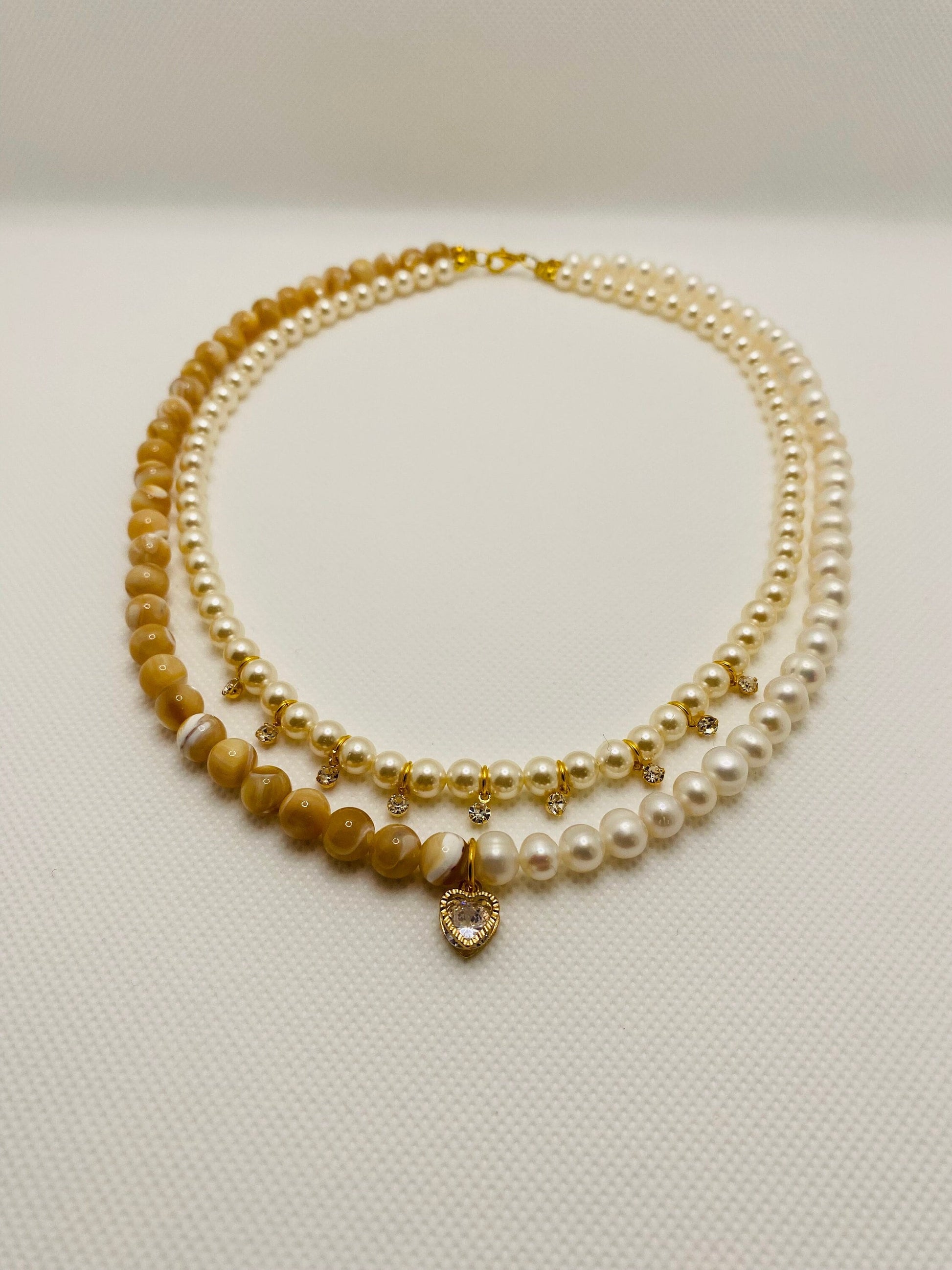 PRODUCT DETAILS : 6mm AAA Natural White Mother of Pearl shell Gemstone Beads. : 8mm AAA Natural Golden Brown Mother of Pearl Shell Gemstone Beads. : 7-8mm AAA Natural White Freshwater Cultured Pearl Beads. : 1cm x 1cm Gold Plated Alloy Heart Pendant with Cubic Zirconia. : 18k Gold Plated Brass Rhinestone Charm Pendants mini round Crystal Clear Charms. : 18k Gold Plated Lobster Claw Clasp. : 18k Gold Plated Jump Rings. : 0.8m Elastic Super Strong Stretchy Cord. : Handmade in a Clean and Safe Environment.
