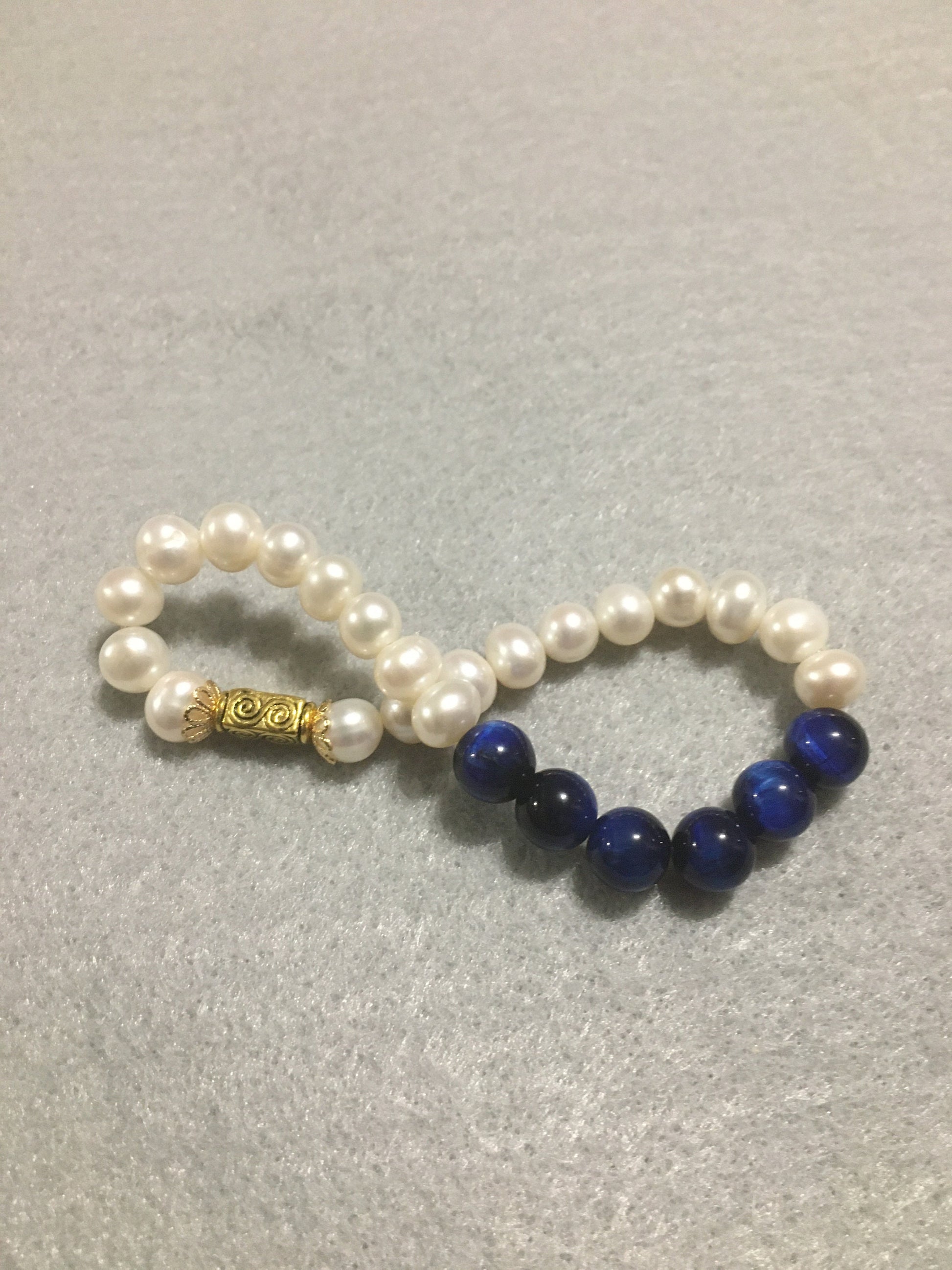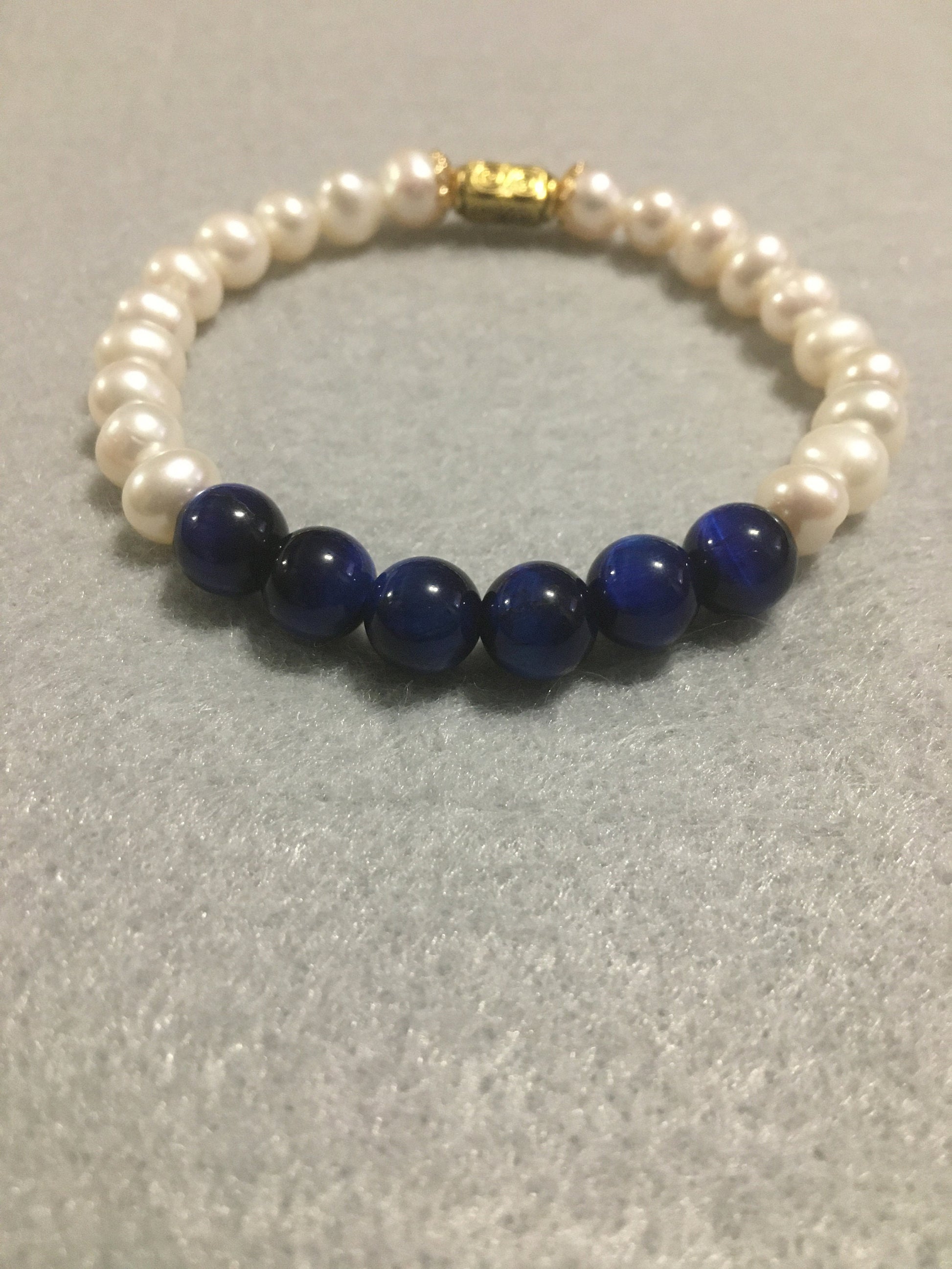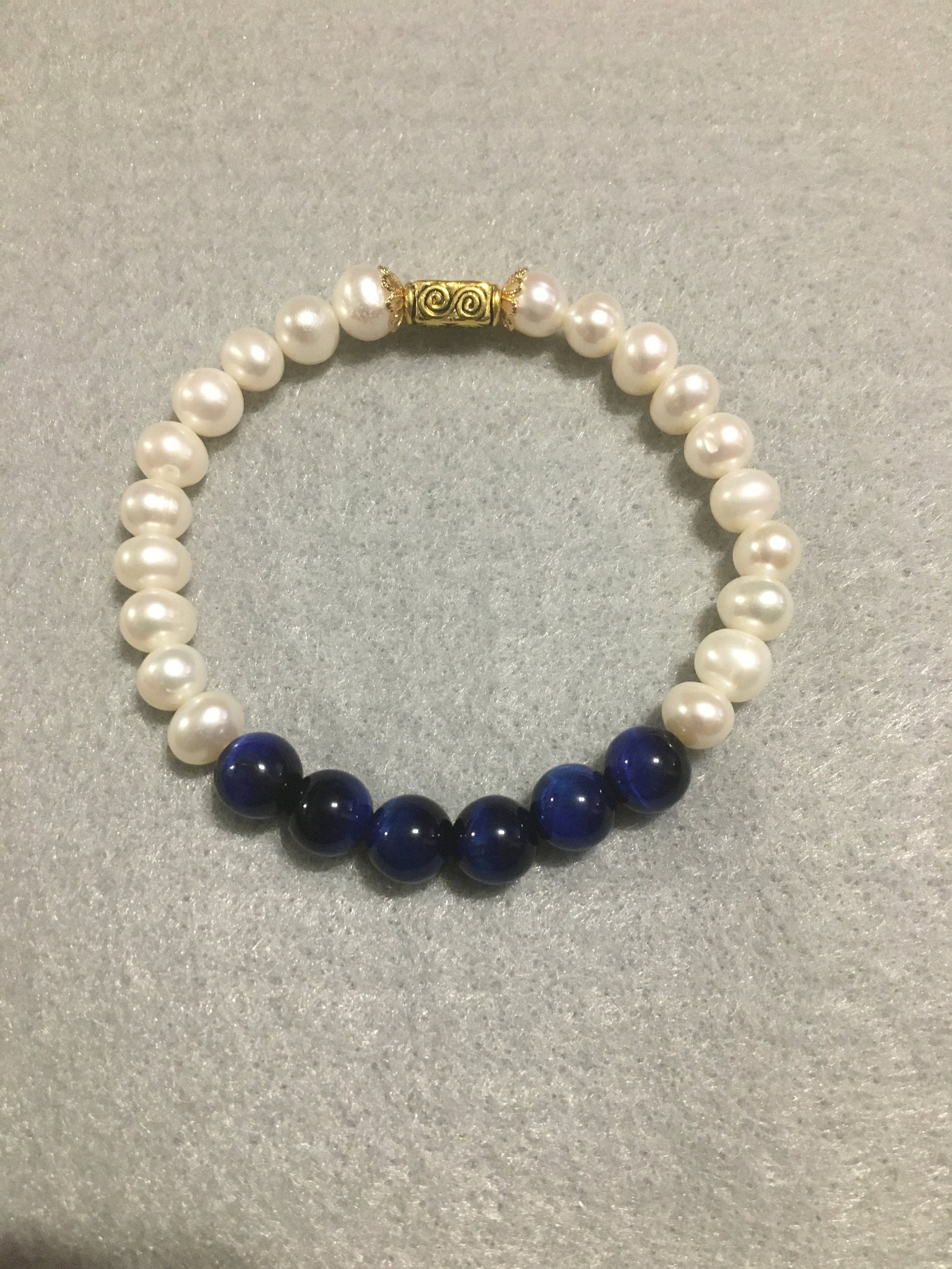 PRODUCT DETAILS - 8mm top quality freshwater pearls - 8mm AAA+ dark blue tiger's eye gemstone beads - Antique gold bead caps & antique gold square bead spacer - Strong, stretchy cord - Handmade in a clean and safe environment