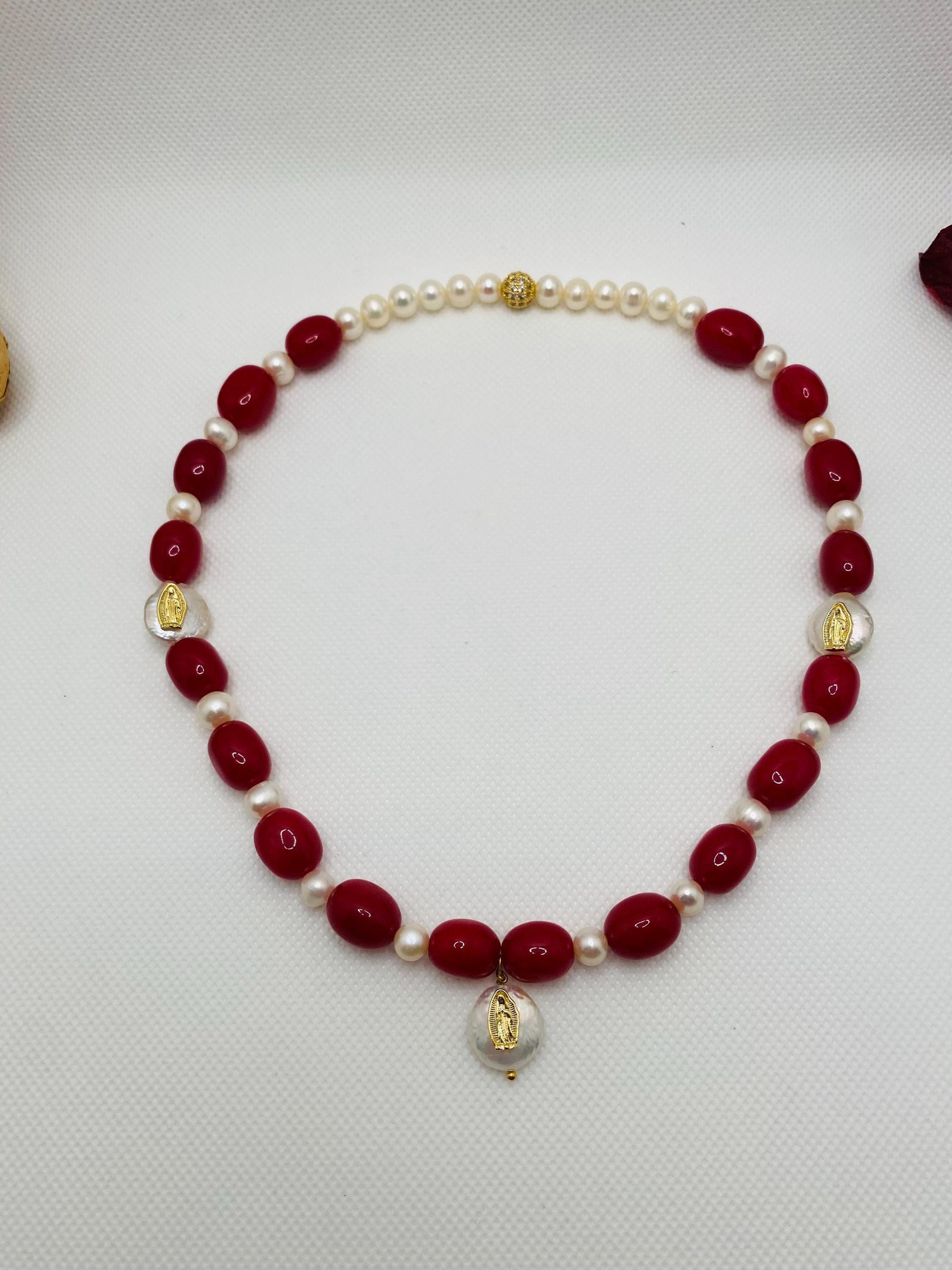 Handmade Red Jade Pearl Necklace: Virgin Mary Religious Jewelry