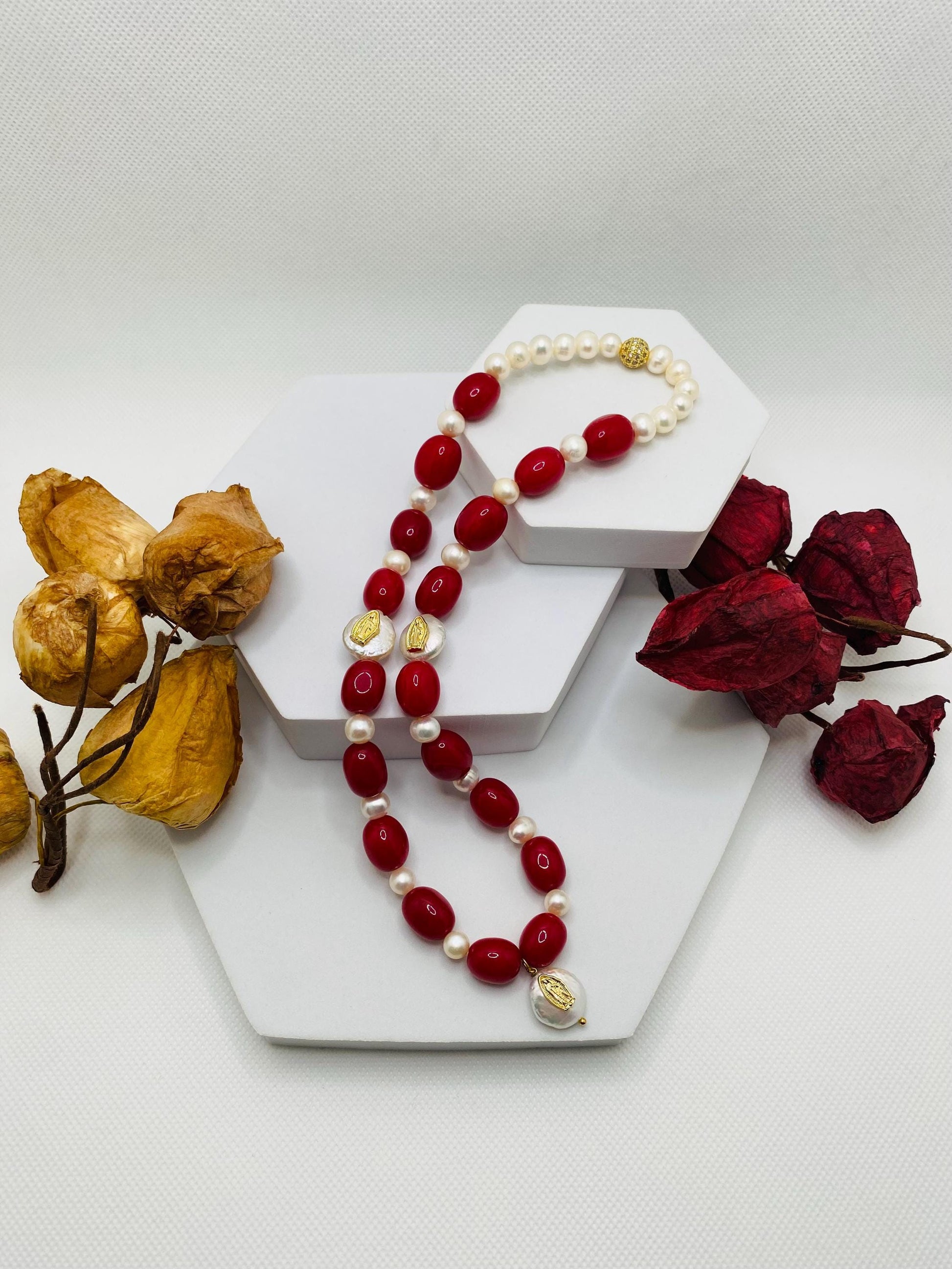 Discover the exquisite beauty of our Handmade Red Jade Pearl Necklace, a stunning piece of Virgin Mary religious jewelry that elegantly blends spirituality with style. Crafted from 10-16mm AA Natural Red Malaysia Jade freeform gemstone beads, this necklace not only serves as a striking accessory but also as a meaningful symbol of faith. Each bead is unique, showcasing its natural variations, making your necklace a one-of-a-kind treasure that speaks to your personal journey. Adorning the necklace are 6-7mm White Natural Freshwater Pearls, which add a touch of elegance and contrast beautifully with the vibrant red jade. The combination of these luxurious materials creates a piece that is perfect for both everyday wear and special occasions. Whether you're dressing up for a religious ceremony or simply want to carry your faith with you, this necklace is a perfect choice. Embrace a piece that resonates with your spirituality while enhancing your wardrobe. Don’t miss out on adding this unique Handmade Red Jade Pearl Necklace to your collection—click 'Add to Cart' and wear your faith with pride today!