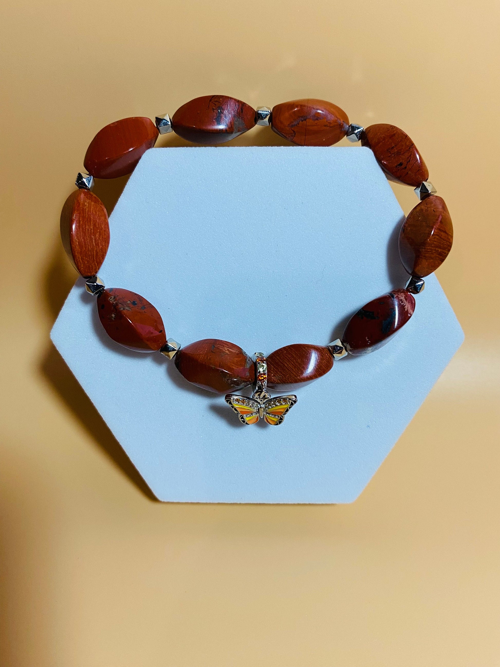 Elevate your style and energy with our Handmade Red Jasper Bracelet, featuring a charming butterfly accent. Crafted from 8x16mm natural genuine red jasper twist beads, this bracelet isn't just a statement piece; it's a symbol of transformation and vitality. The warm, earthy hues of red jasper are known for their grounding properties, promoting a confident demeanor and a boost of positive energy, making it a perfect companion for your daily adventures. Each bracelet is uniquely handmade, ensuring that you own a one-of-a-kind piece of gemstone jewelry. The butterfly charm adds a playful touch, inviting you to embrace change and express your individuality. Complemented by a silver-plated enameled butt, the bracelet offers a blend of elegance and durability, allowing you to wear it for any occasion—be it casual outings or special gatherings. Invest in a piece of jewelry that not only enhances your outfit but also uplifts your spirit. Don’t miss out on owning this beautiful Handmade Red Jasper Bracelet; add it to your collection today and let your style take flight!