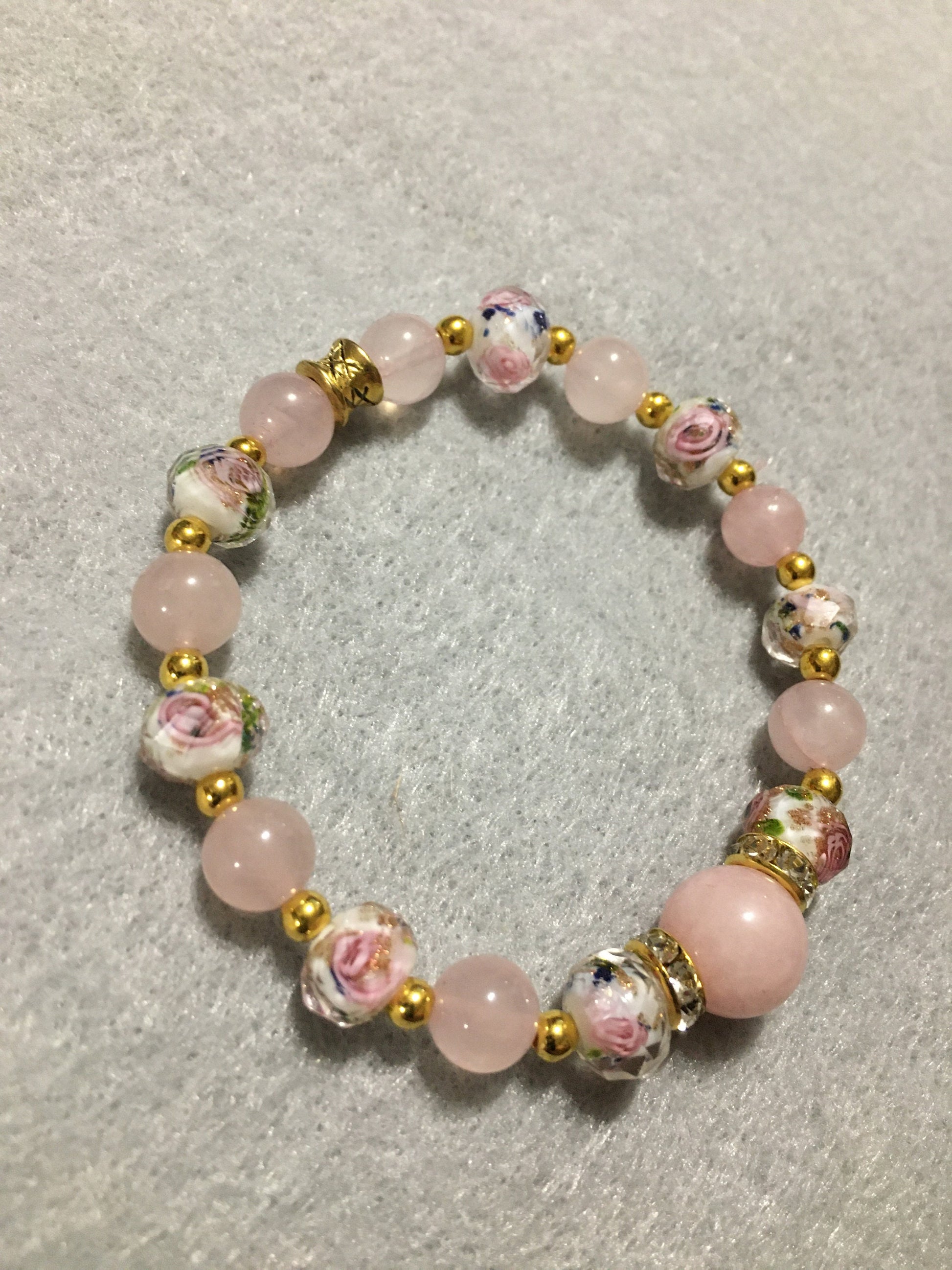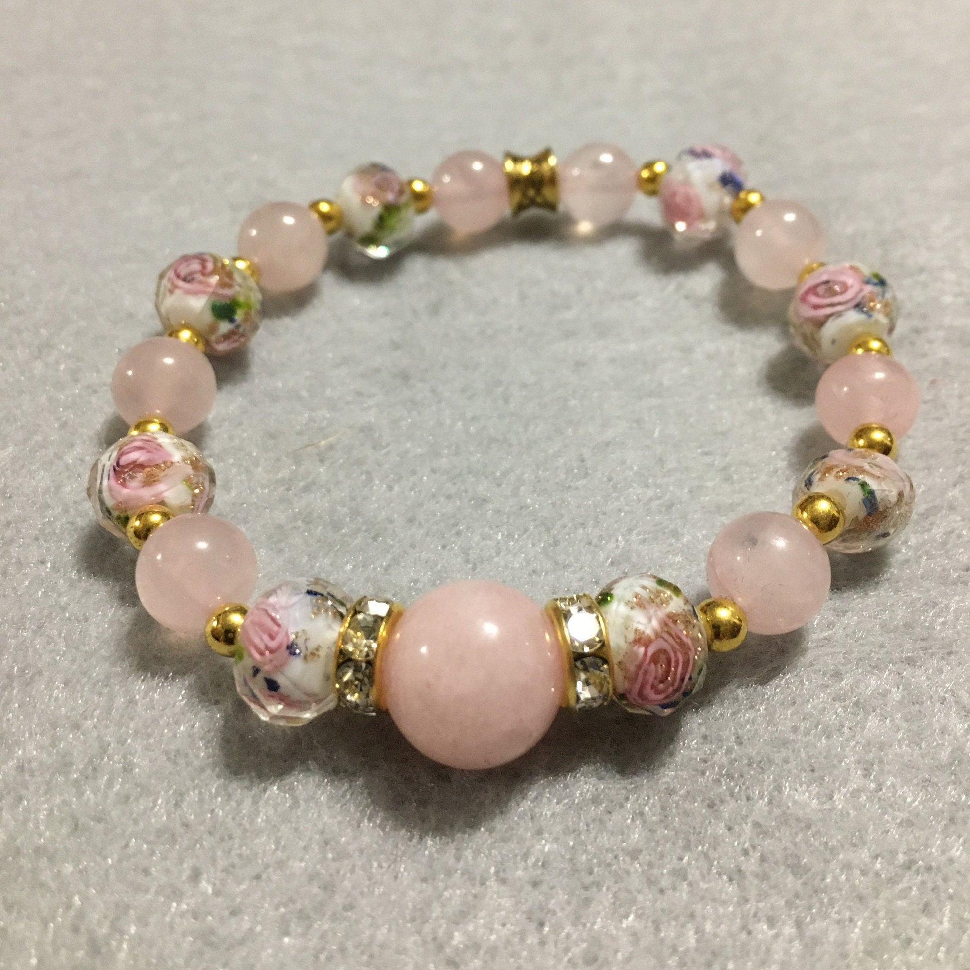 Handmade Rose Quartz Bracelet: Lampwork Floral Glass Beads