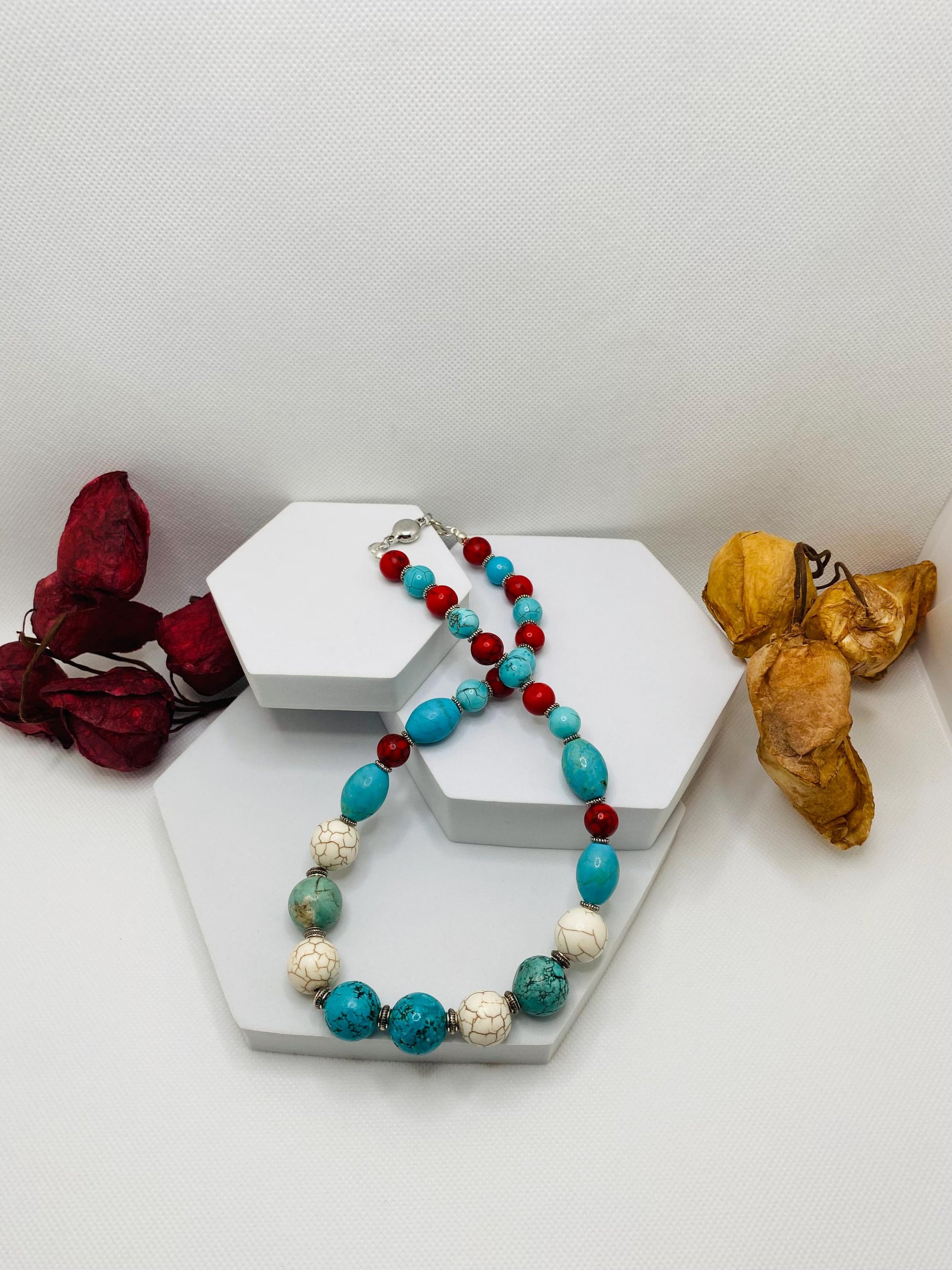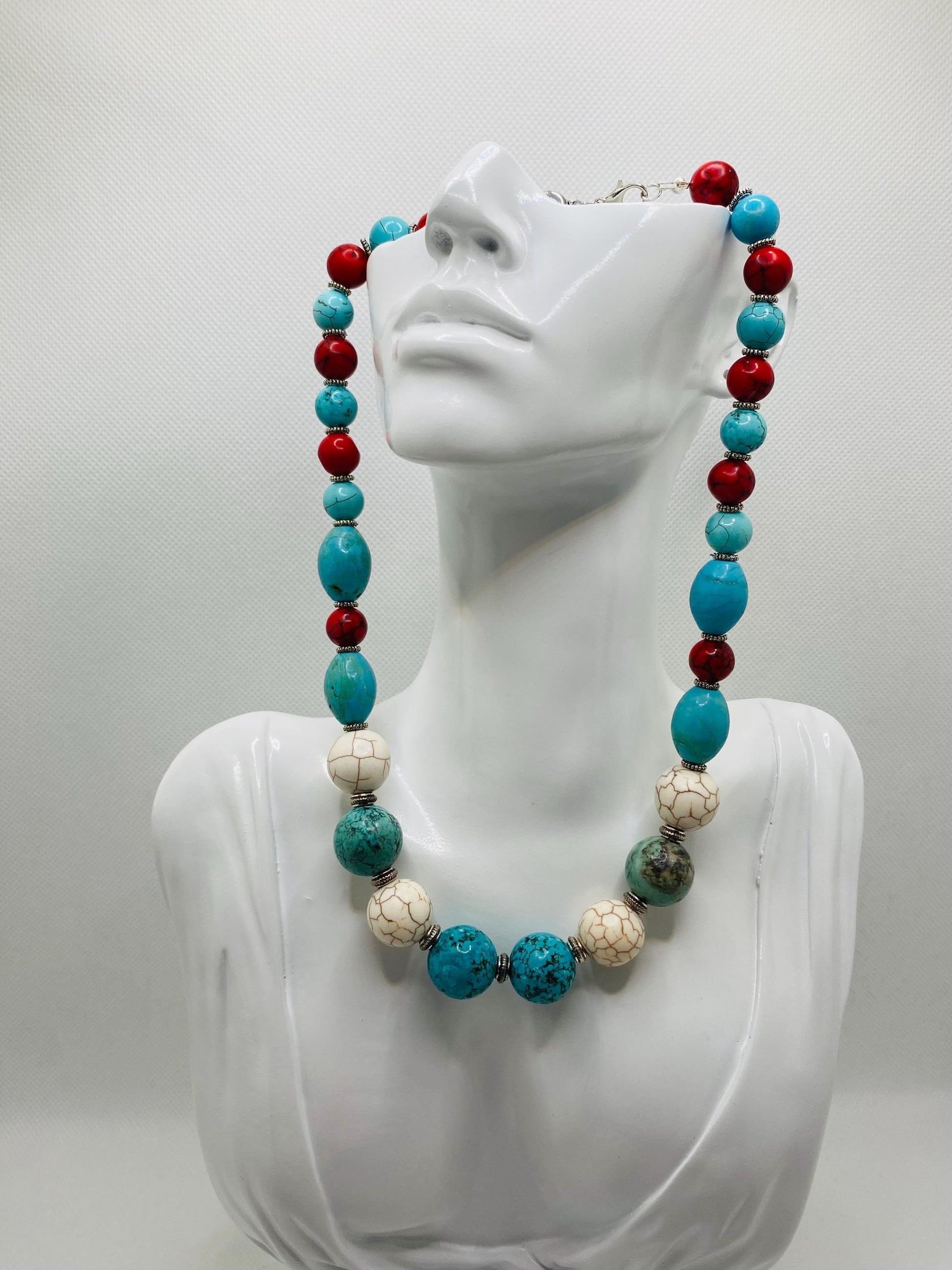 Embrace your inner free spirit with our Handmade Turquoise Beaded Necklace, a stunning piece of boho gemstone jewelry that celebrates the beauty of nature. Crafted with care, this necklace features 16mm beautiful natural blue turquoise gemstone beads that shimmer in the light, complemented by the serene elegance of 16mm natural white turquoise gemstones. Perfect for adding a pop of color to any outfit, this necklace effortlessly transitions from casual daywear to elegant evening attire. Each bead is thoughtfully hand-selected to ensure unique variations, making your necklace one-of-a-kind. The soothing hues of turquoise not only bring a fresh vibe but are also believed to promote harmony and balance. Lightweight and comfortable, you can wear it all day long without a second thought, making it an essential addition to your jewelry collection. Don’t miss out on this exquisite piece that showcases your individuality and love for natural beauty. Elevate your style and express your unique flair—grab your Handmade Turquoise Beaded Necklace today!