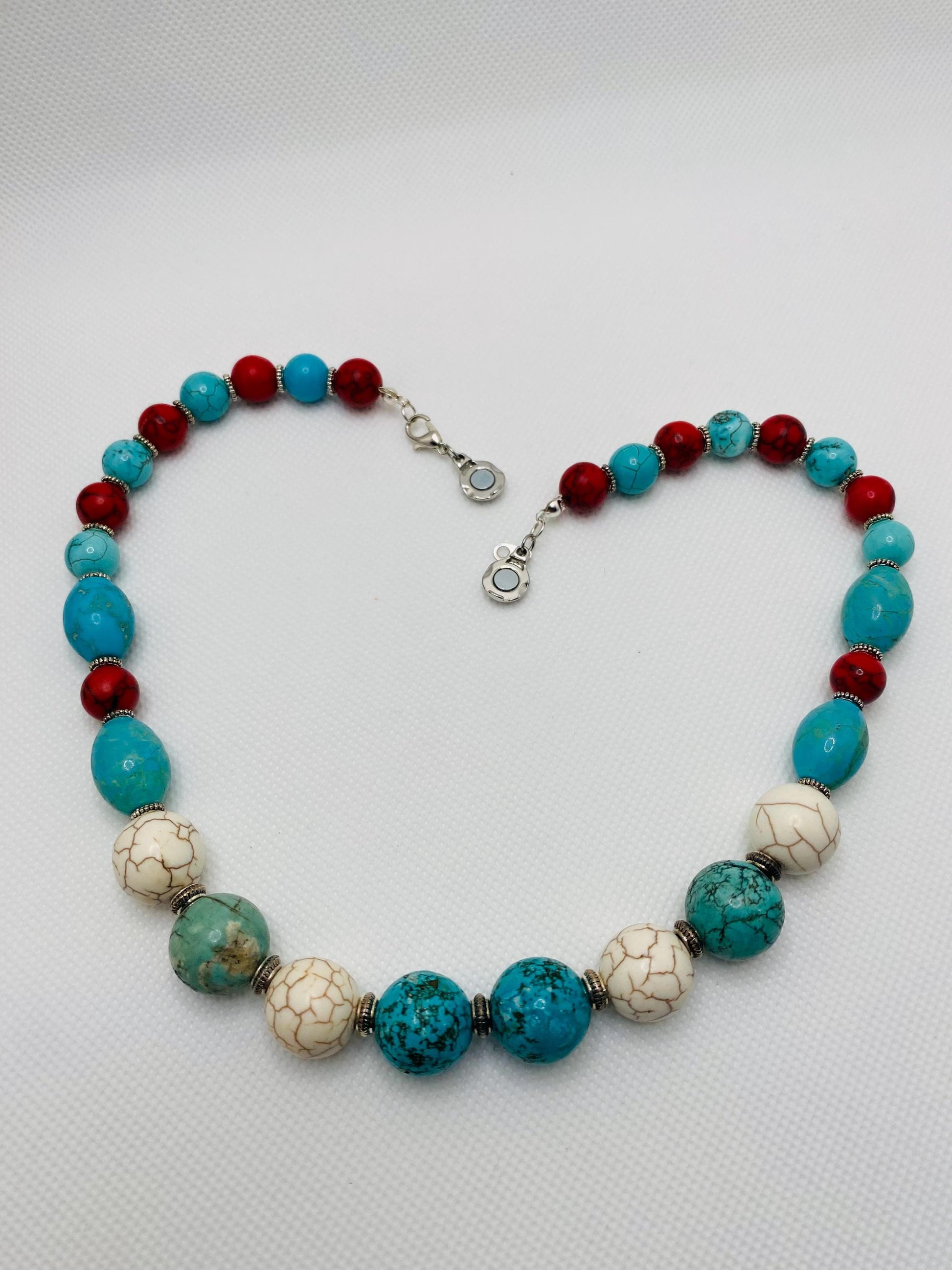 Product Details: 16mm Beautiful Natural Blue Turquoise Gemstone Beads. 16mm Beautiful Natural White Turquoise Gemstone Beads. 20x12mm Beautiful Natural Turquoise Gemstone Beads. 10mm Natural Blue and Red Turquoise Gemstone Beads. Antique Silver Tibetan Jewelry Spacers Silverplated Strong Magnetic Clasp .8mm Super Strong Stretchy Cord.