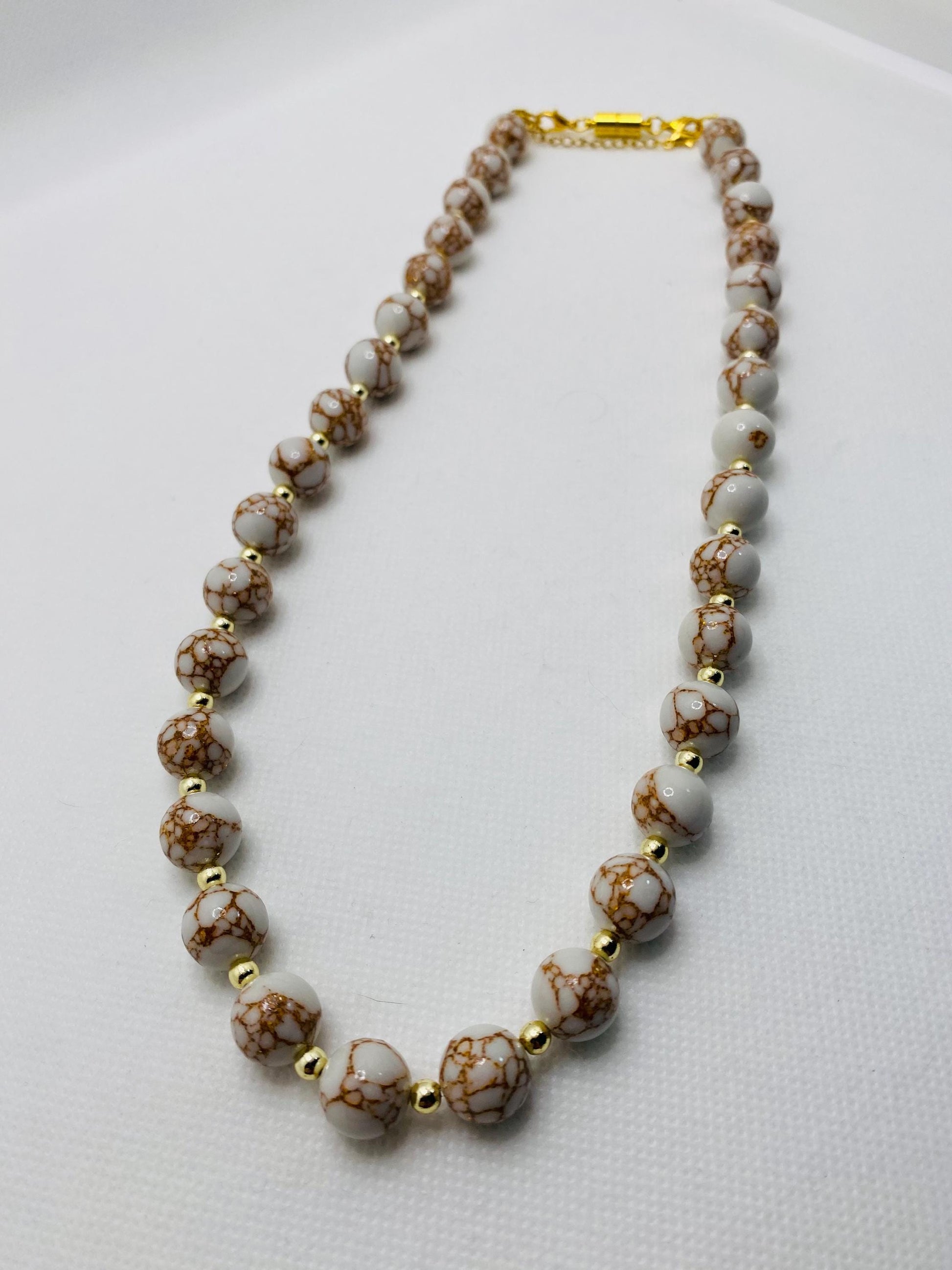 Elevate your jewelry collection with our stunning Howlite Gemstone Necklace, designed for those who appreciate the beauty of natural stones. This exquisite piece features 12mm natural white spun golden Howlite gemstone beads that create a soft, calming aura, perfect for everyday wear or special occasions. Each bead in this necklace tells a story, bringing a touch of elegance and tranquility to your ensemble. Complemented by 4mm gold-plated natural hematite gemstones, this necklace not only stands out visually but also offers a unique blend of style and sophistication. The gold hematite adds a shimmering contrast that beautifully highlights the creamy tones of the Howlite, making it a versatile accessory that pairs well with both casual and formal outfits. Embrace the power of natural gemstones while making a fashion statement. Treat yourself or surprise a loved one with this enchanting necklace. Don't miss out on the chance to own a piece that captures the essence of elegance—order your Howlite Gemstone Necklace today and let your style shine!