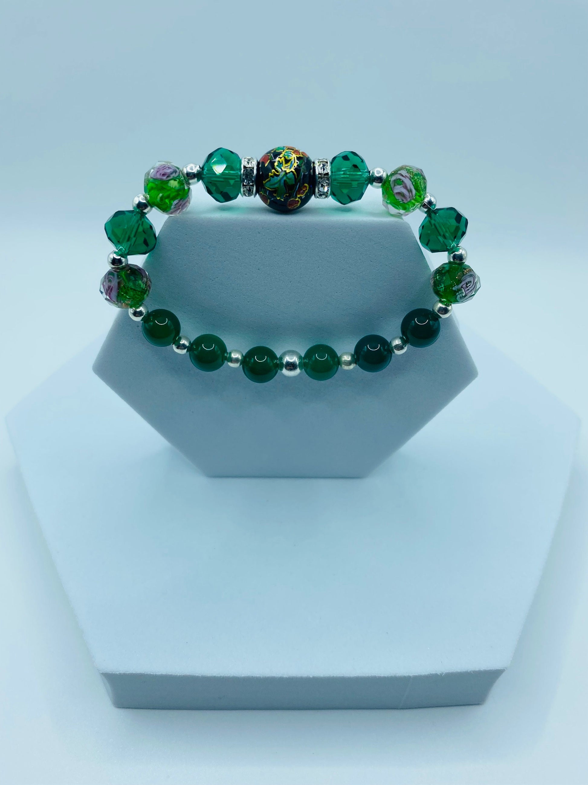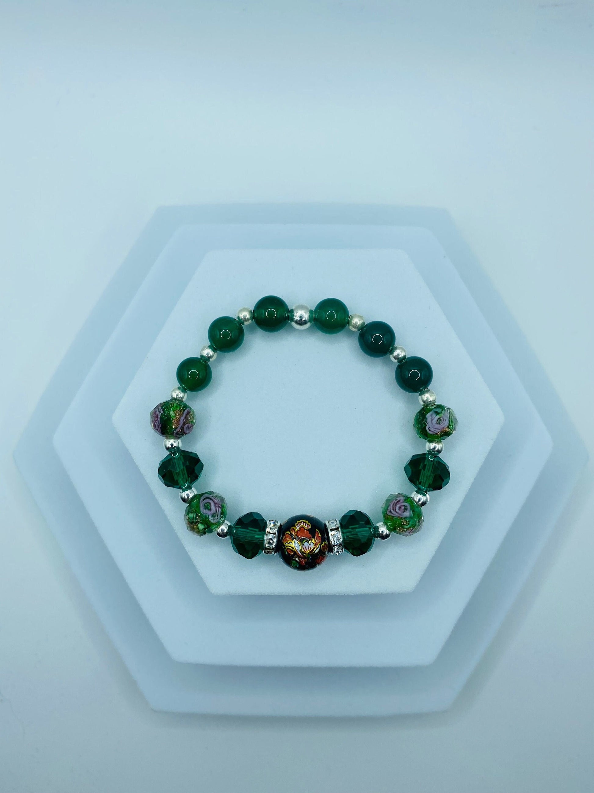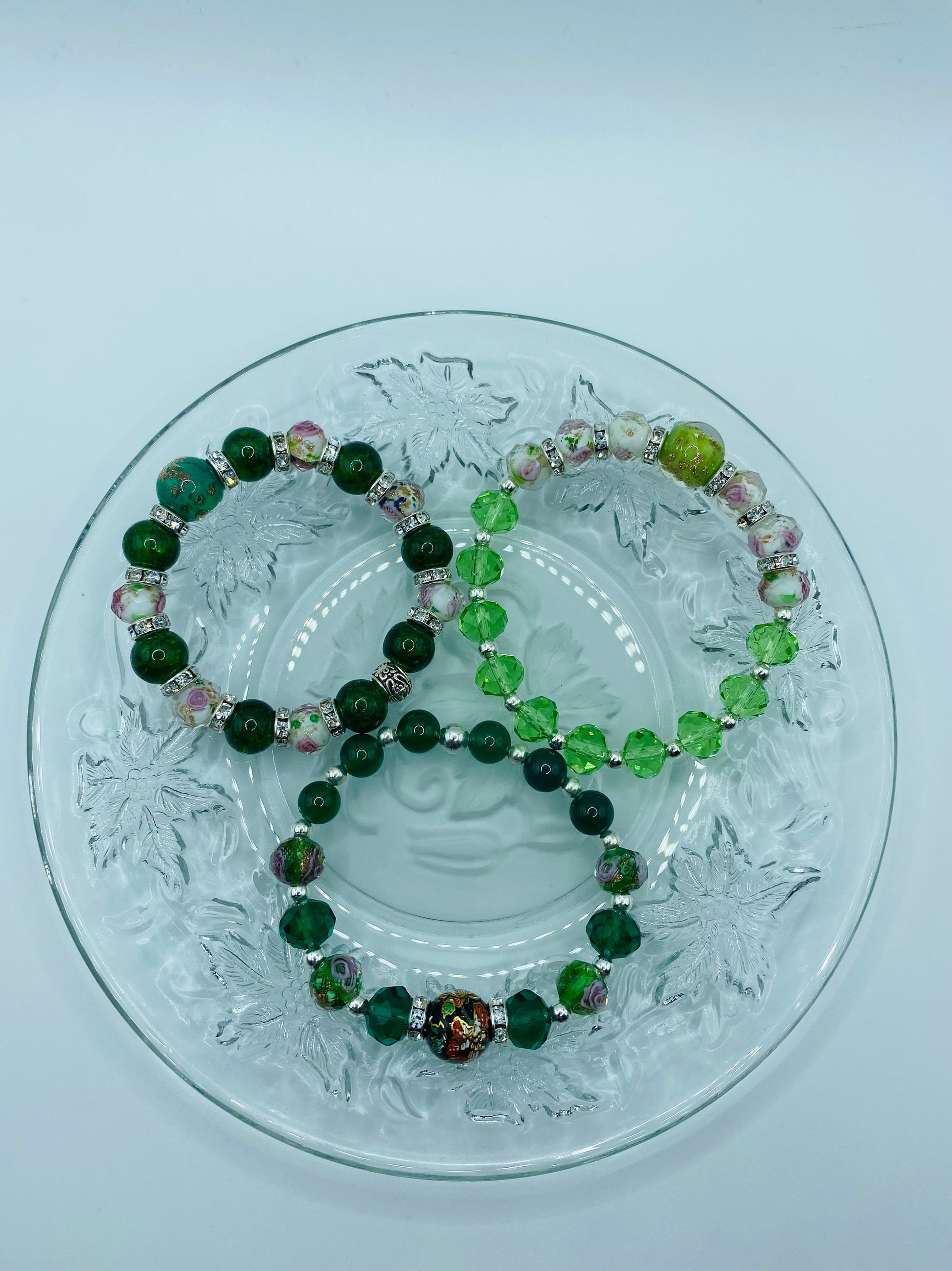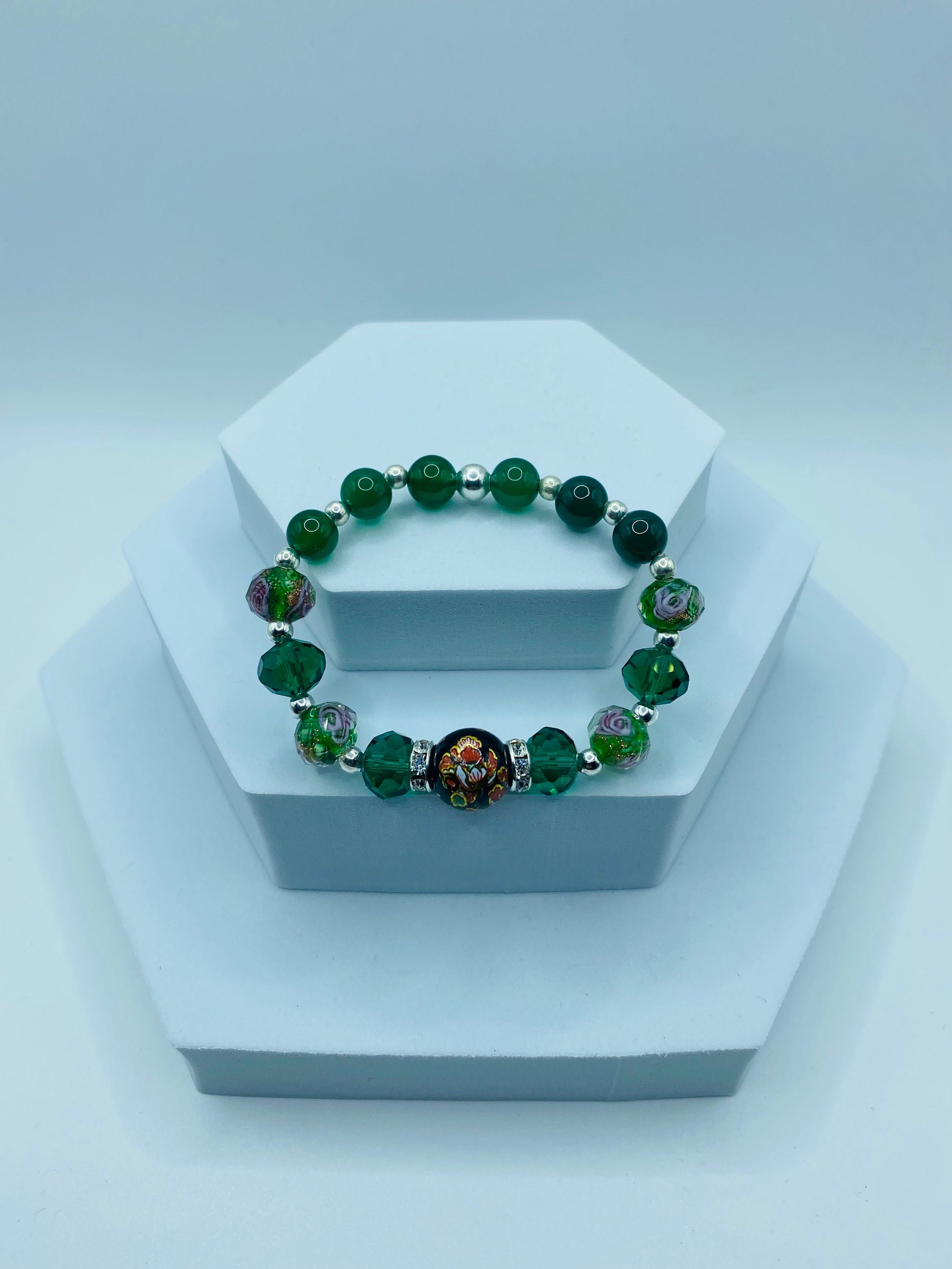 PRODUCT DETAILS - 12mm transparent black goldleaf painted floral glass beads - 10mm emerald, green crystal glass faced beads - 10mm green lampwork gold sand floral glass beads - 8mm natural green jade gemstone beads - 3mm silver plate Hematite beads - Silver plated rondelles with rhinestones - Strong, stretchy cord - Handmade in a clean and safe environment