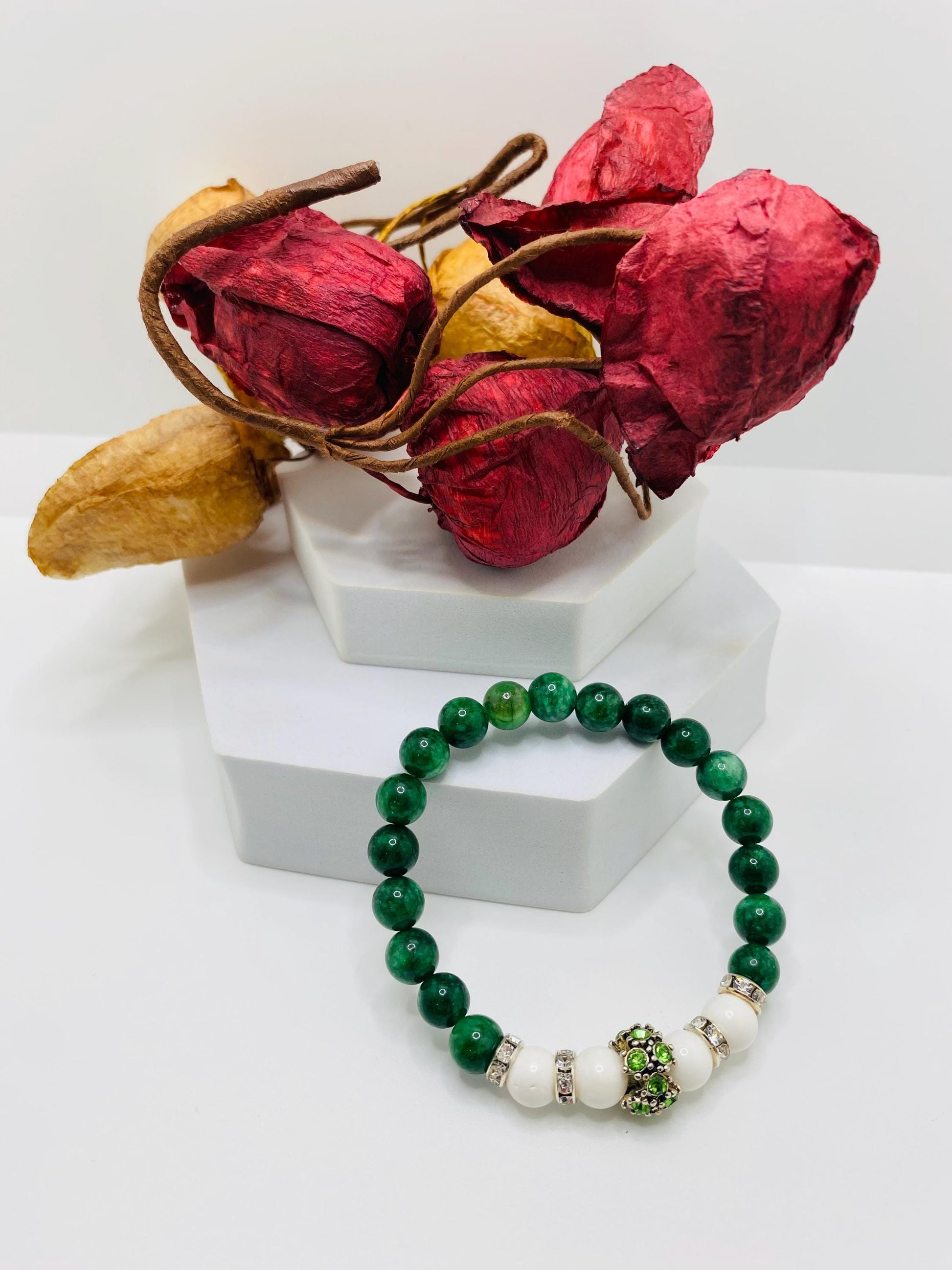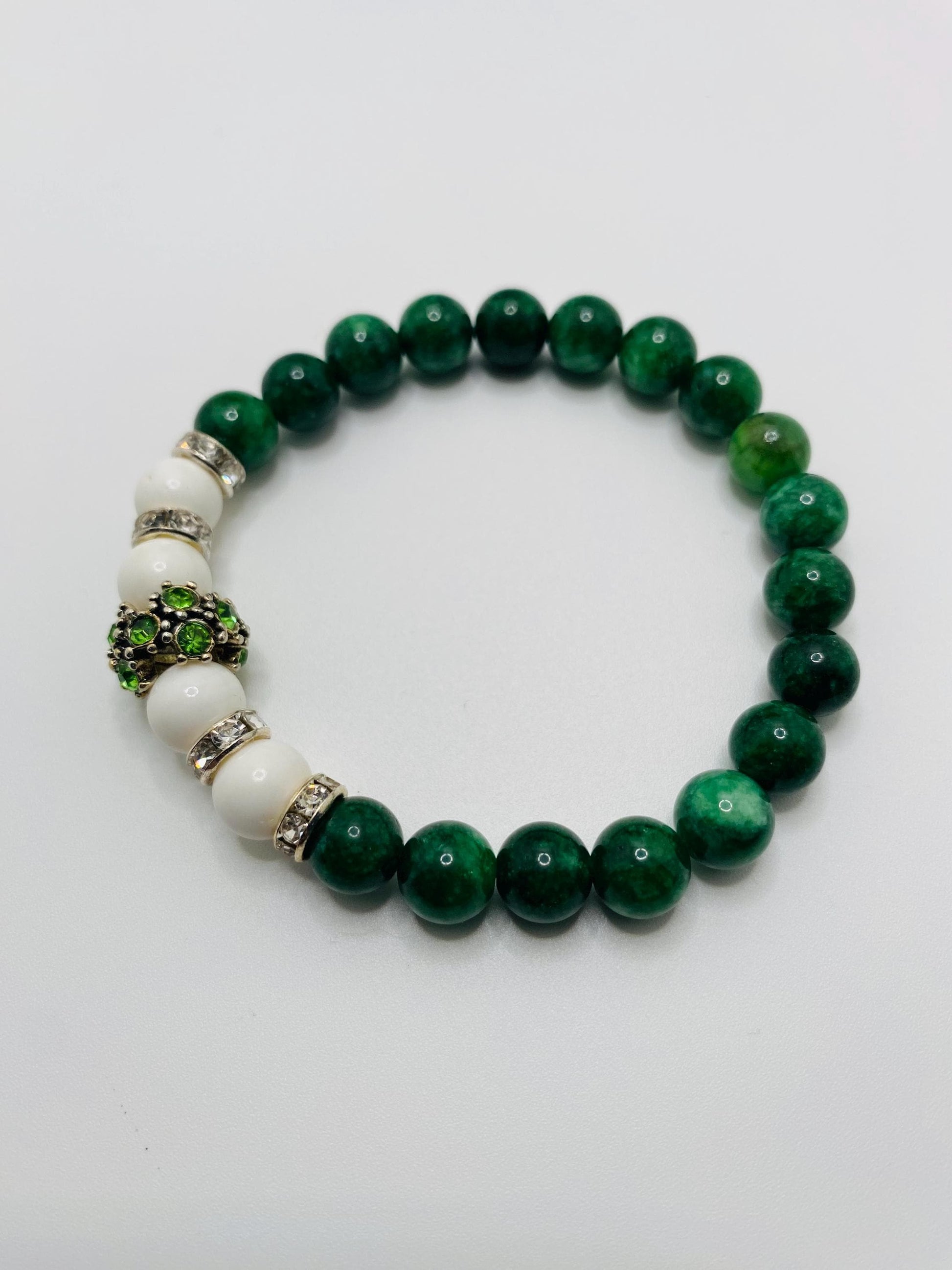 Product Info: : 8mm Green Jade Gemstone Beads : 8mm White Agate Gemstone Beads : 12mm Silver Metal Alloy Charm Bead with Green Rhinestone Crystals : 8mm Silverplated Rondelle rhinestone spacers : Elastic Stretchy Cord Heavy Duty : 100% Handmade