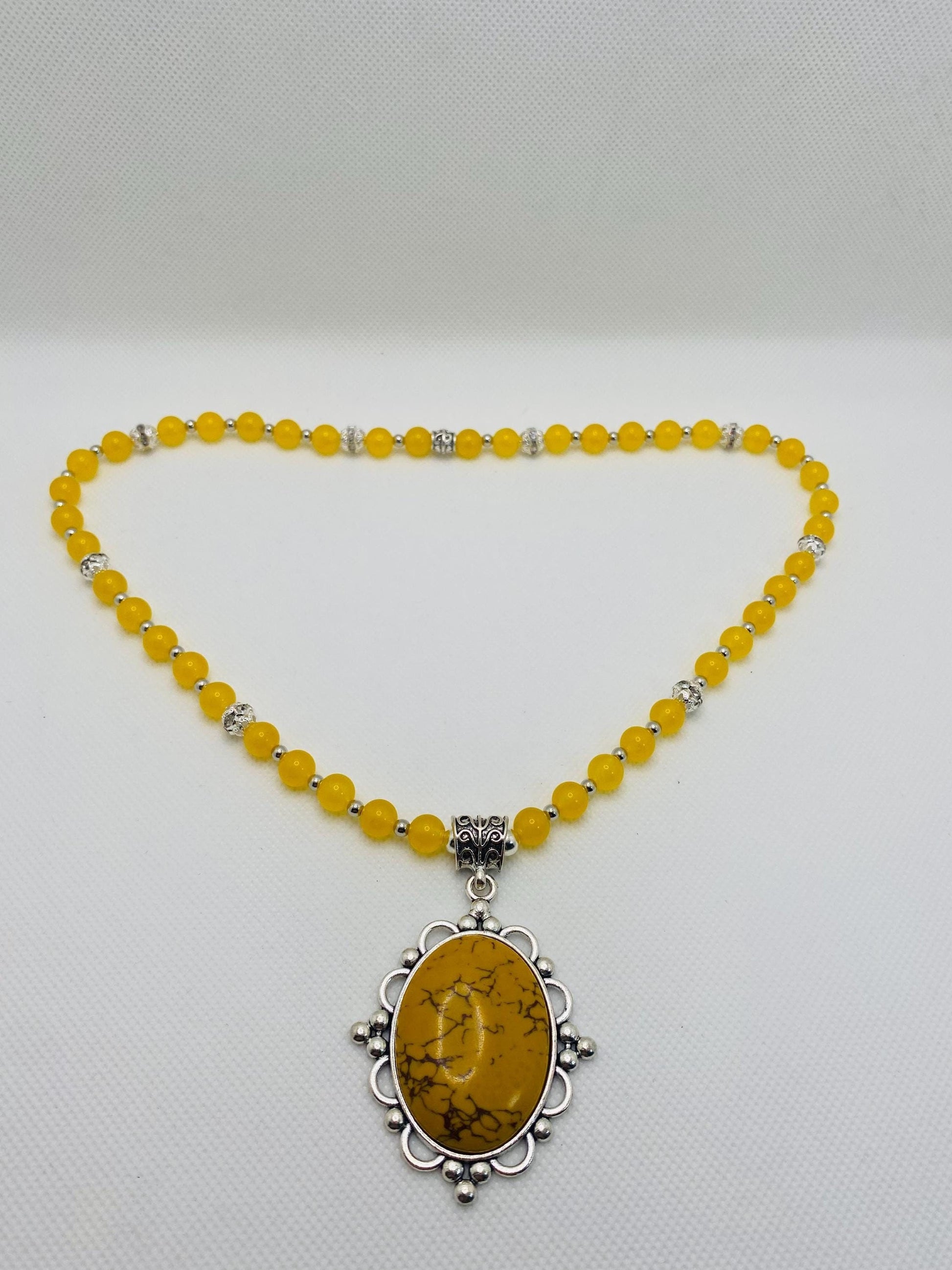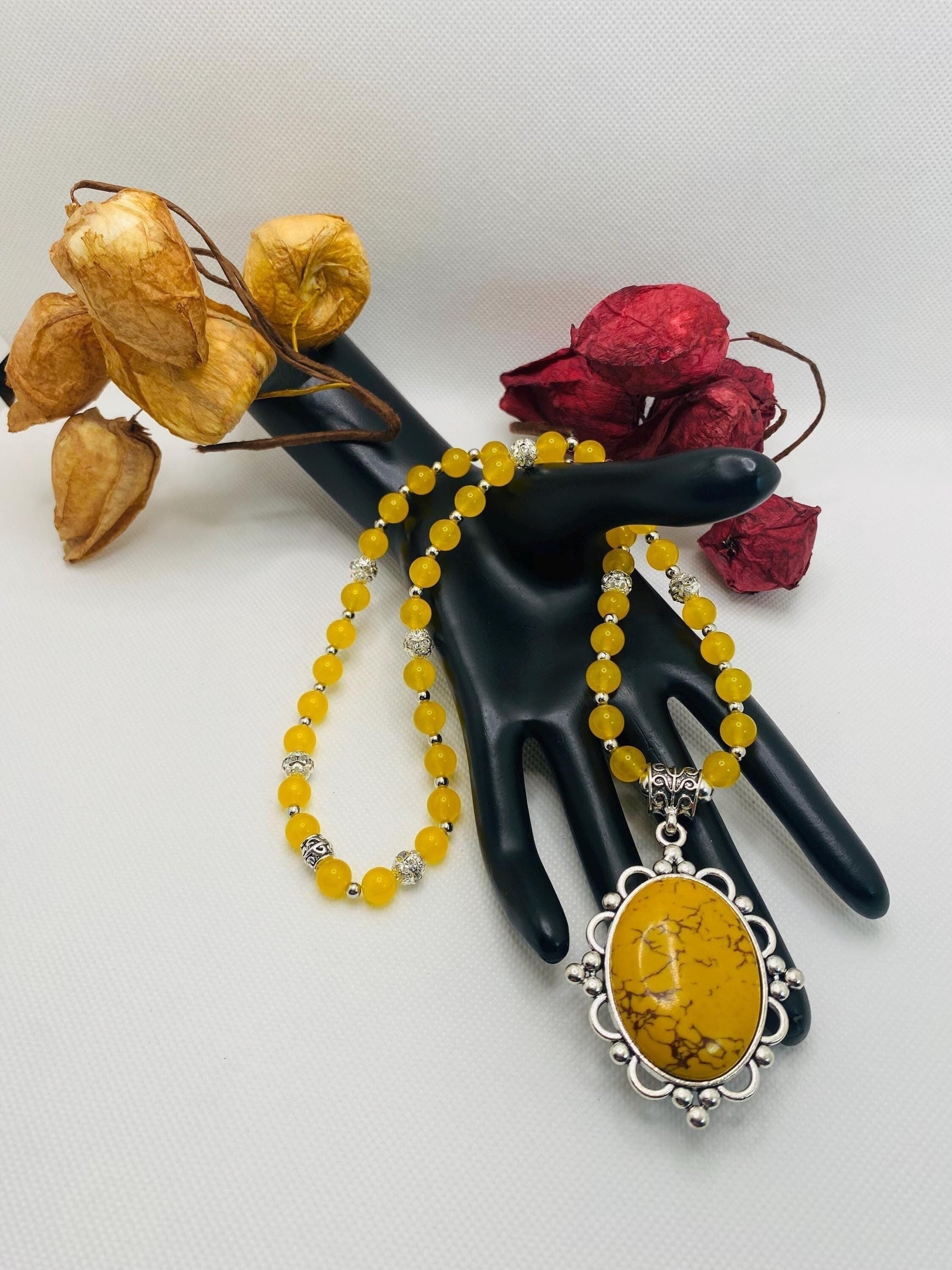 PRODUCT DETAILS - 7cmx5cm Antique Silver Synthetic Yellow Turquoise Cabochon Pendant - 8mm Natural Yellow Jade gemstone beads - 4mm Silverplated Natural Hematite Gemstone Beads - 8mm Silverplated Round Hollow Beads with Sparkling Rhinestones - Strong, stretchy cord - Handmade in a clean and safe environment