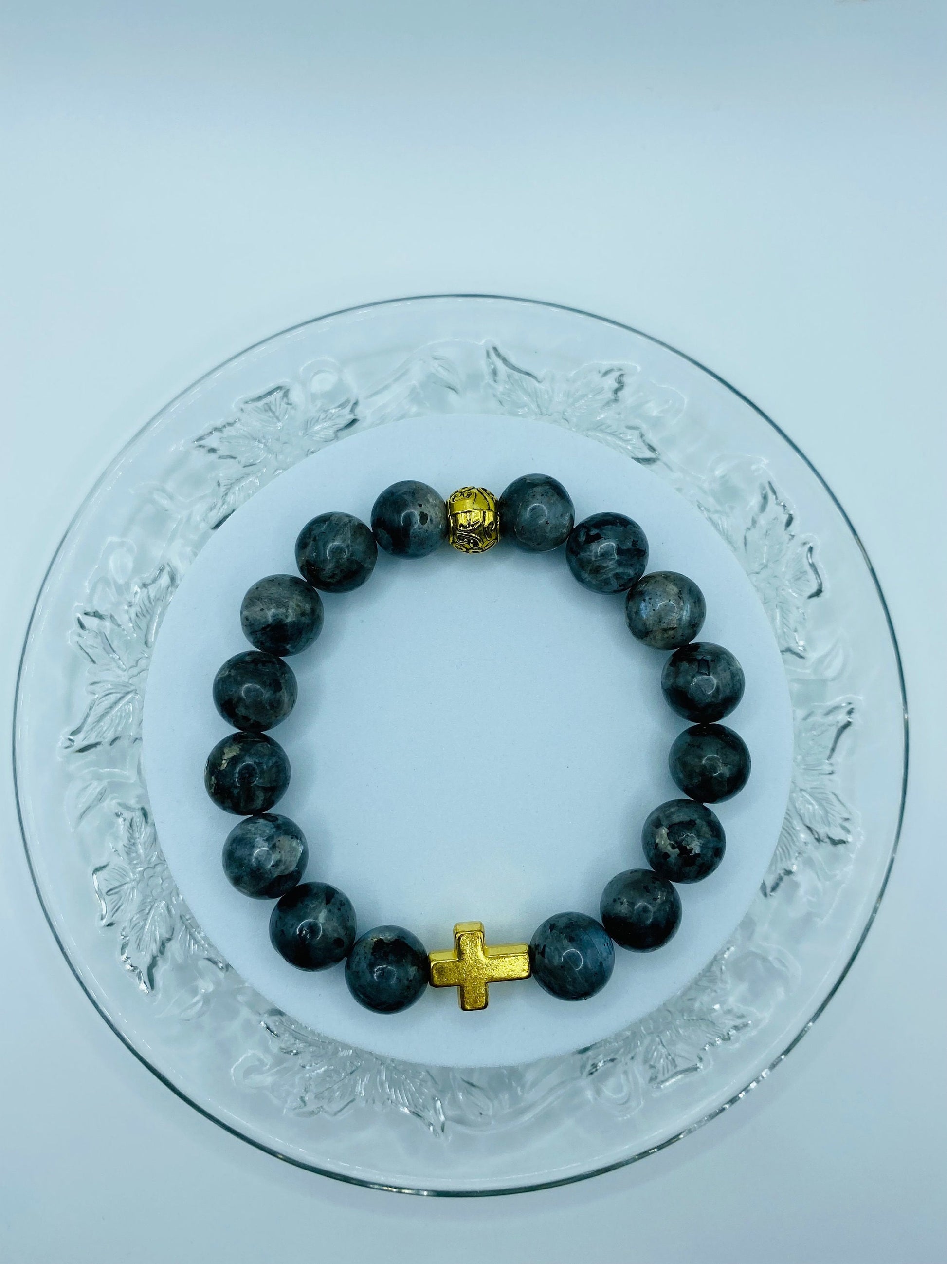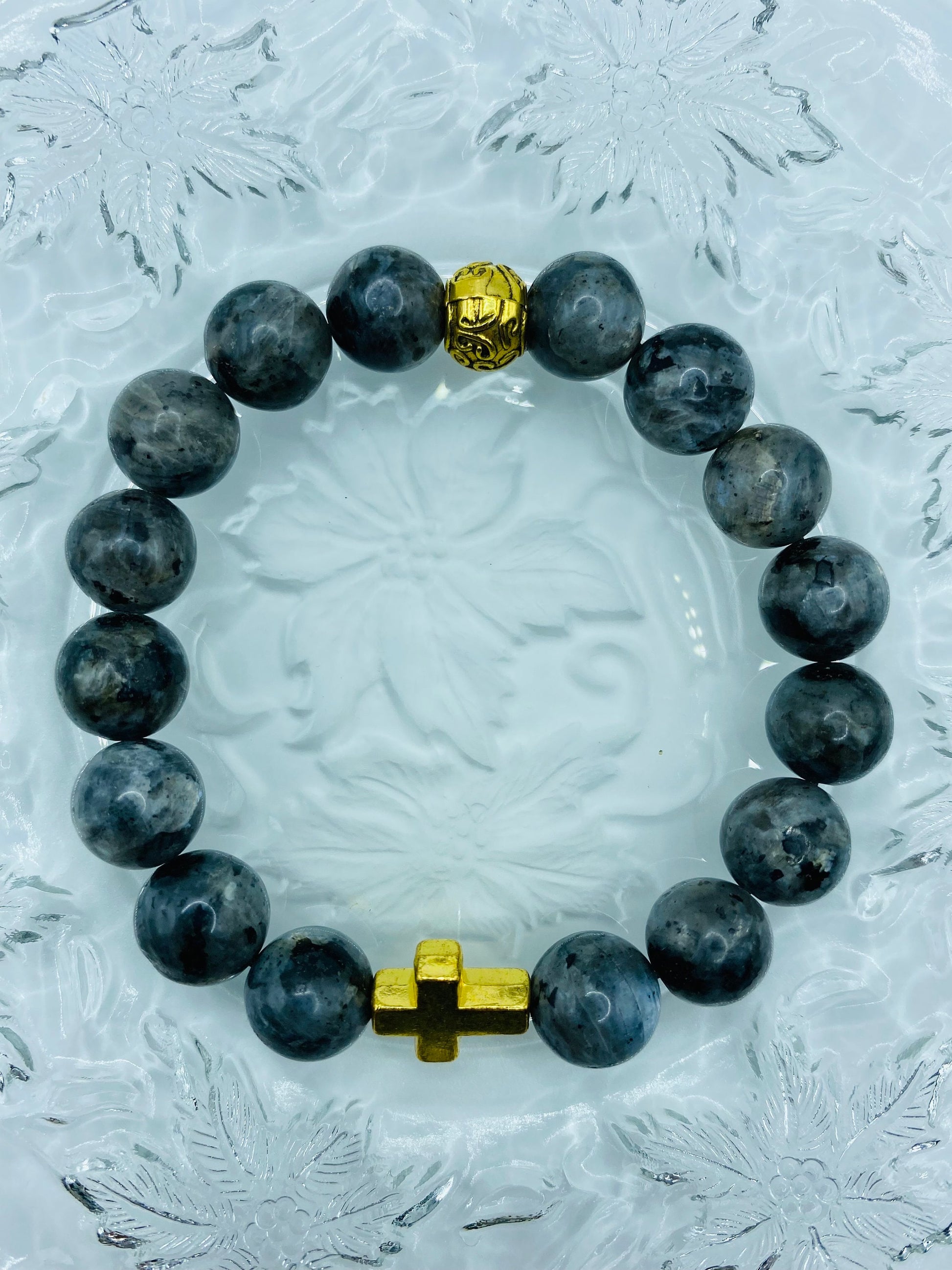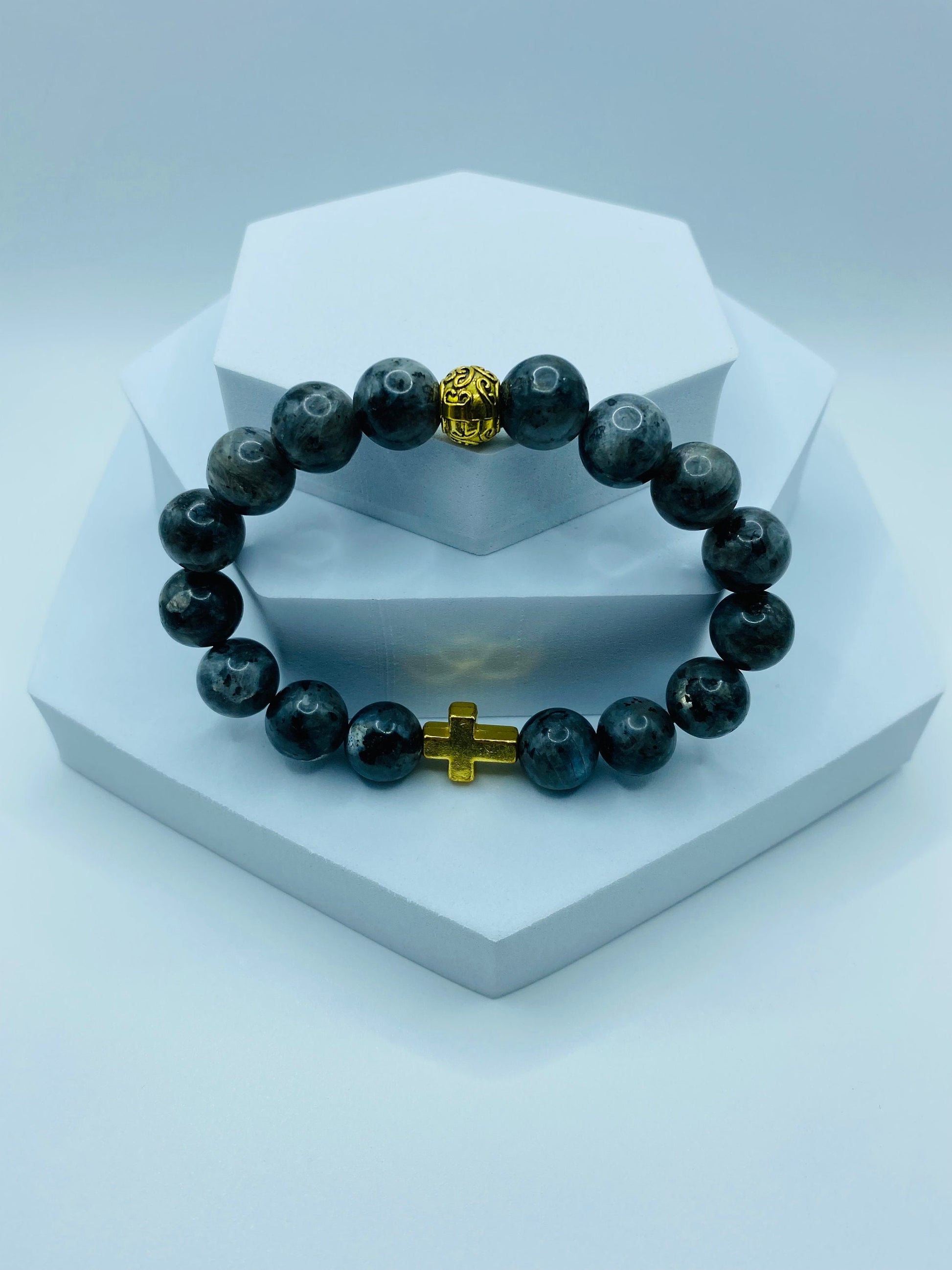 PRODUCT DETAILS - Chunky blackish religious cross bracelet - 12mm labradorite natural gemstone beads - Antique gold 14x12mm cross - 8mm antique gold Tibetan bead spacer - Strong, stretchy cord - Handmade in a clean and safe environment