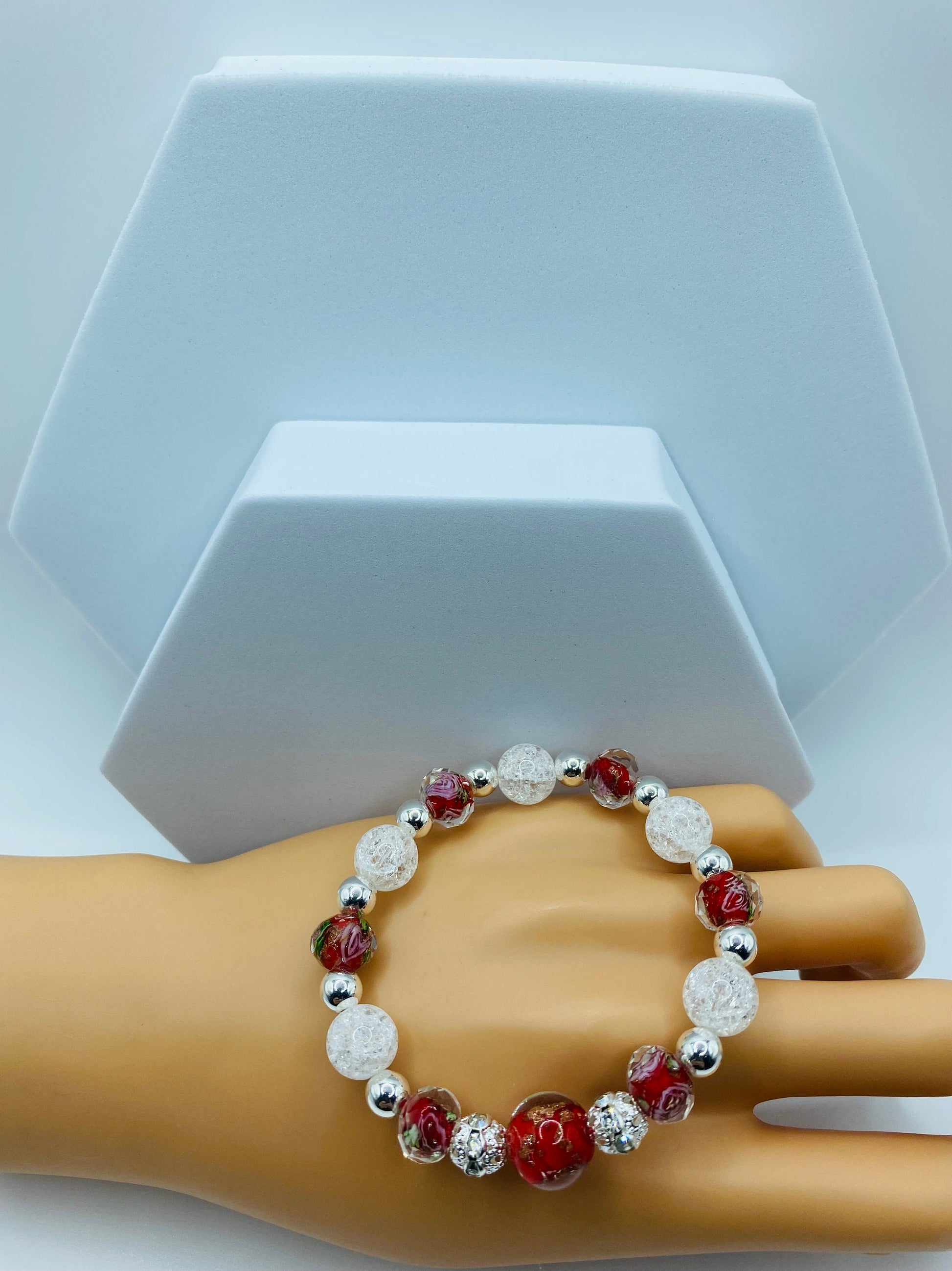 PRODUCT DETAIL - 12mm red lampwork gold sand glass bead - 10mm white crystal crackle quartz gemstone beads - 10mm red lampwork gold sand floral glass beads - 8mm silver plated round hollow beads with sparkling rhinestones - 4mm silver plated Hematite beads - silver plated rondelles with rhinestone crystals - Strong, stretchy cord - Handmade in a clean and safe environment