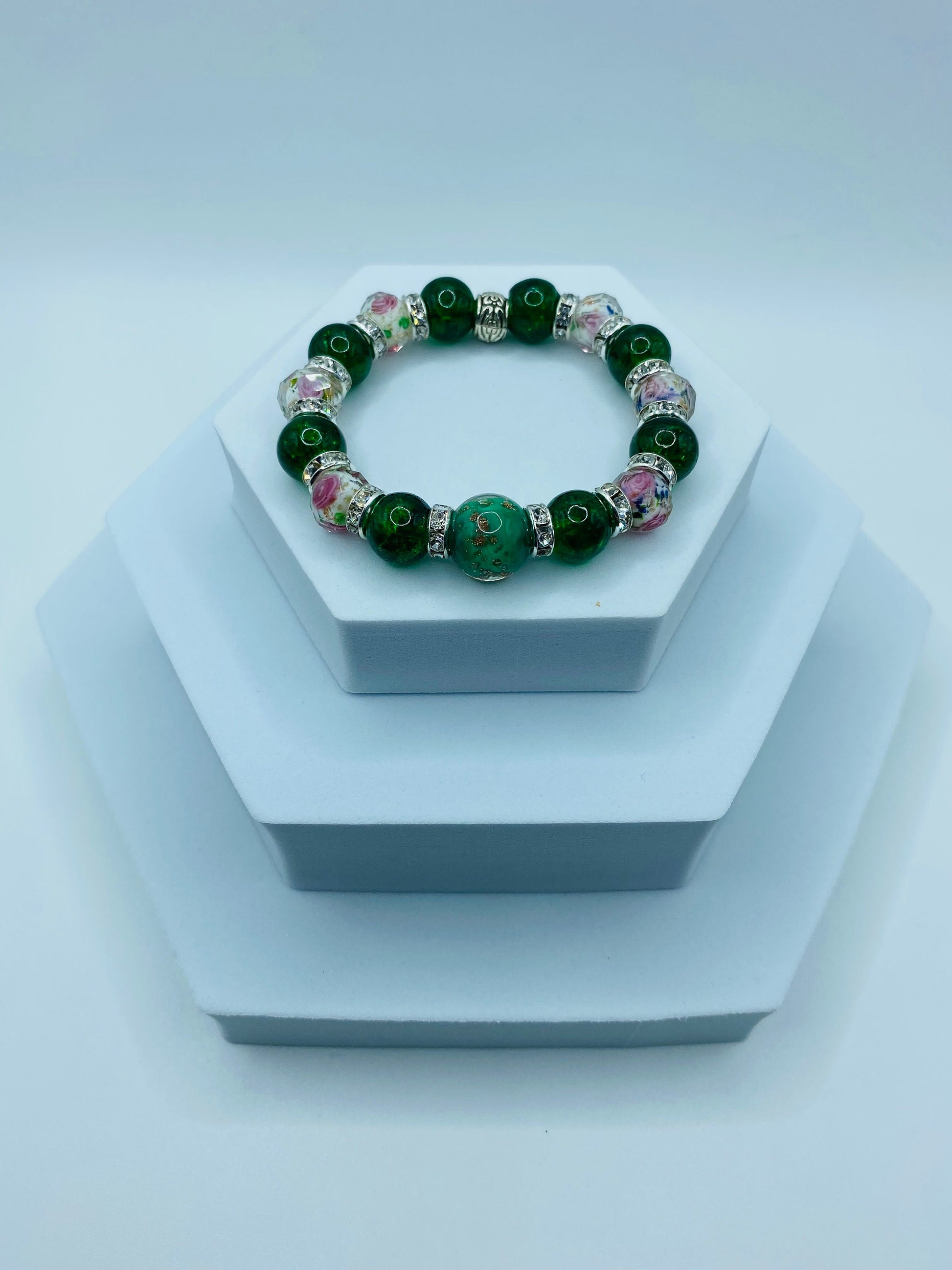 PRODUCT DETAIL - 12mm green gold sand lampwork glass bead - 10mm green crackle lampwork glass bead - 10mm pink lampwork gold sand floral glass beads - 8mm antique silver Tibetan spacer bead - silver plated rondelles with rhinestone crystals - Strong, stretchy cord - Handmade in a clean and safe environment