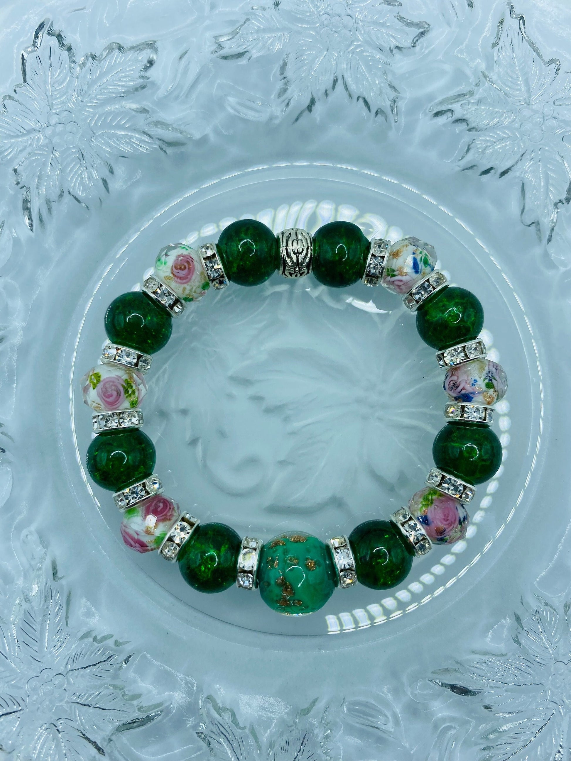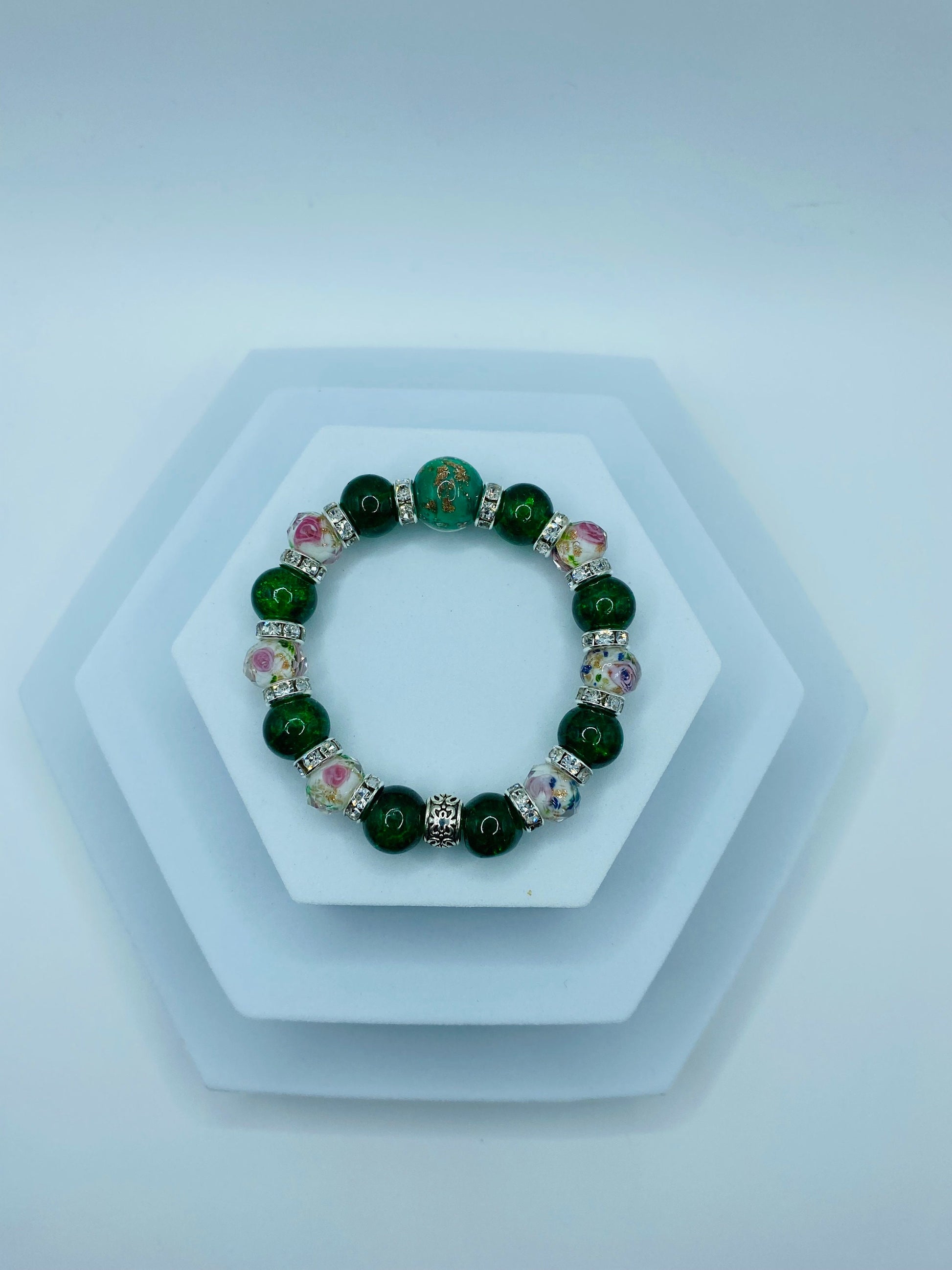Lampwork Flower Bead Bracelet: Green Crystal, Rhinestone Accent