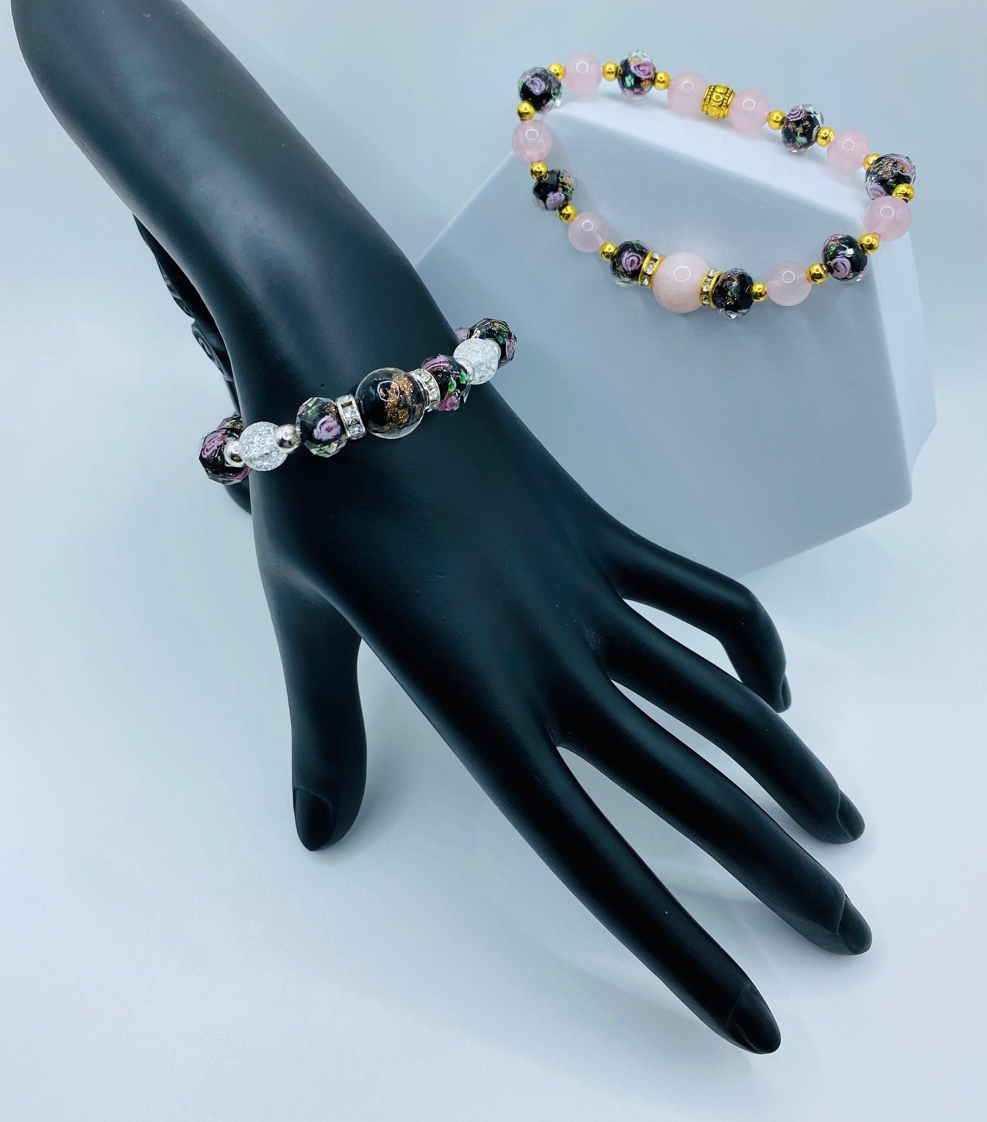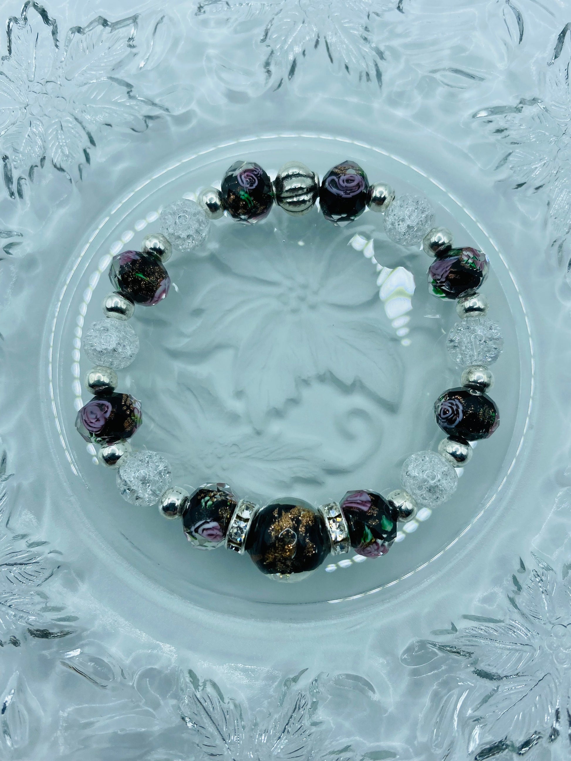 PRODUCT DETAILS - White crystal quartz black lampwork glass bracelet - 12mm black transparent lampwork gold sand glass bracelet - 10mm black lampwork floral gold sand faceted glass beads - 8mm white crystal crackle quartz gemstone beads - 3mm silver plated round spacer beads - Silver plated rondelles with rhinestone crystals - Strong, stretchy cord - Handmade in a clean and safe environment