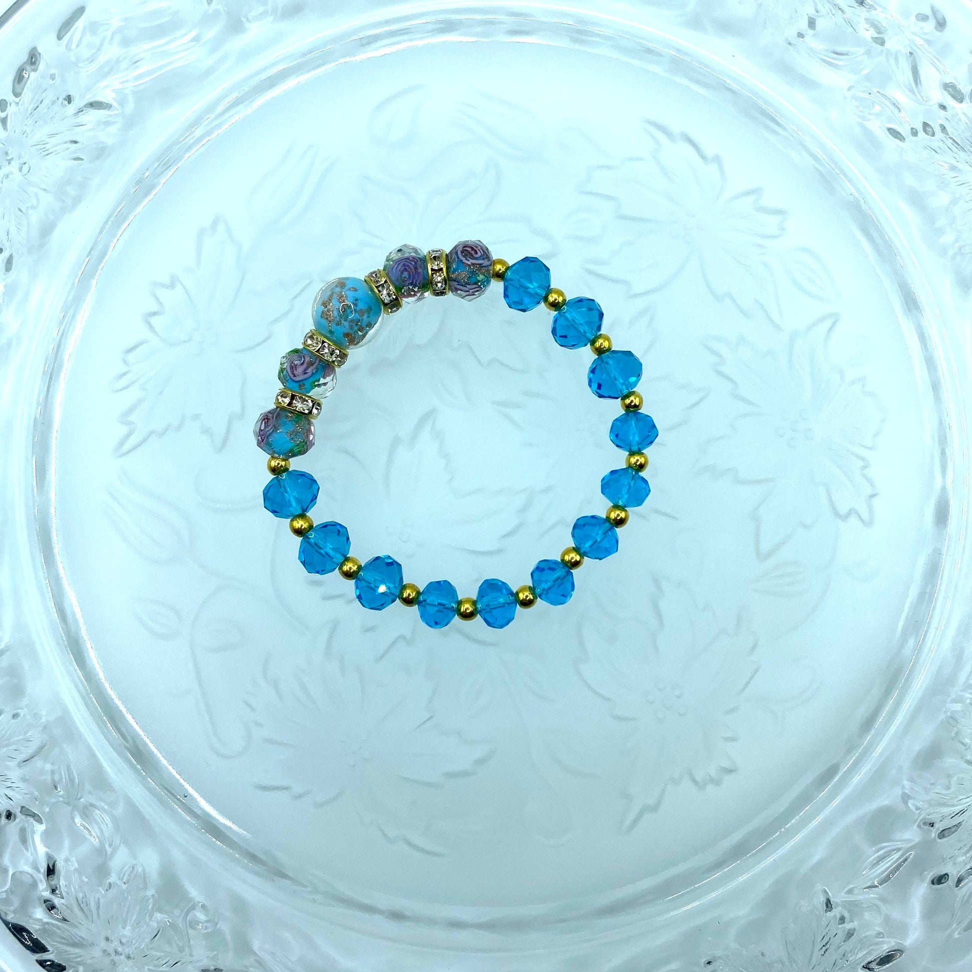Add a touch of elegance to your outfit with this stunning Lampwork Beads Bracelet. Featuring shimmering Blue Topaz Crystal Beads, delicate Flower Glass Beads, and accentuated with 18K gold Hematite Beads, this bracelet is a perfect combination of sophistication and charm. Handcrafted with care, this unique piece will be a beautiful addition to your jewelry collection. this one-of-a-kind bracelet is perfect for adding a pop of color and sophistication to any look.