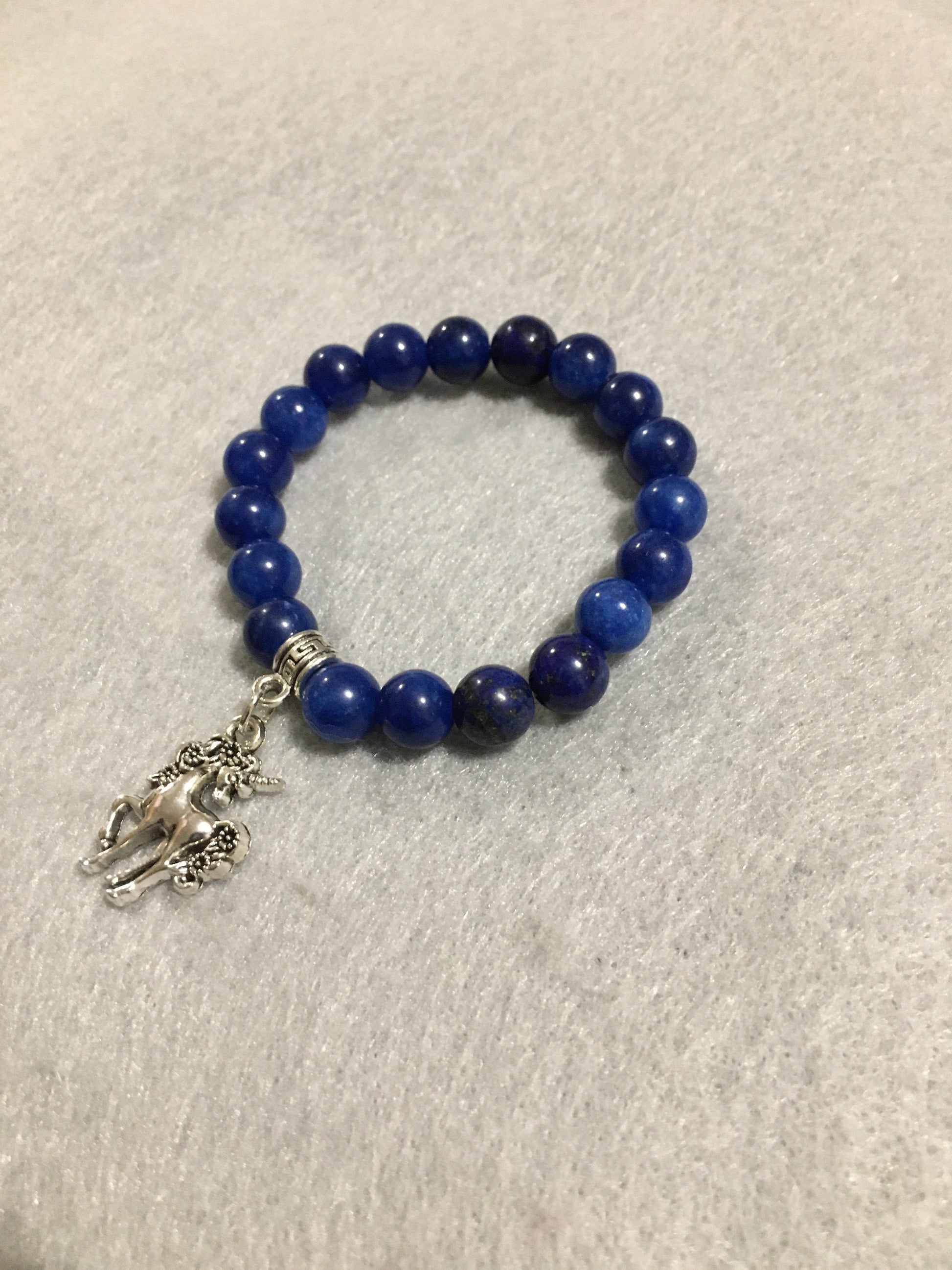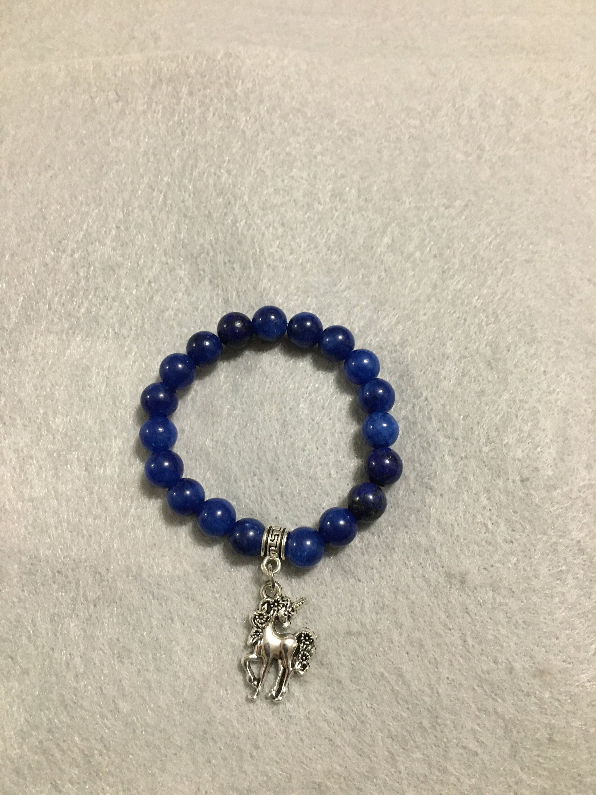 PRODUCT DETAILS - girl's unicorn charm bracelet - 8mm blue lapis lazuli gemstone beads - Antique silver bail charm holder - Antique silver unicorn charm - Strong, stretchy cord - Handmade in a clean and safe environment