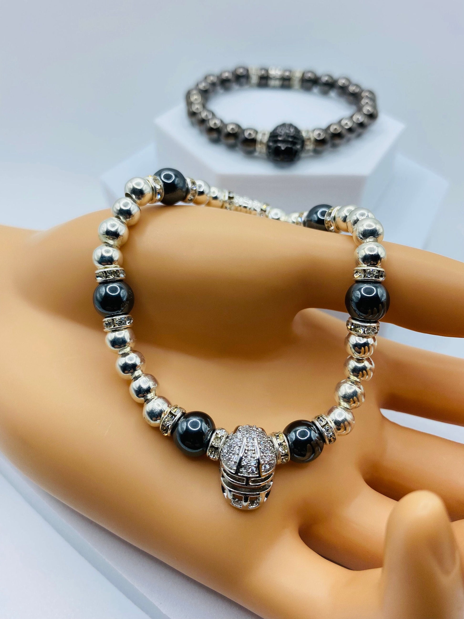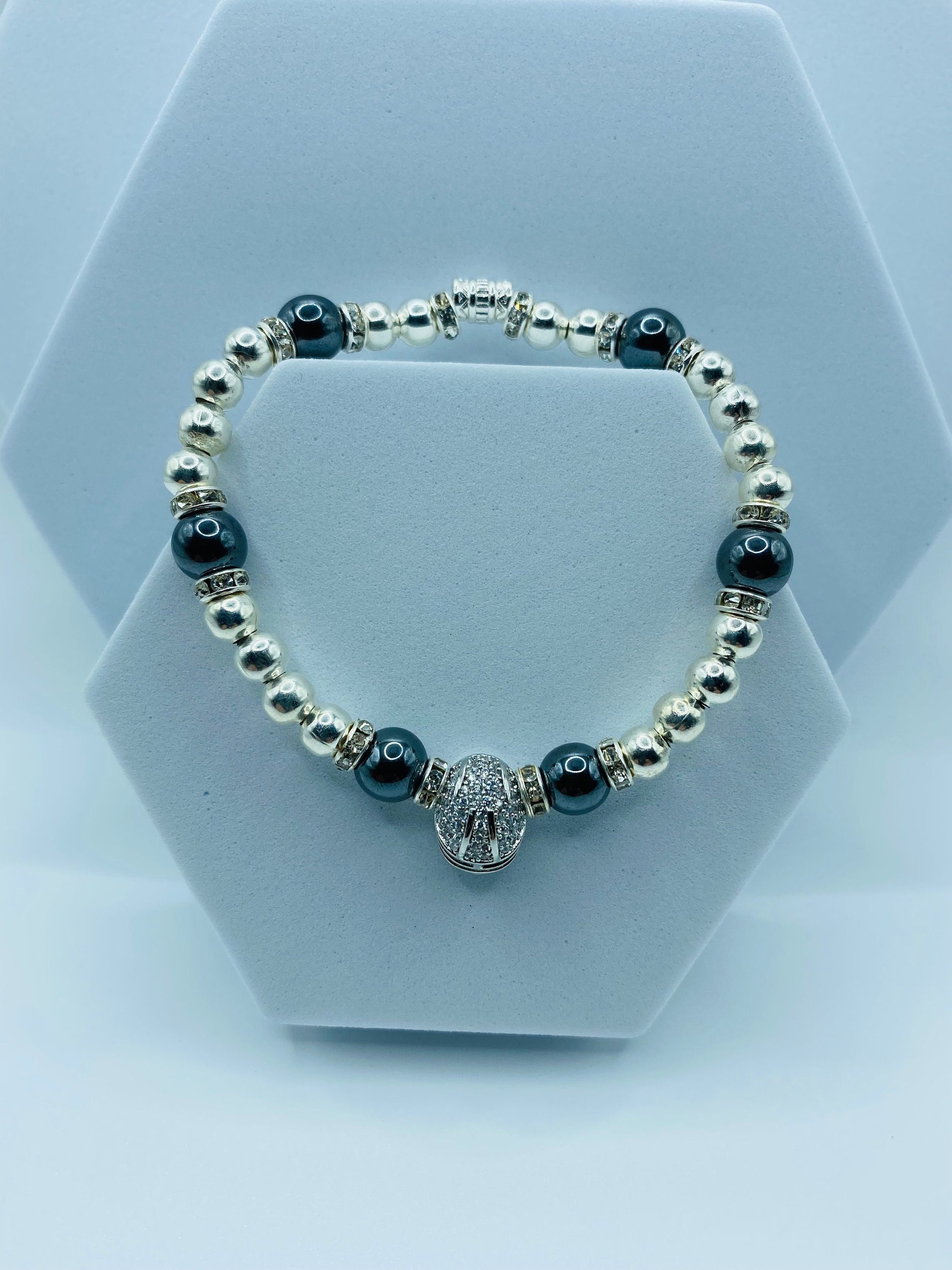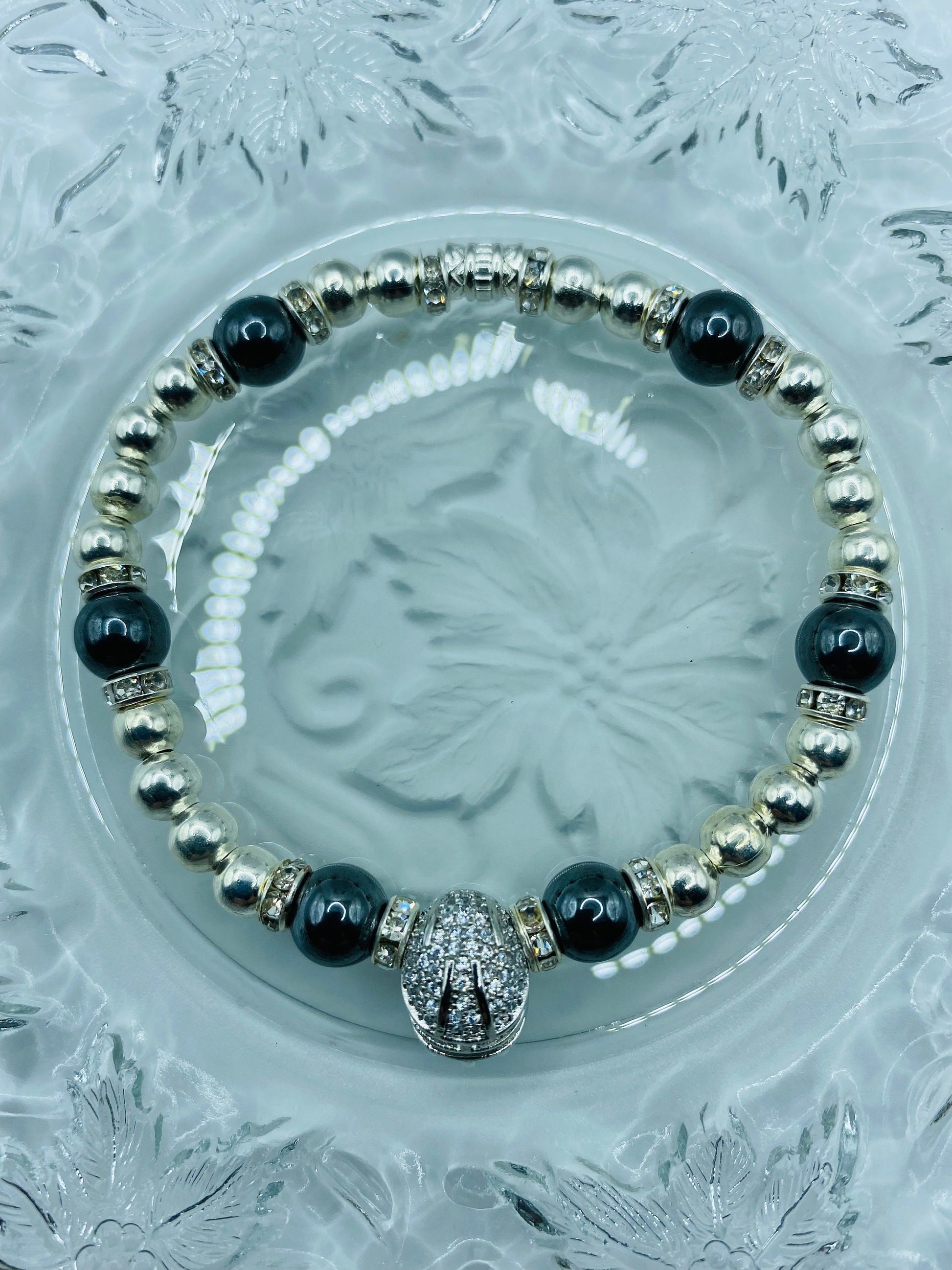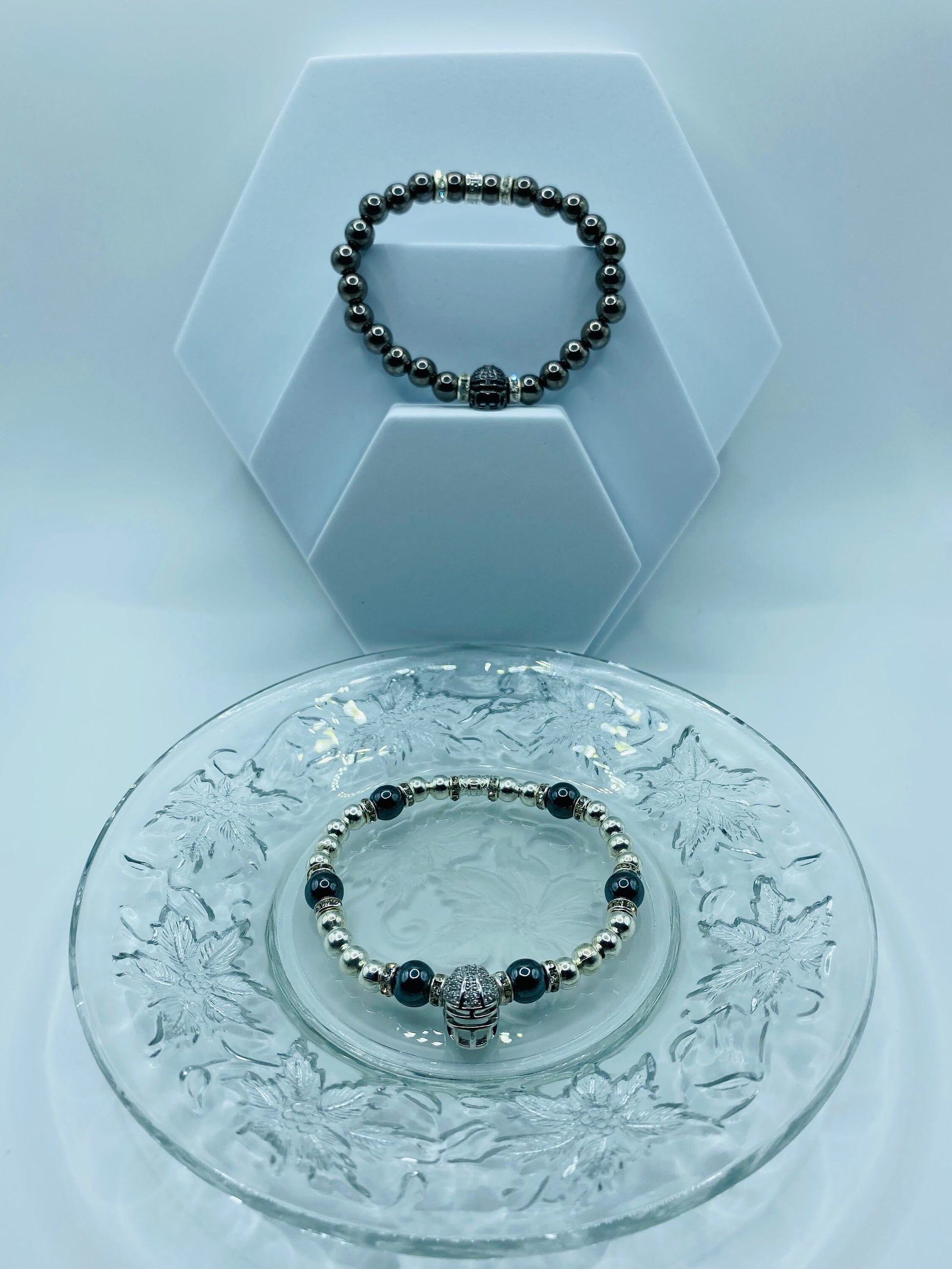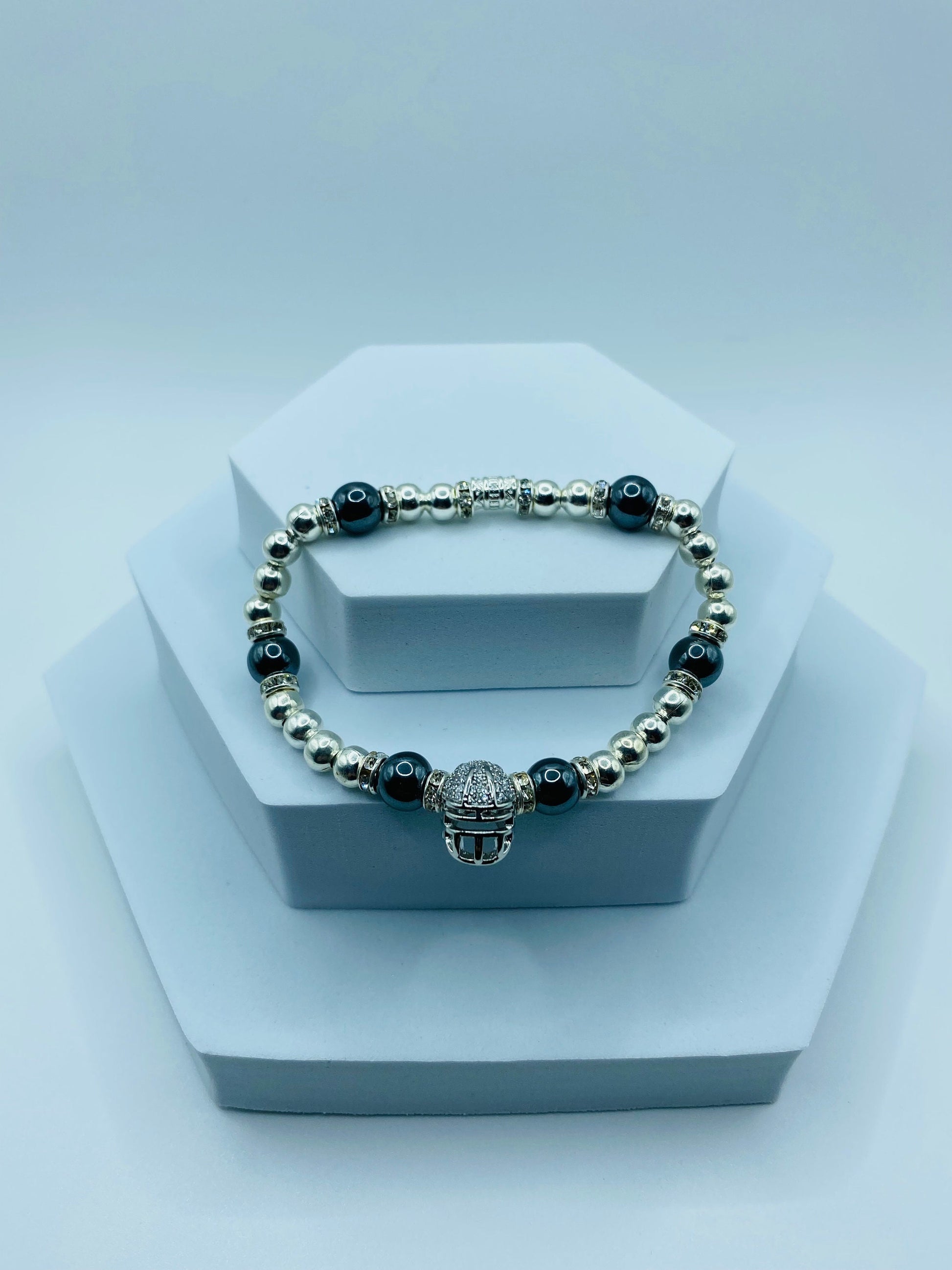 PRODUCT DETAILS - 8mm black hematite gemstone beads - 6mm silver plated hematite gemstone beads - 6mm silver plated rondelles with sparkling rhinestones - Metallic silver-plated football helmet with inlaid cubic zirconia - Strong, stretchy cord - Handmade in a clean and safe environment