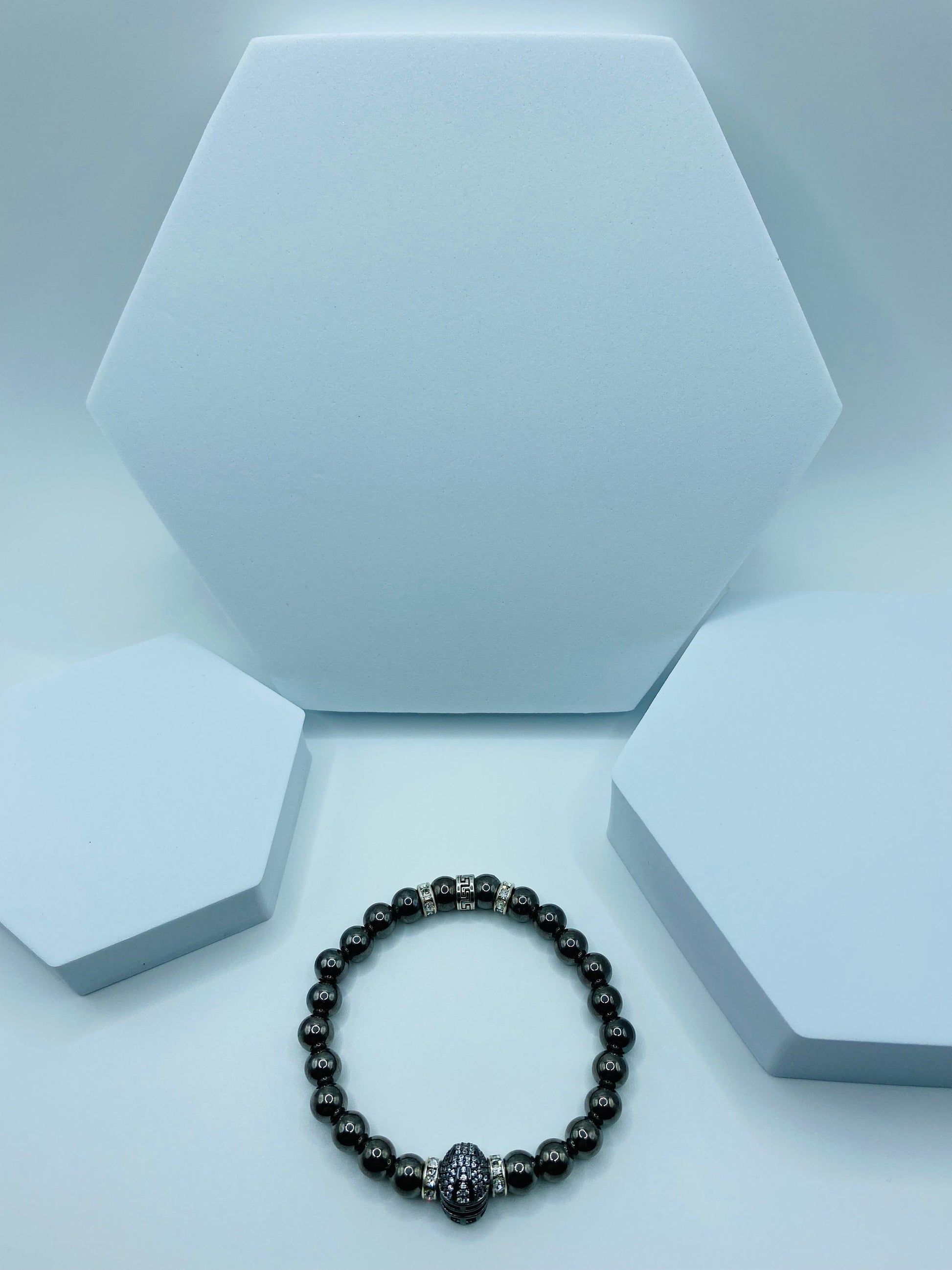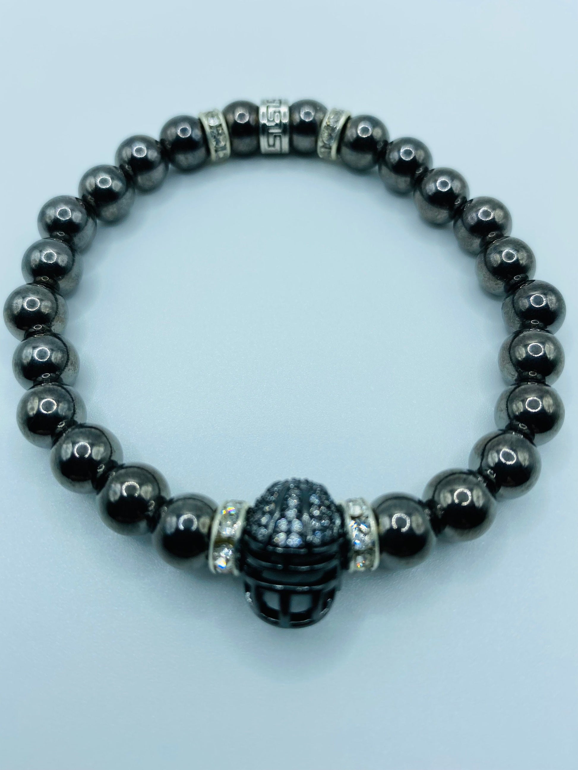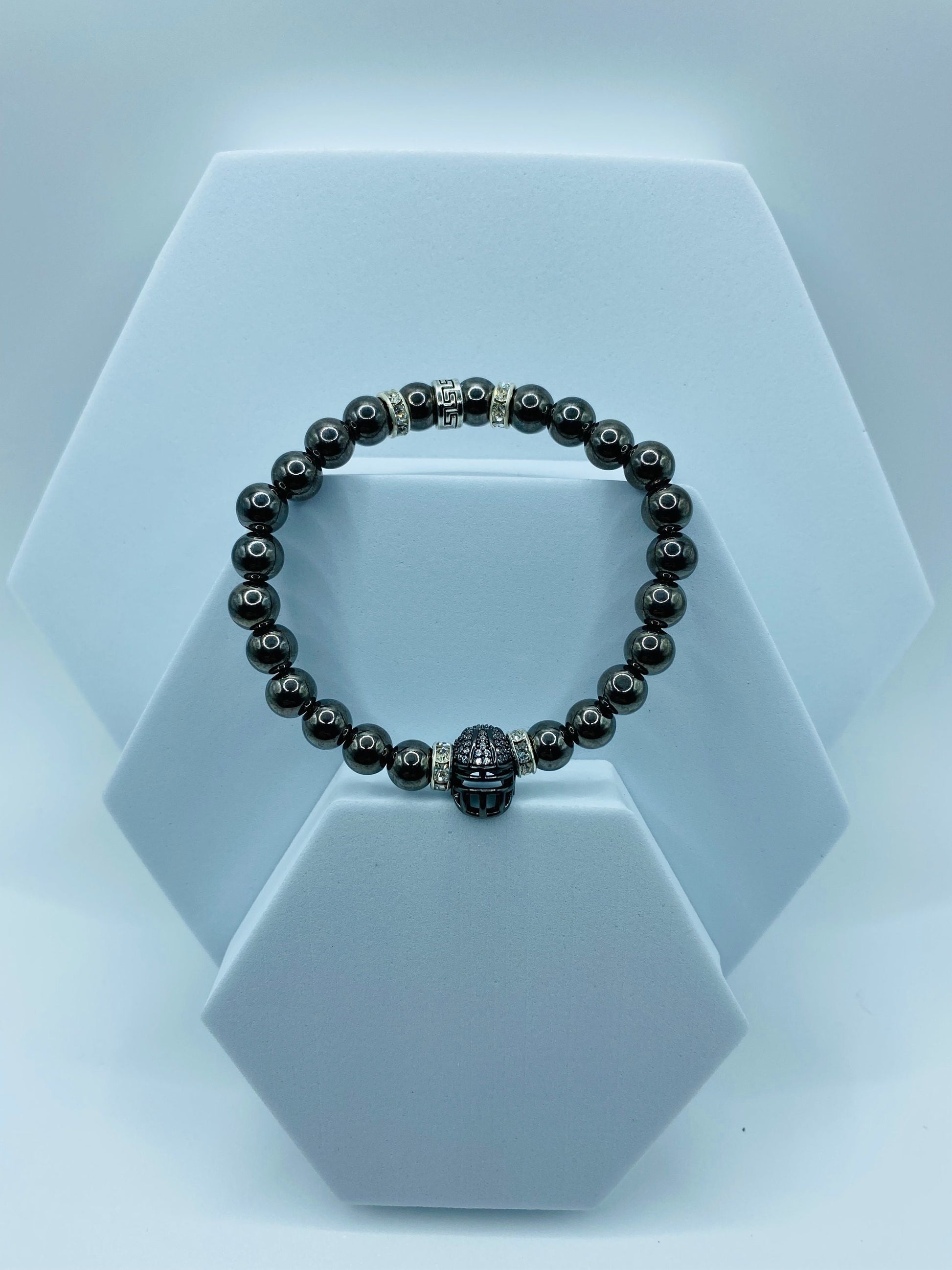 PRODUCT DETAILS - 8mm black natural hematite gemstone beads - Tibetan antique silver tube spacer - Metallic gun metal-plated football helmet with inlaid cubic zirconia - 8mm silver plated rondelles with rhinestones - Strong, stretchy cord - Handmade in a clean and safe environment