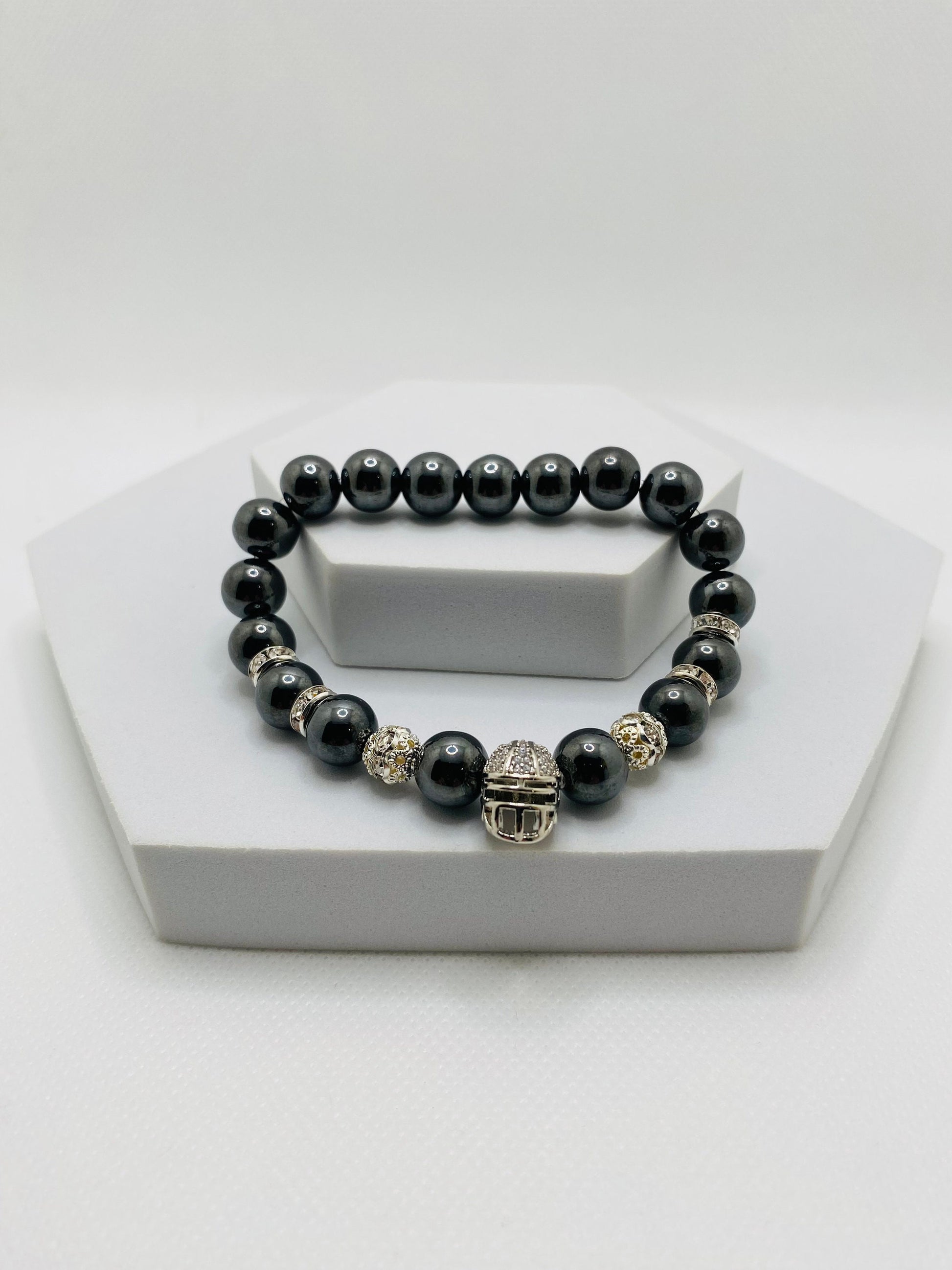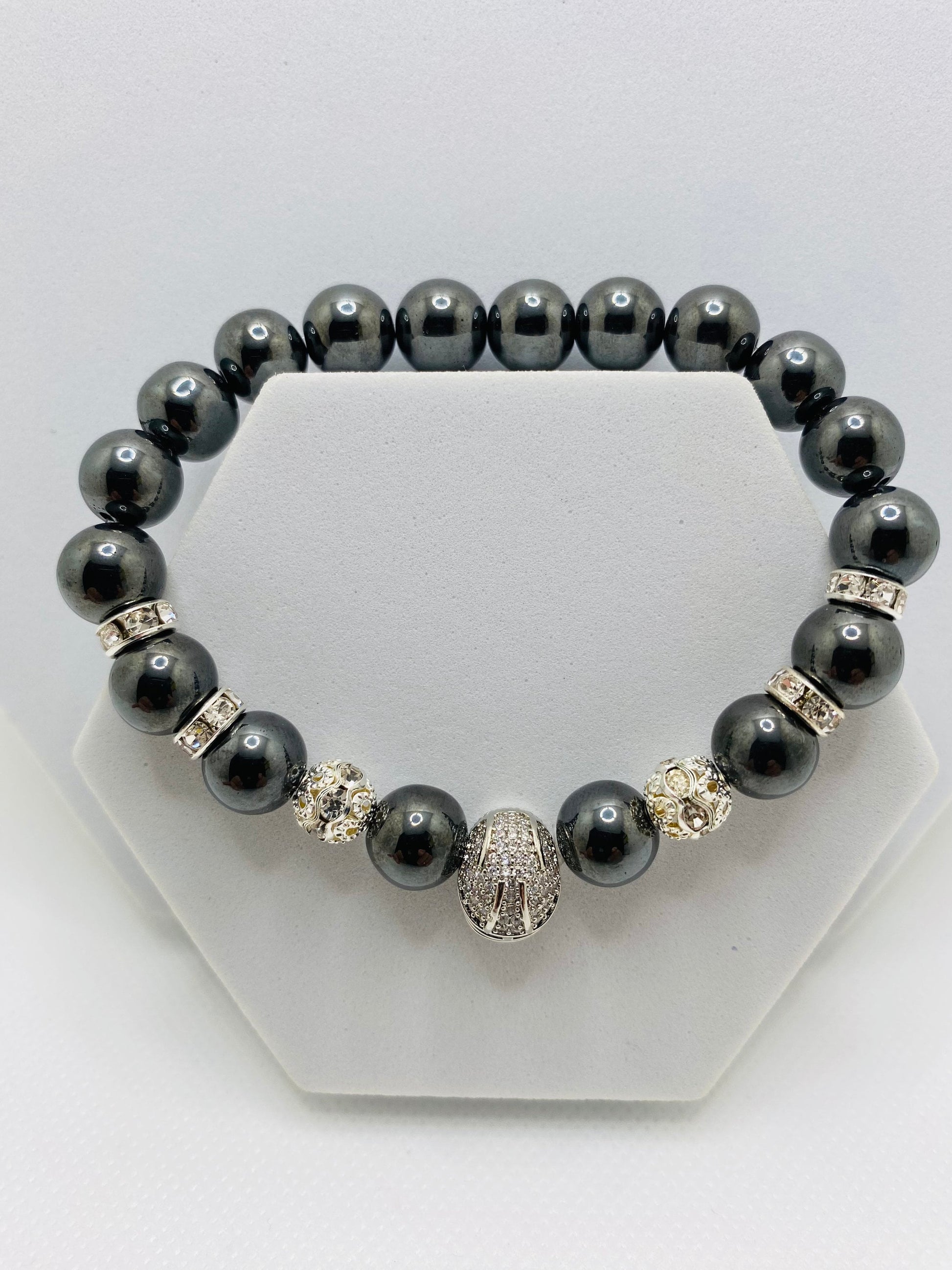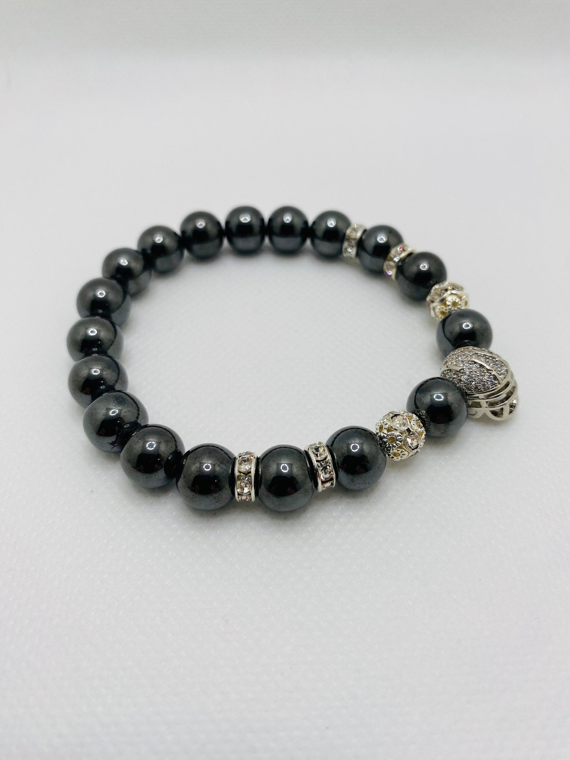 PRODUCT DETAILS - 10mm black hematite gemstone beads - 8mm Silver plated CZ Spacer beads - Silver plated Rondelles with Rhinestones - Silver Plated Metallic helmet with inlaid cubic zirconia - Strong, stretchy cord - Handmade in a clean and safe environment