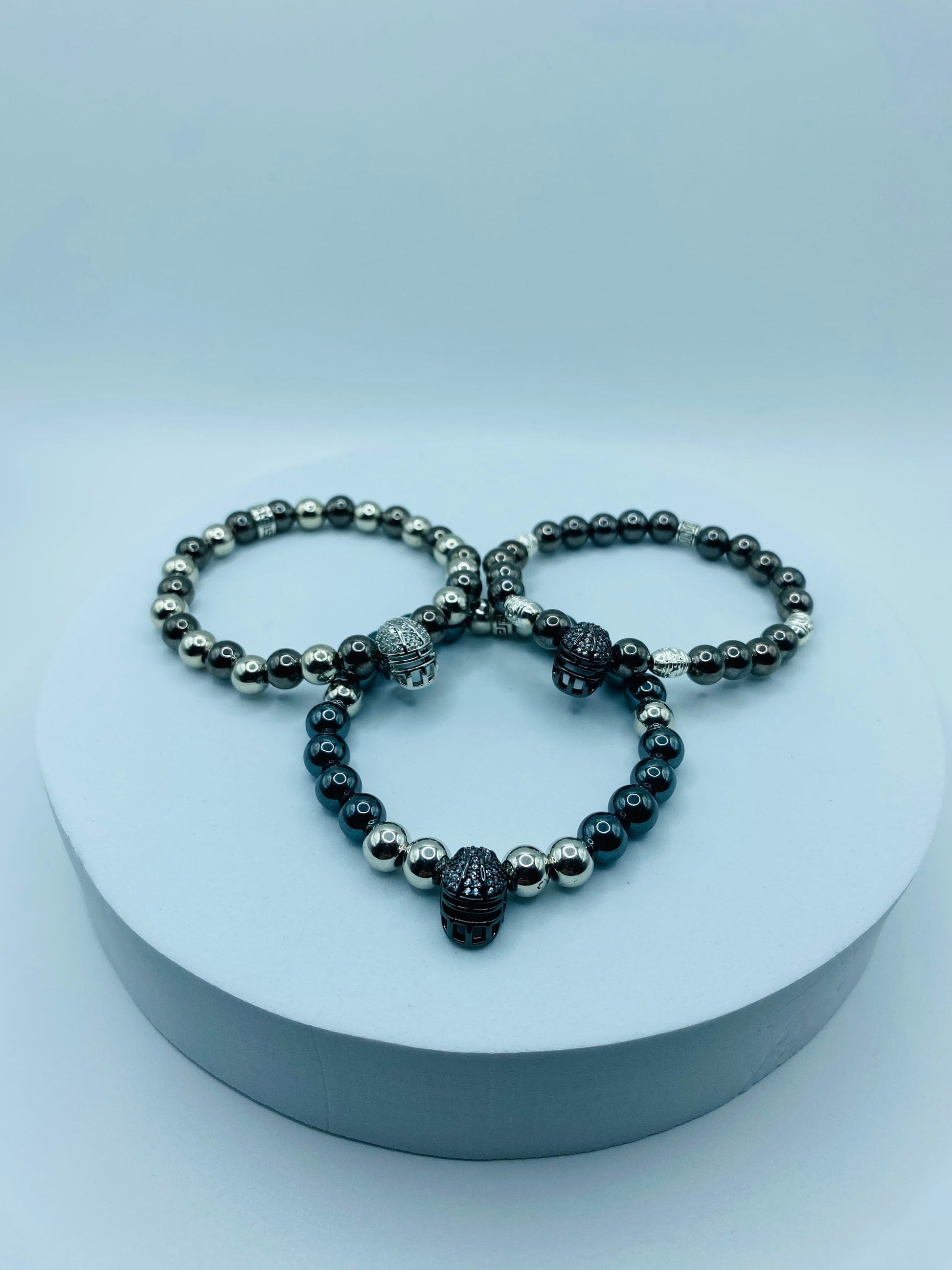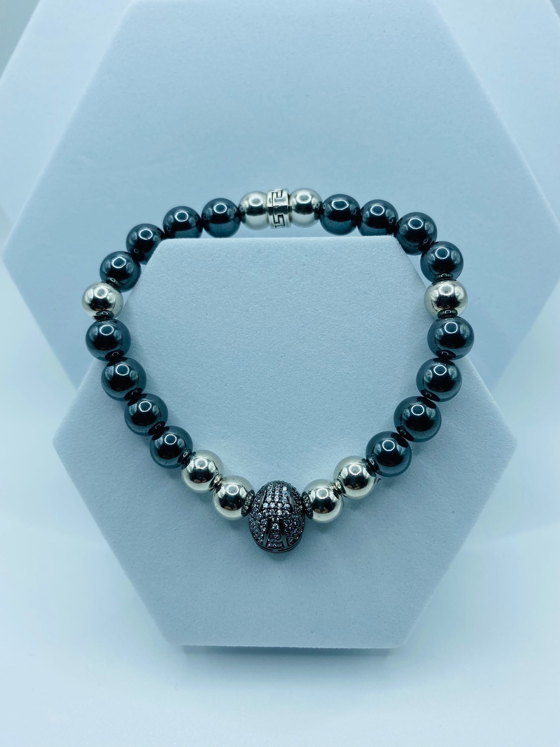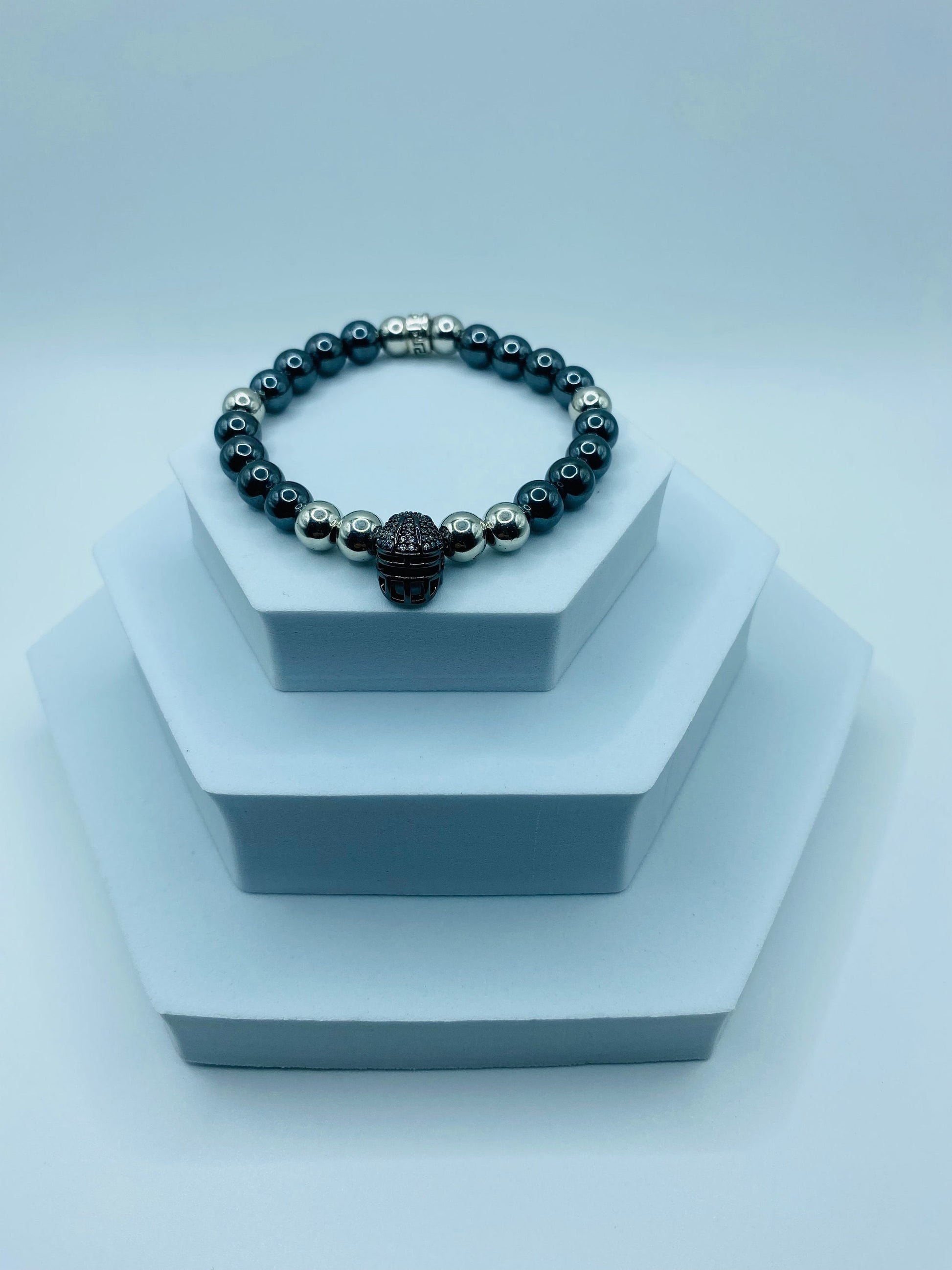 PRODUCT DETAILS - 8mm black hematite gemstone beads - 8mm silver plated hematite gemstone beads - Tibetan antique silver tube spacer - Metallic silver-plated football helmet with inlaid cubic zirconia - Strong, stretchy cord - Handmade in a clean and safe environment