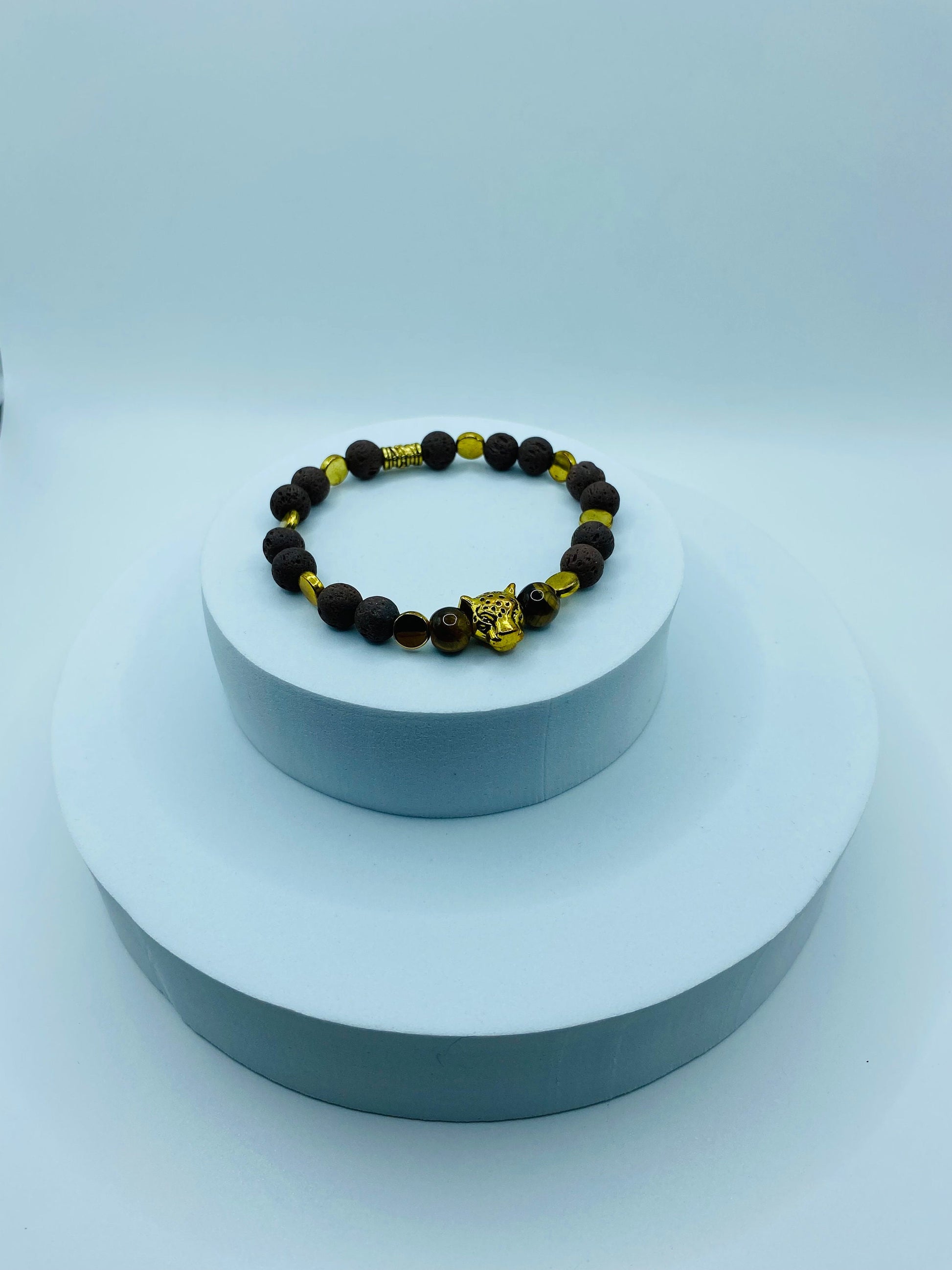 Lava Rock Bracelet: Leopard Charm, Tiger's Eye Beads, Handmade