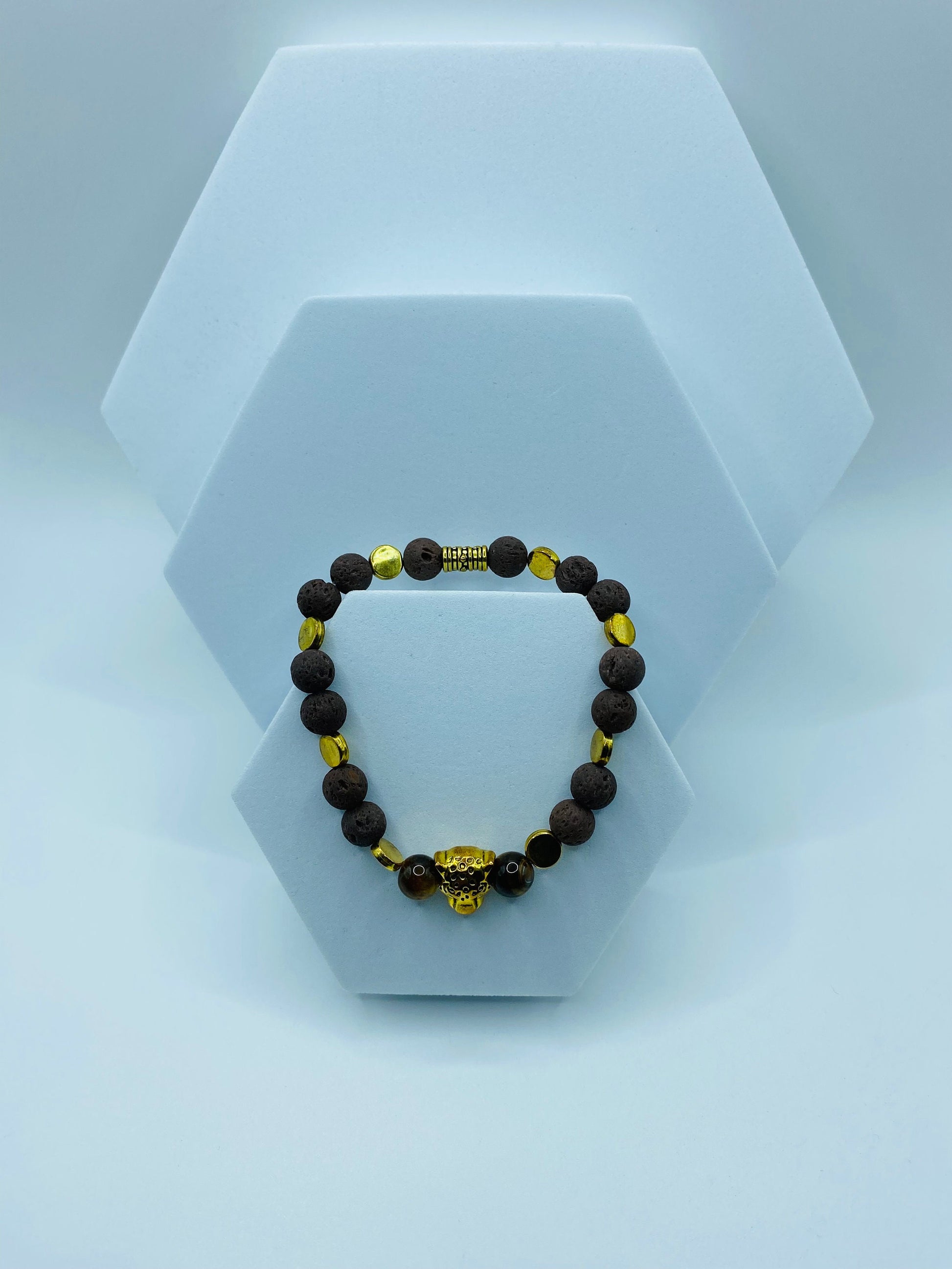 PRODUCT DETAILS - Brown lava rock 18k gold plated leopard charm head bracelet - 8mm brown lava rock gemstone beads - 8mm yellow tiger's eye gemstone beads - Antique gold leopard head charm bead - 18k gold plated flat disc spacers - Strong, stretchy cord - Handmade in a clean and safe environment