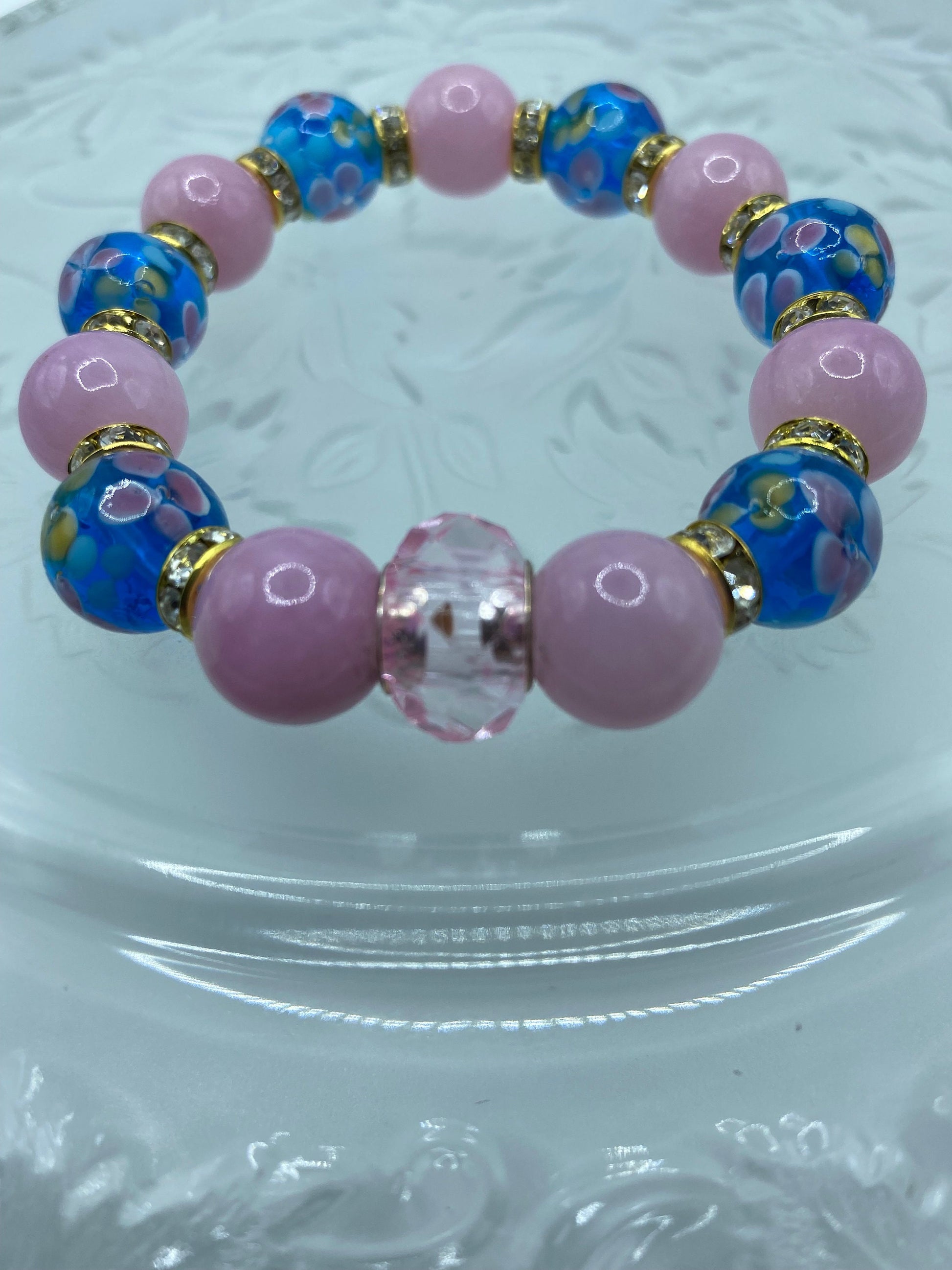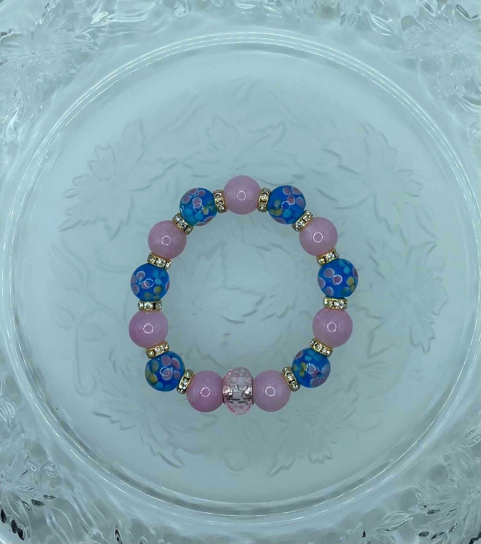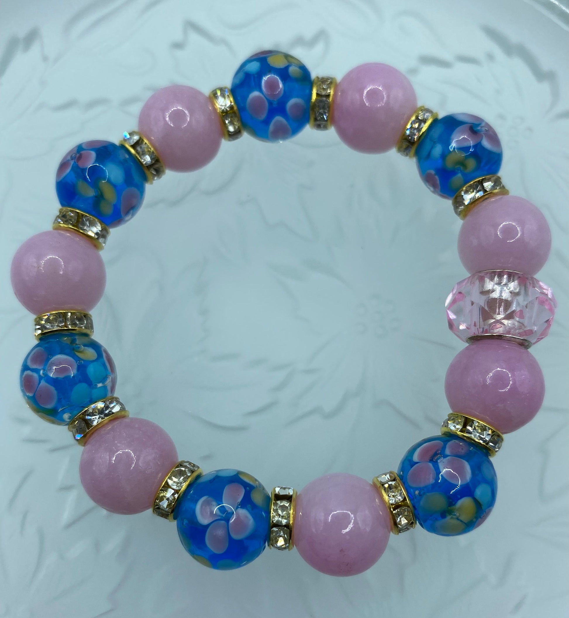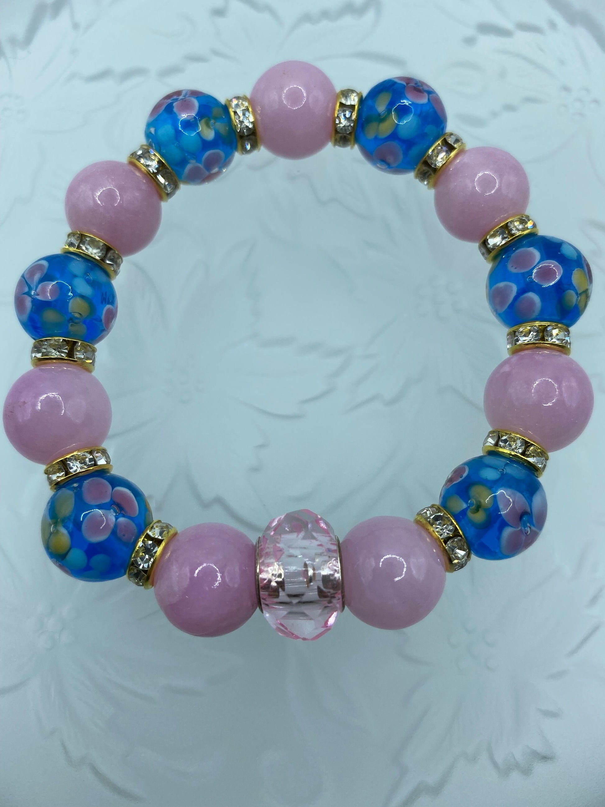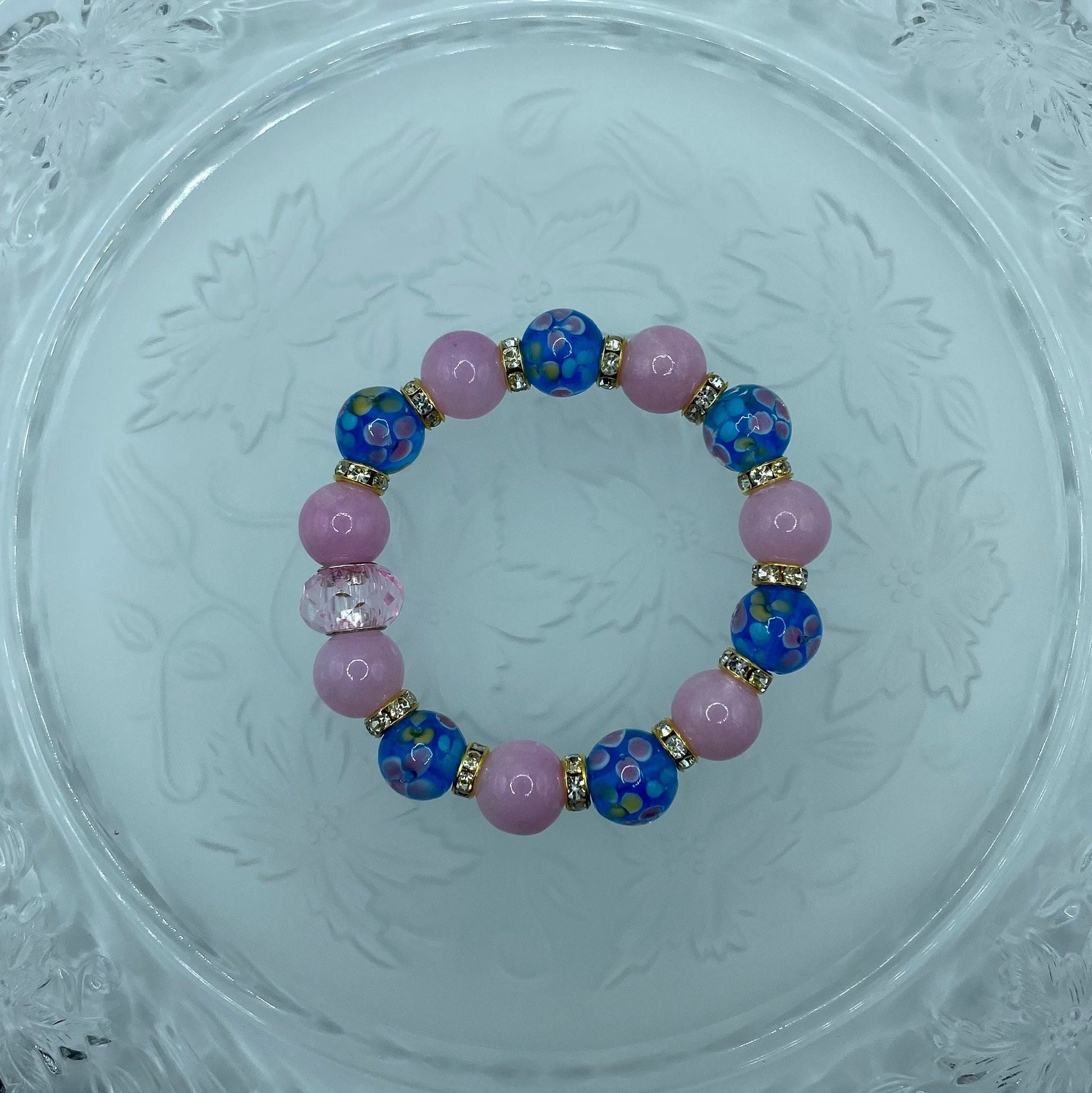PRODUCT DETAILS - 14mm European pink glass charm bead - 12mm Lavender jade gemstone beads - 12mm blue lampwork Murano floral glass beads - 8mm gold plated rondelles with rhinestones - Strong, stretchy cord - Handmade in a clean and safe environment