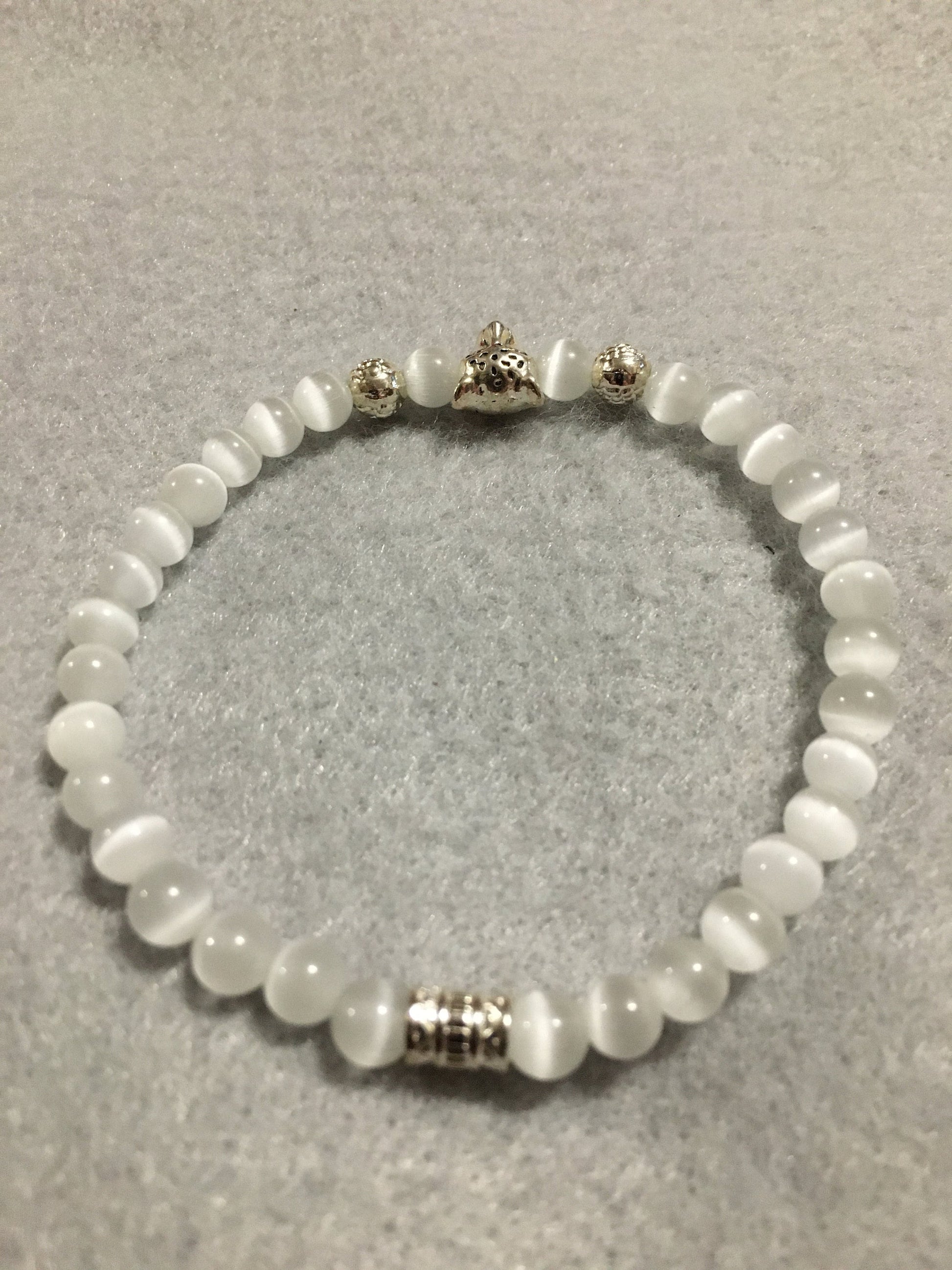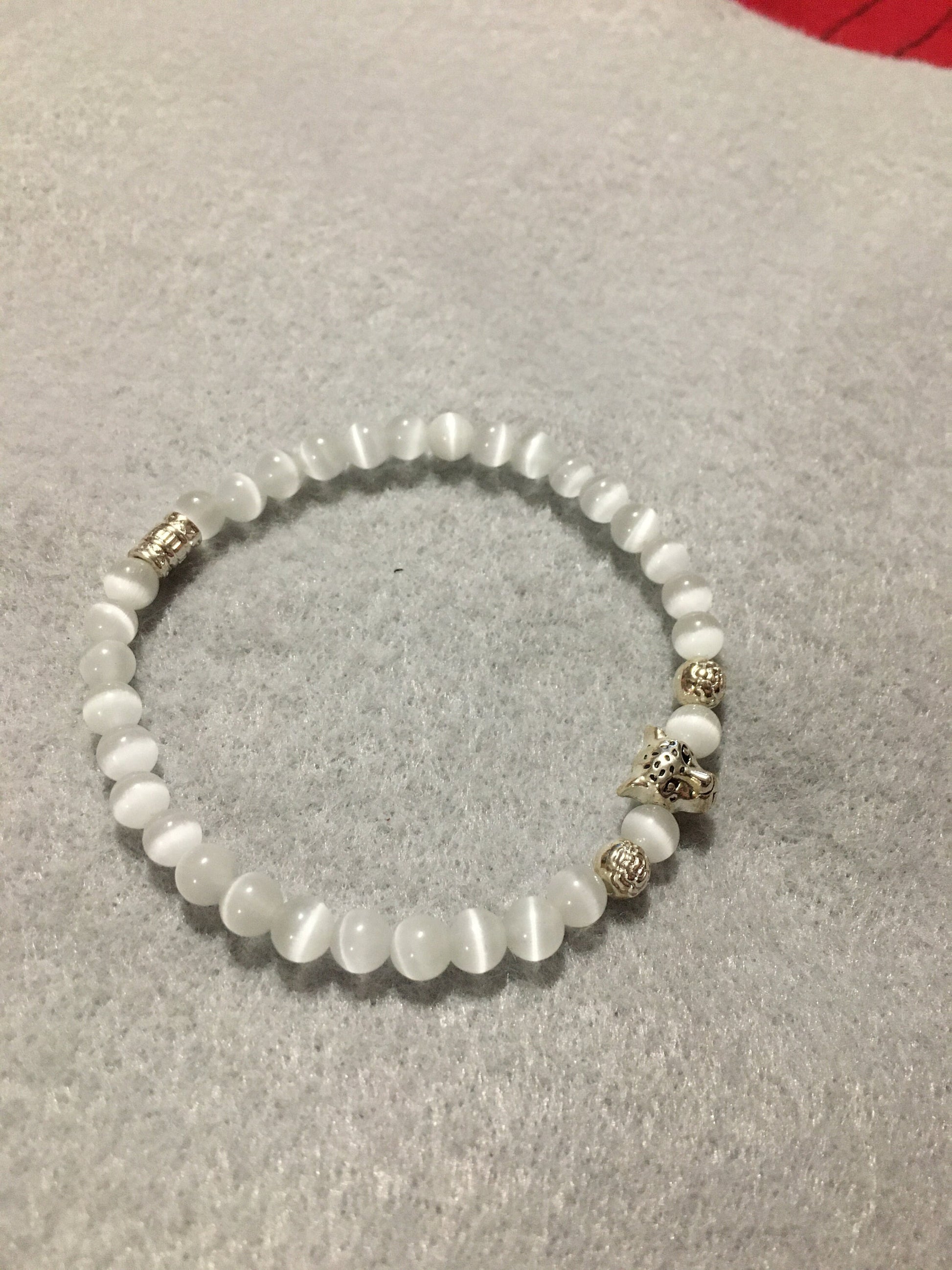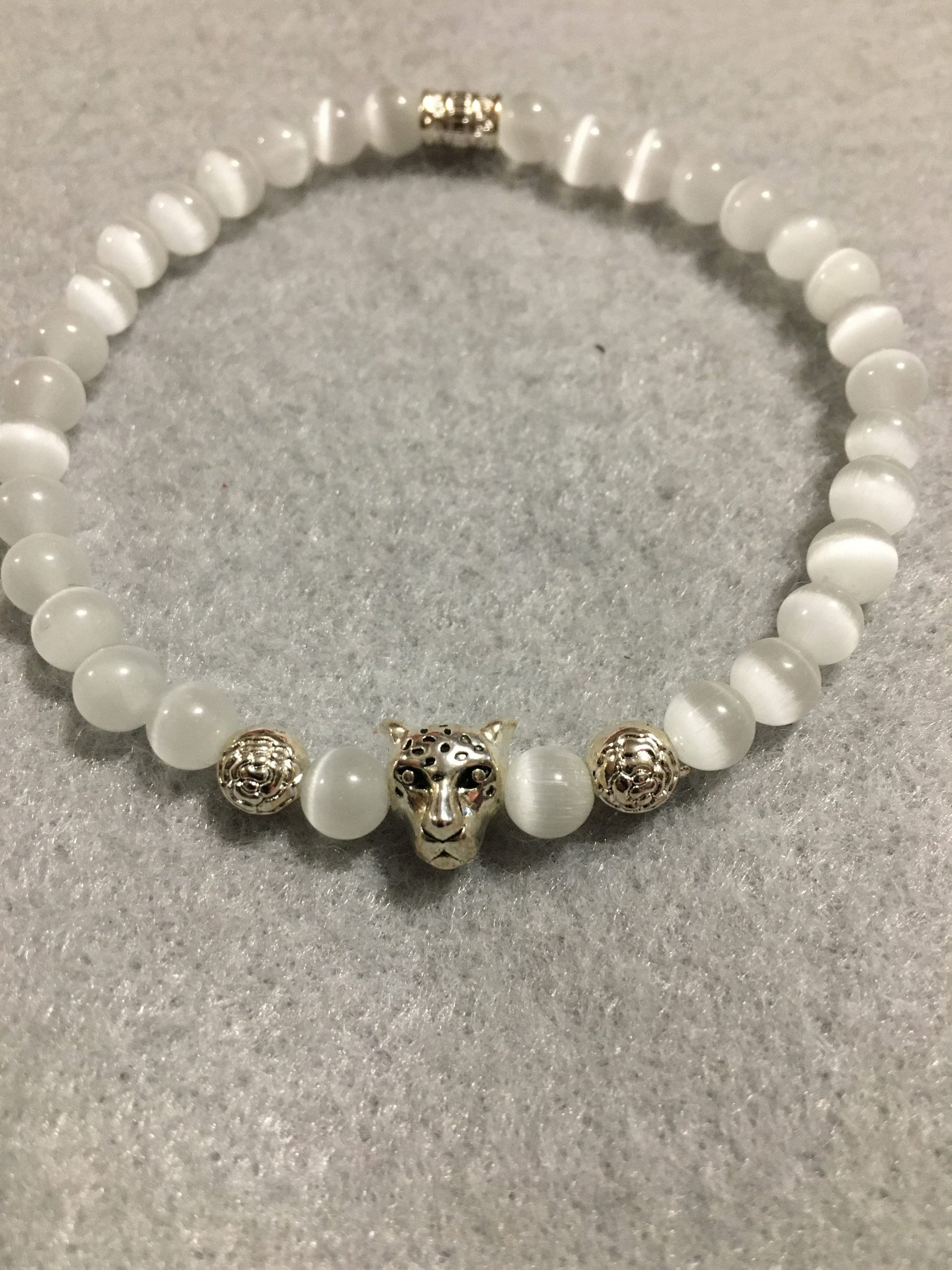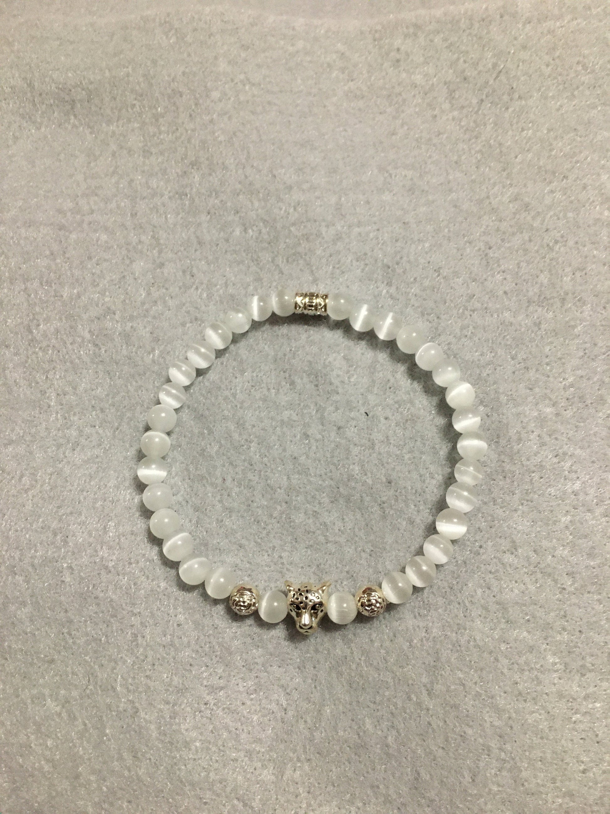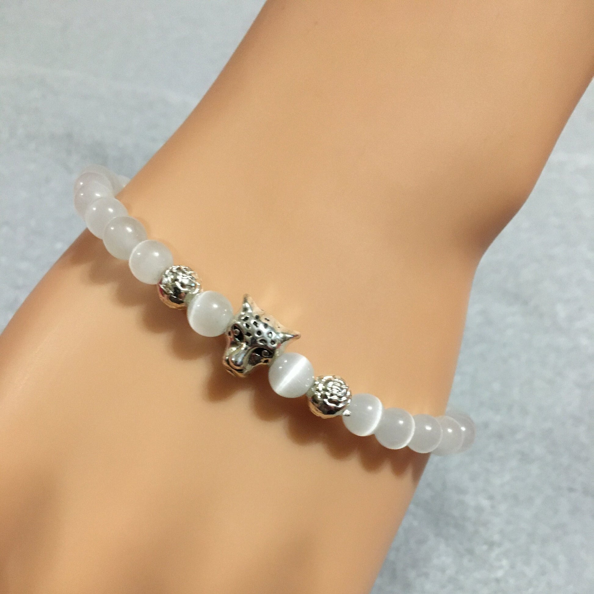 PRODUCT DETAILS - white cats eye leopard head charm bracelet - 6mm natural white cats eye glass beads - silver plated round metal floral spacer beads - Antique silver polished leopard head charm bead - silver plated tube spacer - Strong, stretchy cord - Handmade in a clean and safe environment
