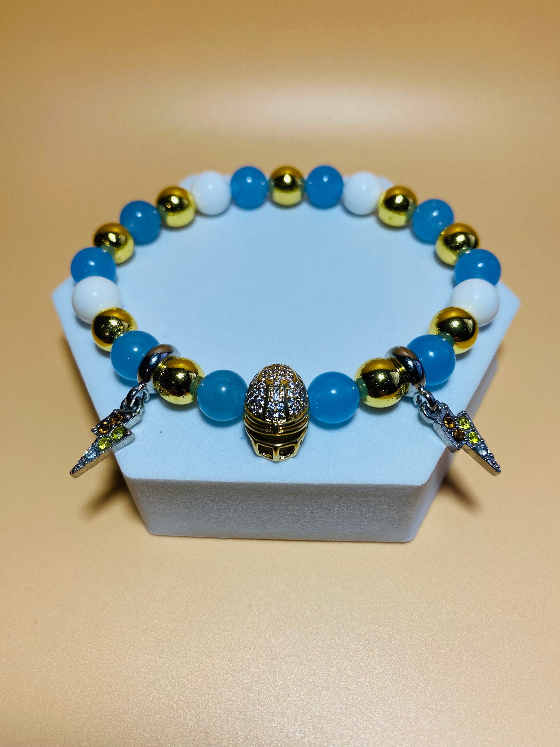 PRODUCT DETAIL - 8mm Blue Aquamarine gemstone beads - 8mm 18k Gold Plated Hematite gemstone beads - 8mm natural white jade gemstone beads - Gold Metallic plated football helmet with inlaid cubic zirconia - Silver Plated Lightning Bolt charms - Strong, stretchy cord - Handmade in a clean and safe environment