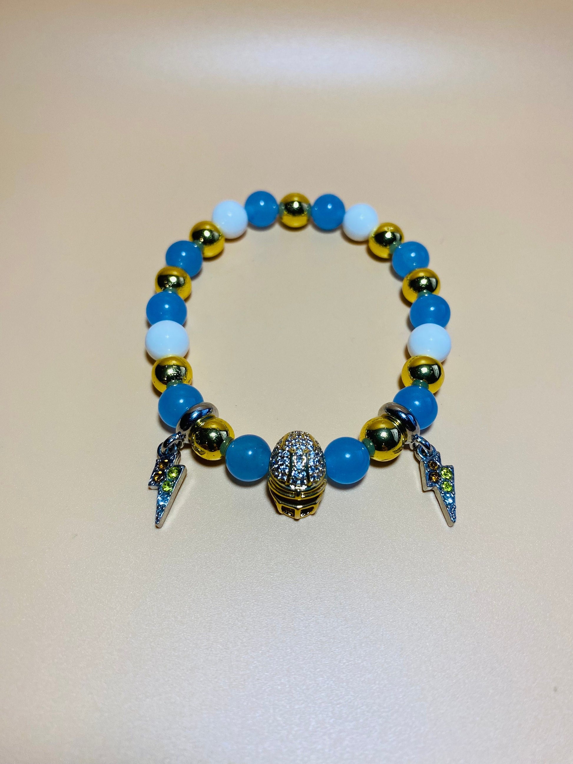 Los Angeles Chargers Mens Bracelet, Lightning Bolt Charms & Golden Football Helmet - Natural Gemstone Beads