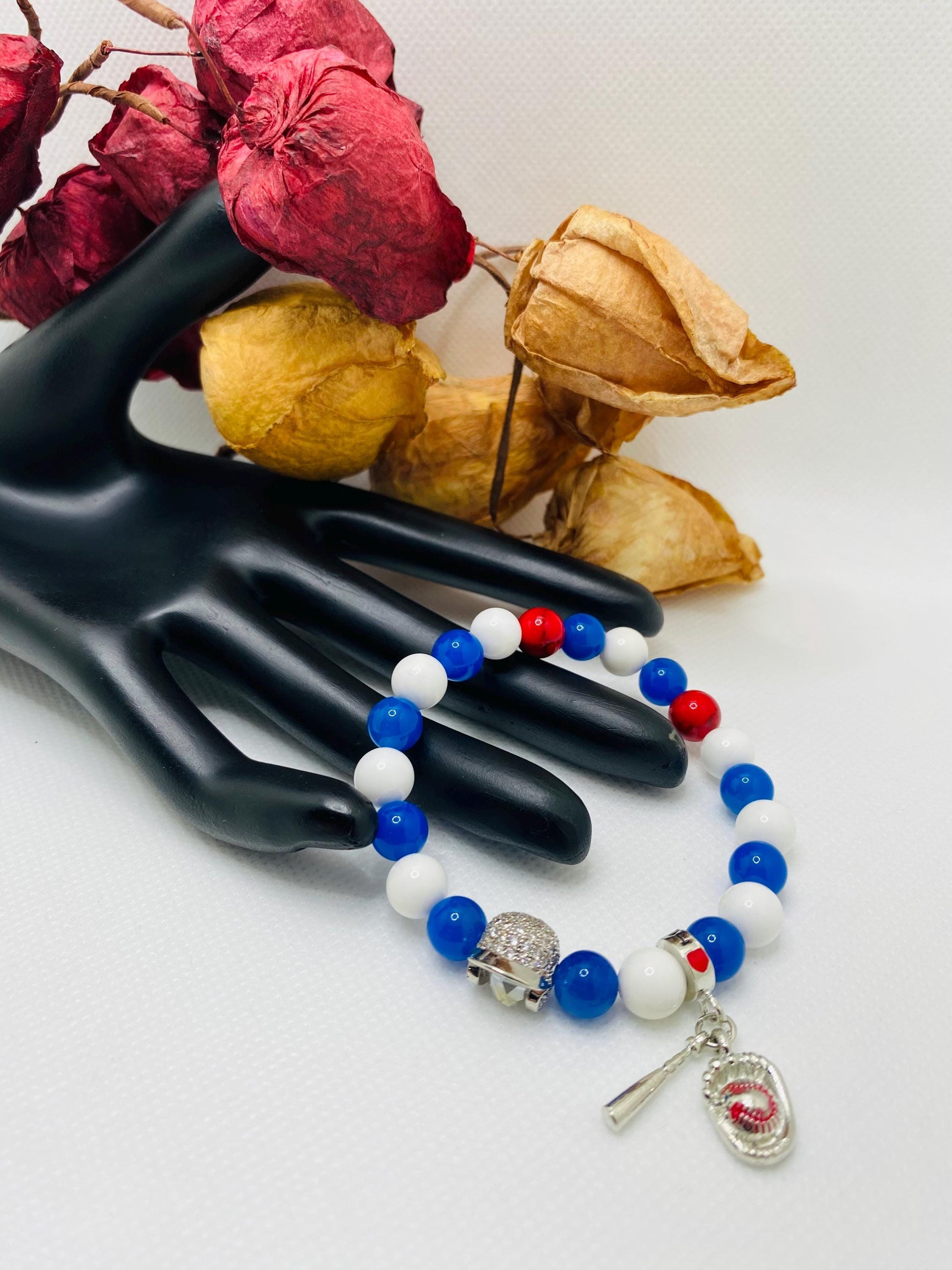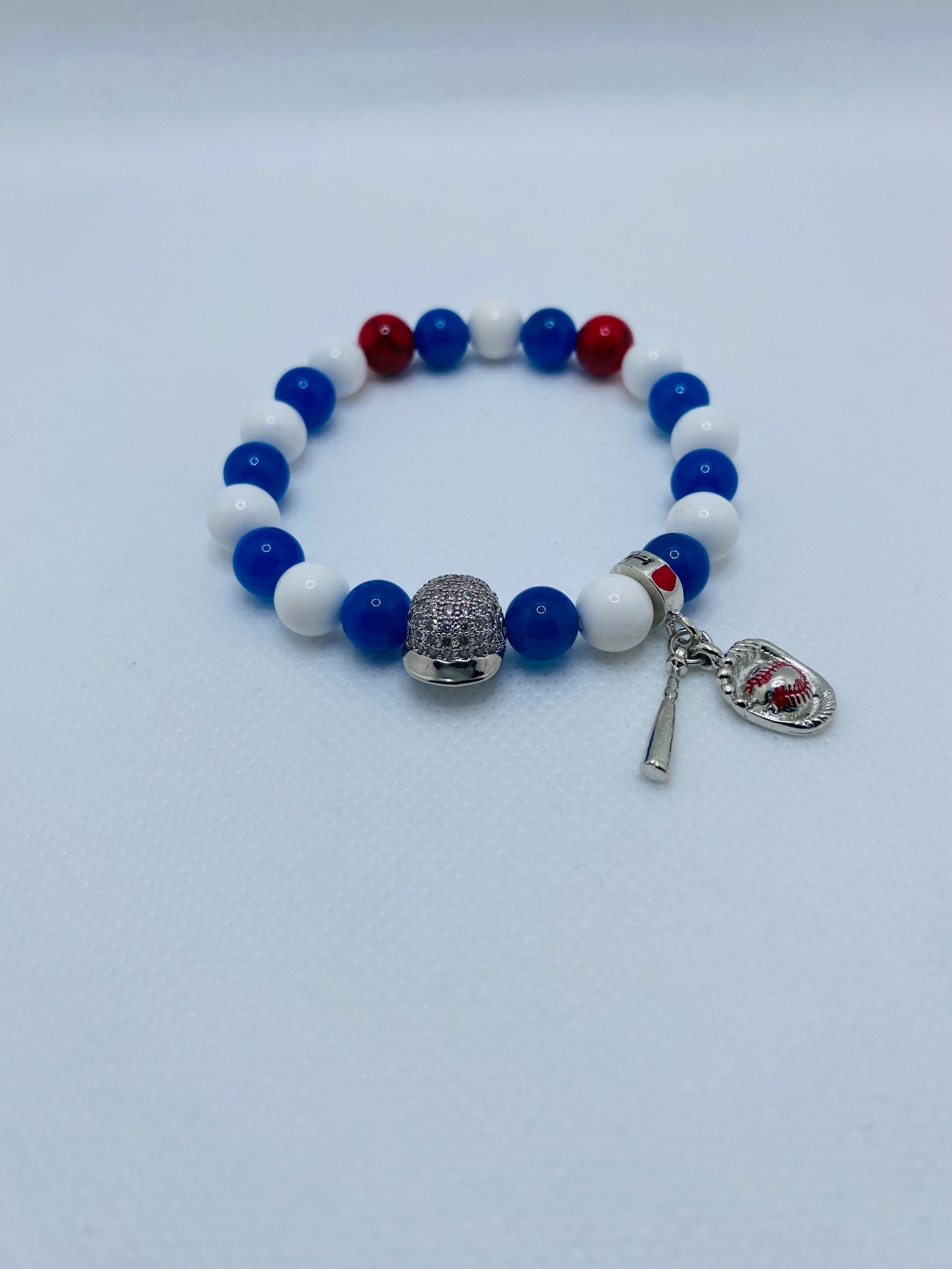 PRODUCT DETAIL - 8mm Blue Agate gemstone beads - 8mm natural White Porcelain gemstone beads - 8mm Red Turquoise Natural gemstone beads - Silver Plated Baseball Bat and Glove Pendant Charms - Silver Metallic plated Baseball helmet with inlaid cubic zirconia - Strong, stretchy cord - Handmade in a clean and safe environment