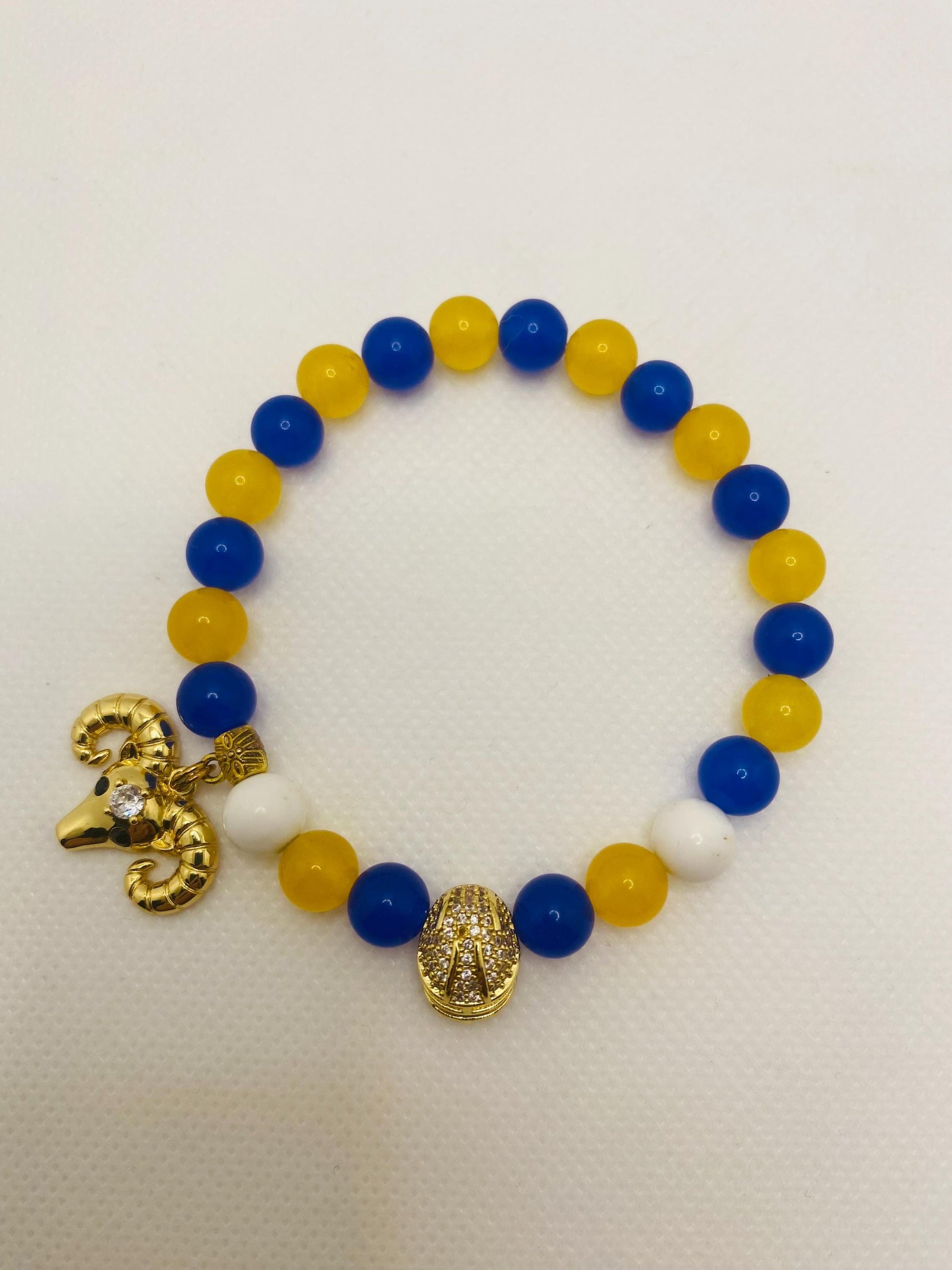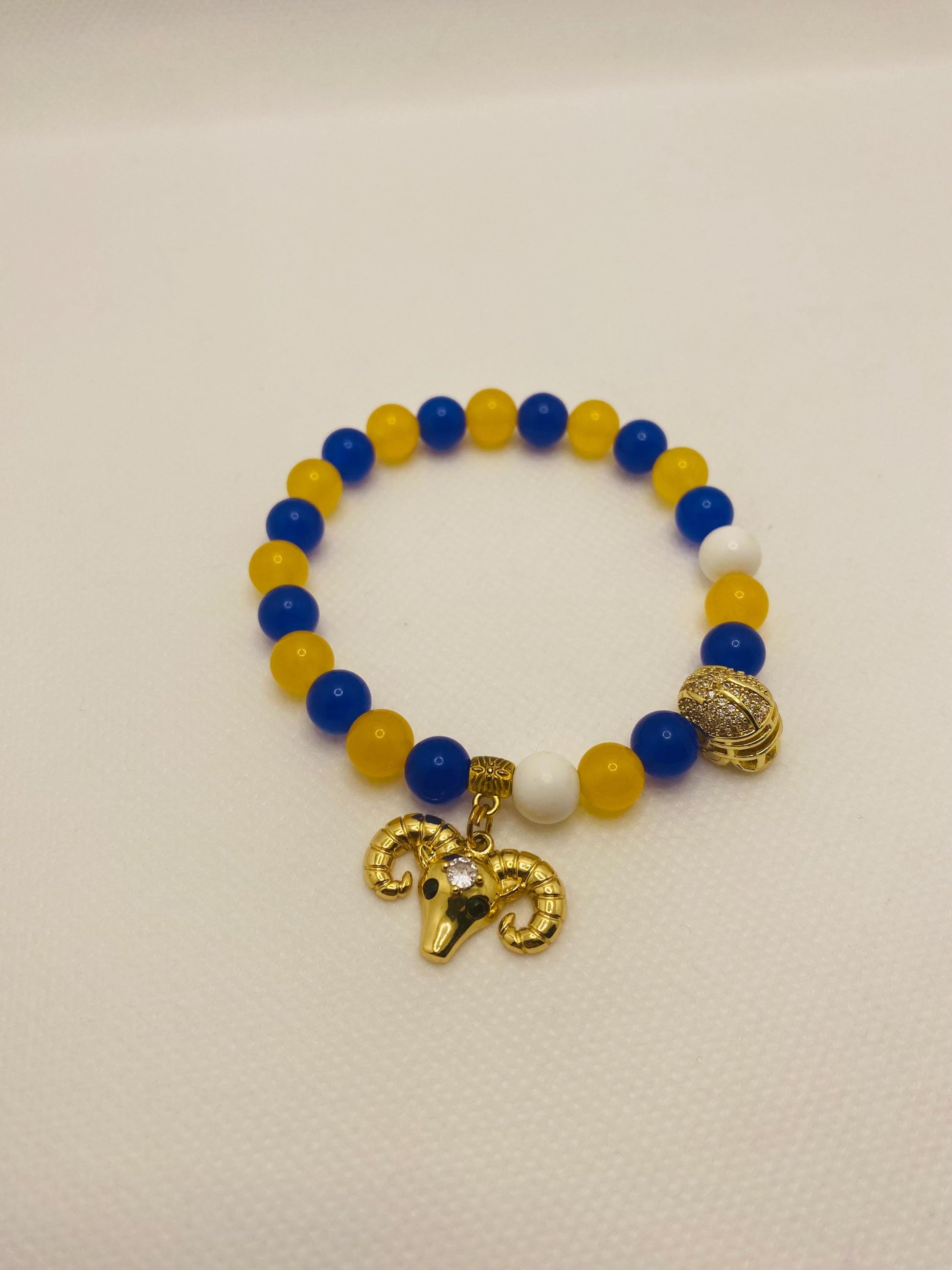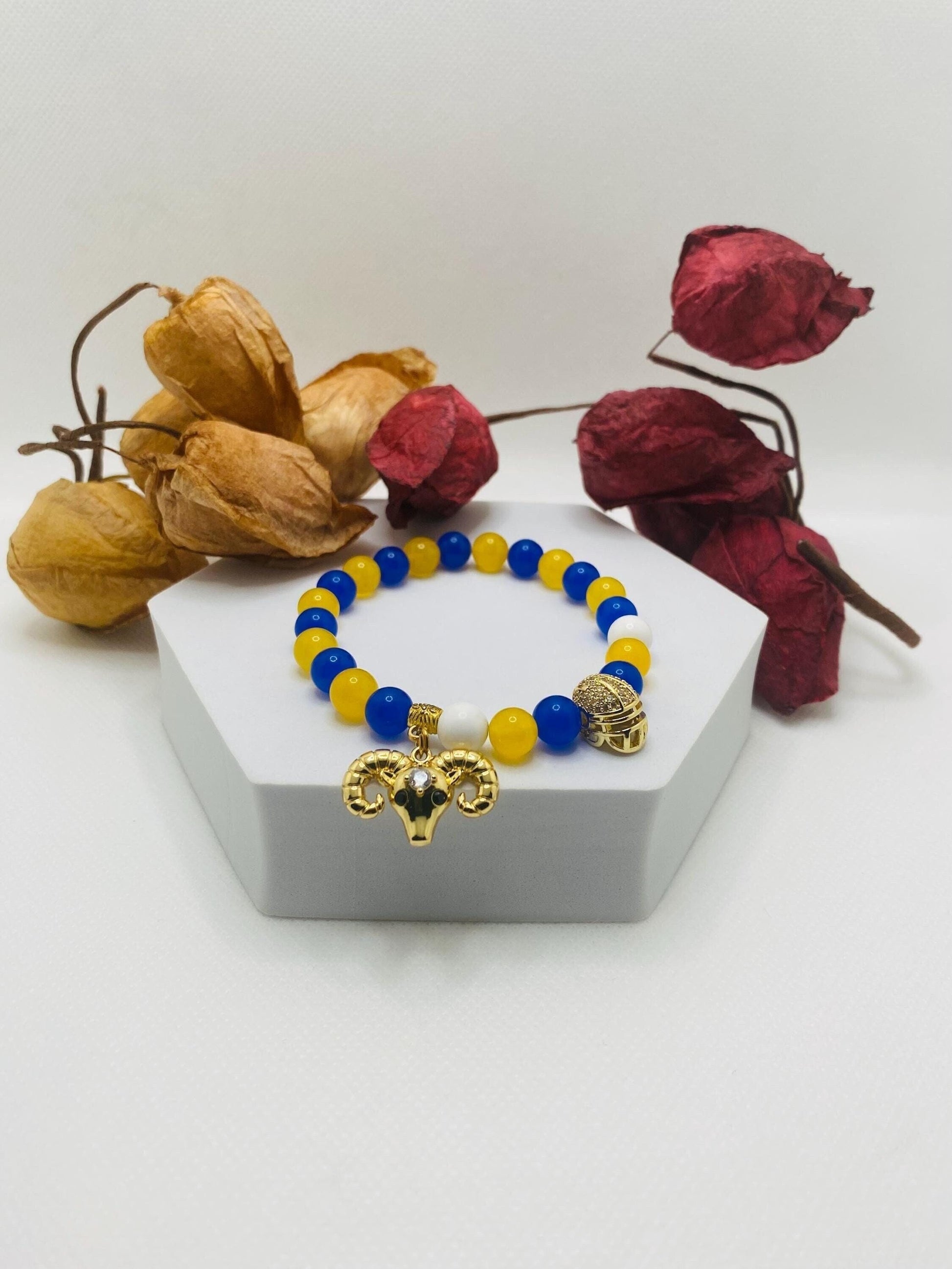 PRODUCT DETAILS - 8mm Natural Yellow Agate gemstone beads - 8mm natural blue kyanite gemstone beads - 8mm natural white jade gemstone beads - Metallic gold-plated football helmet with inlaid cubic zirconia - Golden Ram charm with center cubic zirconia crystal - Strong, stretchy cord - Handmade in a clean and safe environment