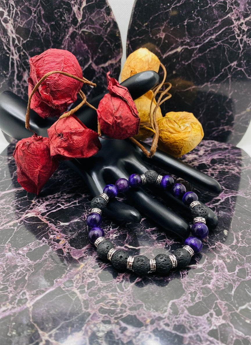 Mens Black Lava Rock & Purple Tiger Eye Bracelet: Tibetan Gemstone Jewelry