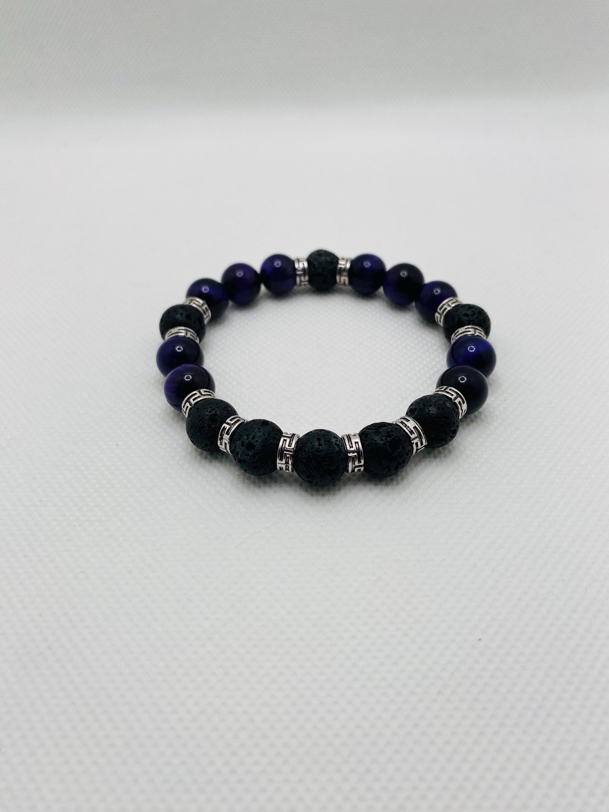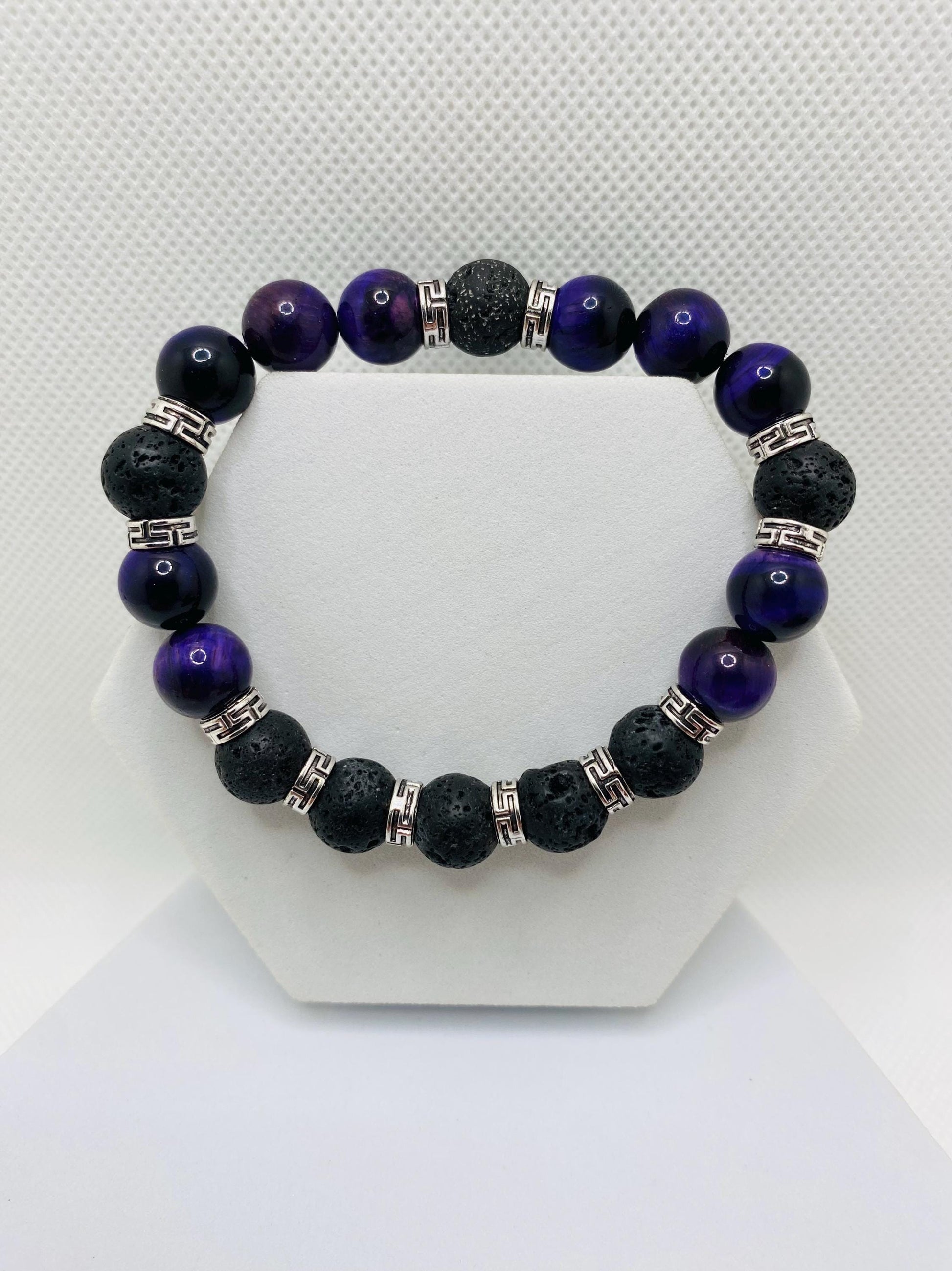 Product Details: 10mm Beautiful Natural Purple Tigers Eye Gemstone Beads. 10mm Natural Black Lava Rock Gemstone Beads 8mm Tibetan Jewelry Spacers .8mm Super Strong Stretchy Cord.