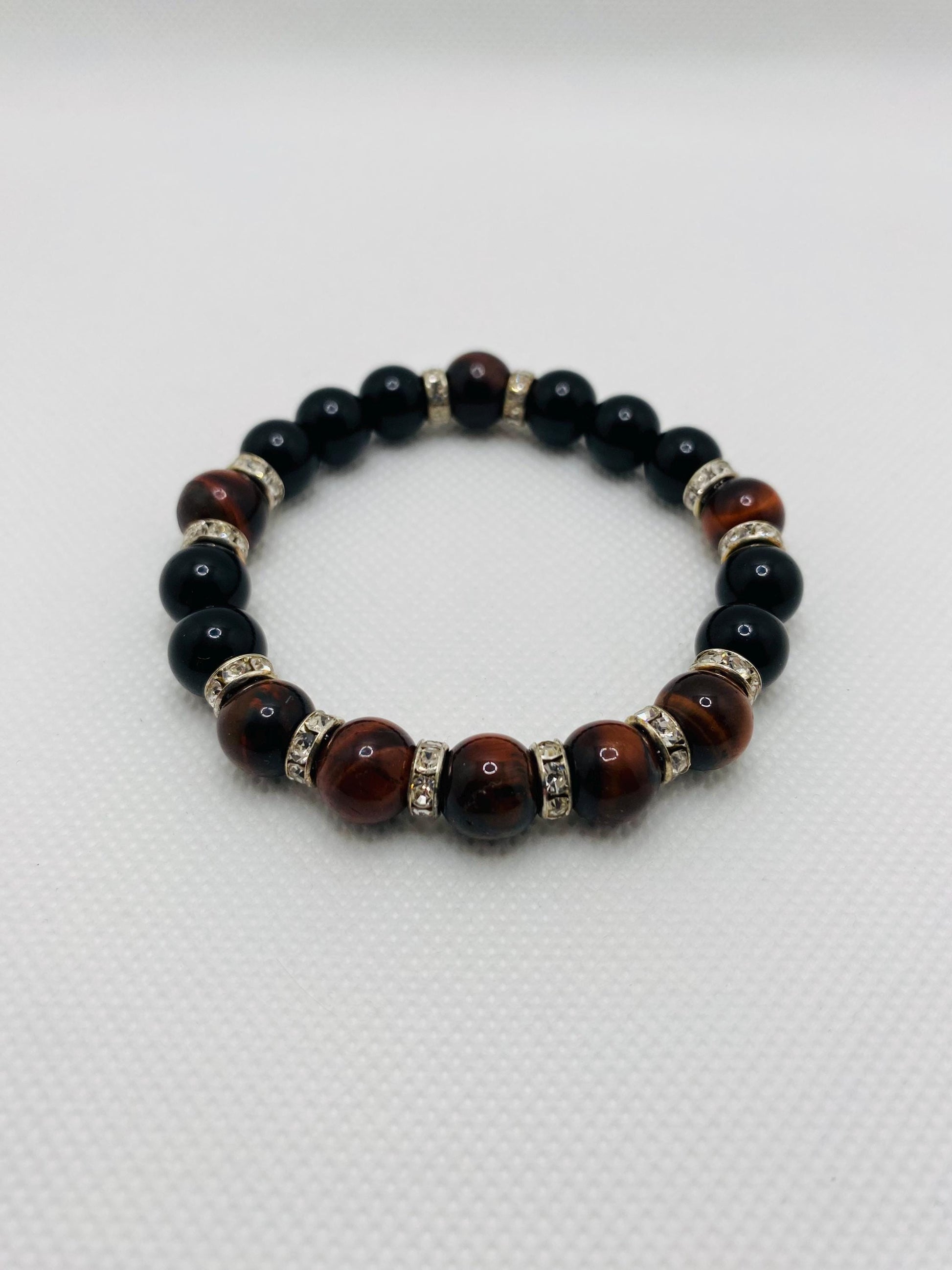 Product Details: 8mm Beautiful Natural Red Tigers Eye Gemstone Beads. 8mm Natural Black Onyx Gemstone Beads 8mm Silverplated rhinestone rondelle Spacers .8mm Super Strong Stretchy Cord.