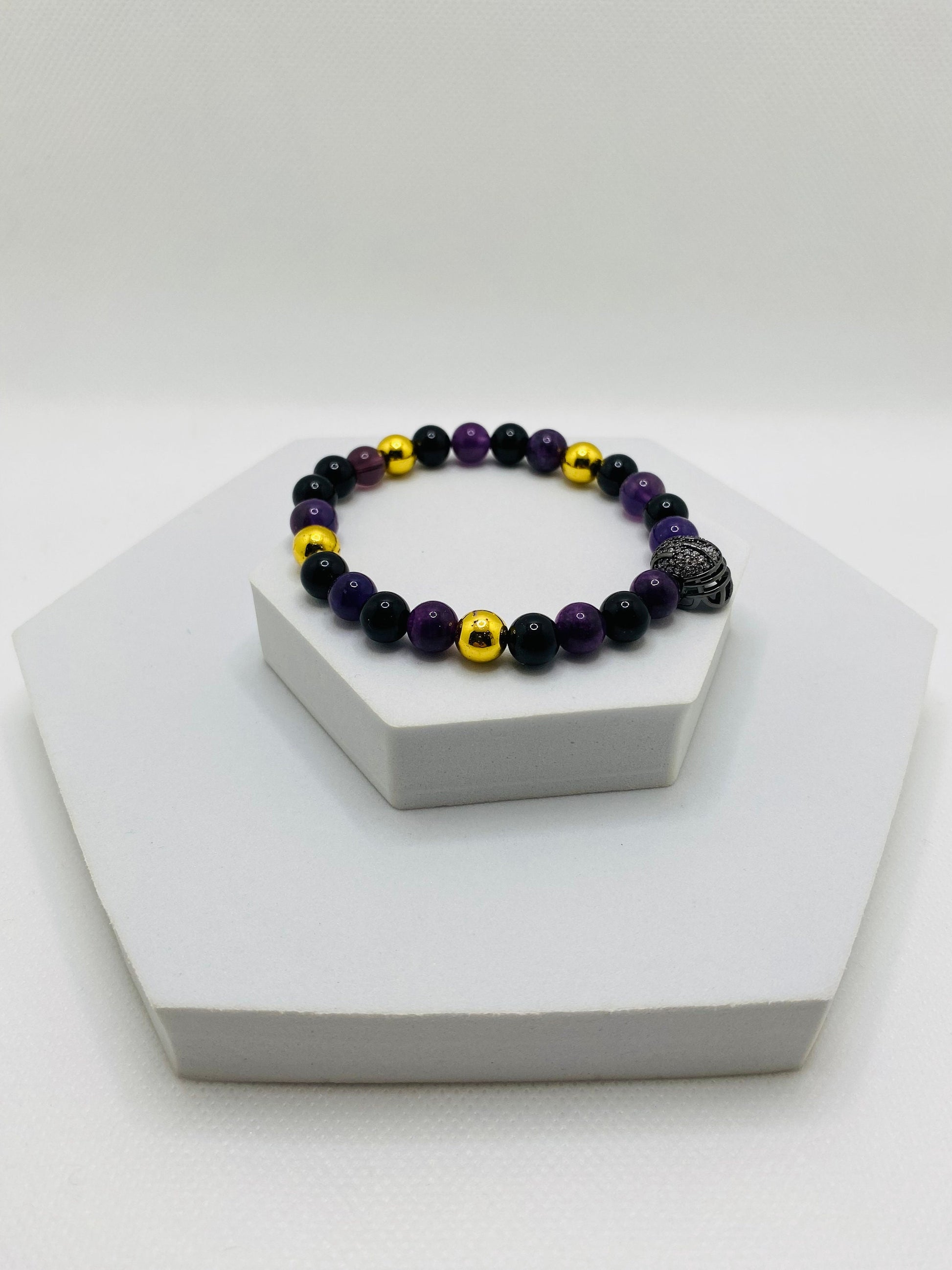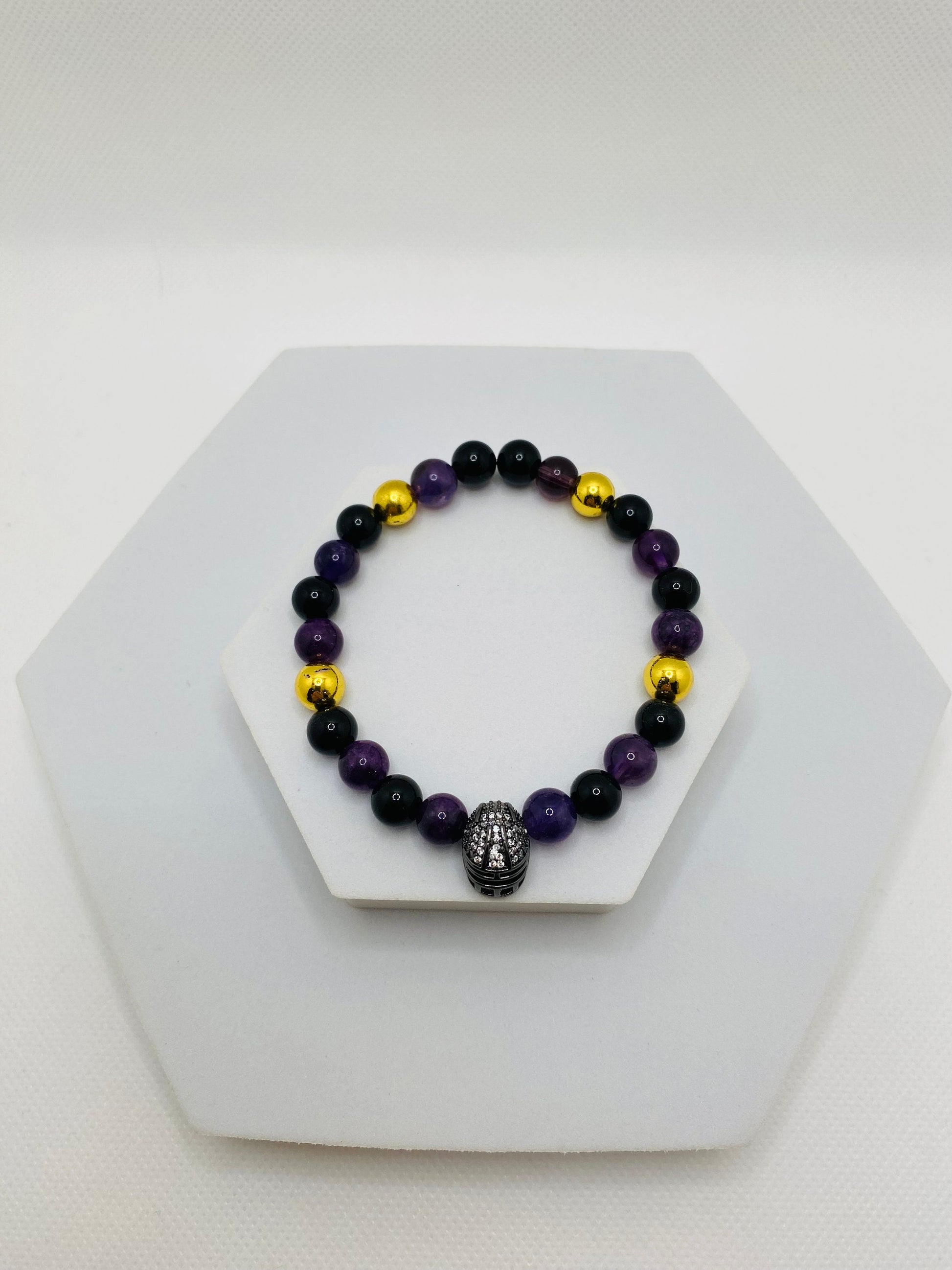 PRODUCT DETAIL - 8mm Black Onyx gemstone beads - 8mm natural purple Amethyst gemstone beads - 8mm natural 18k gold plated Hematite gemstone beads - Gun Metal Metallic plated football helmet with inlaid cubic zirconia - Strong, stretchy cord - Handmade in a clean and safe environment