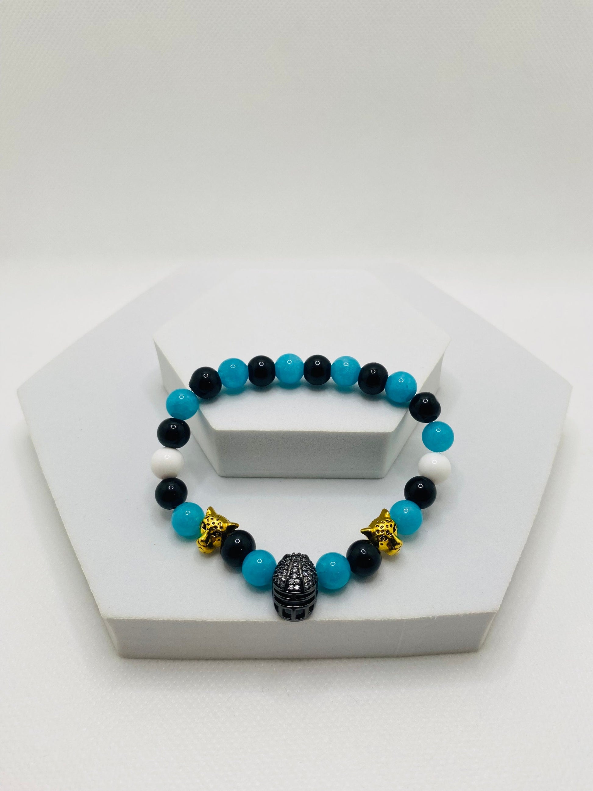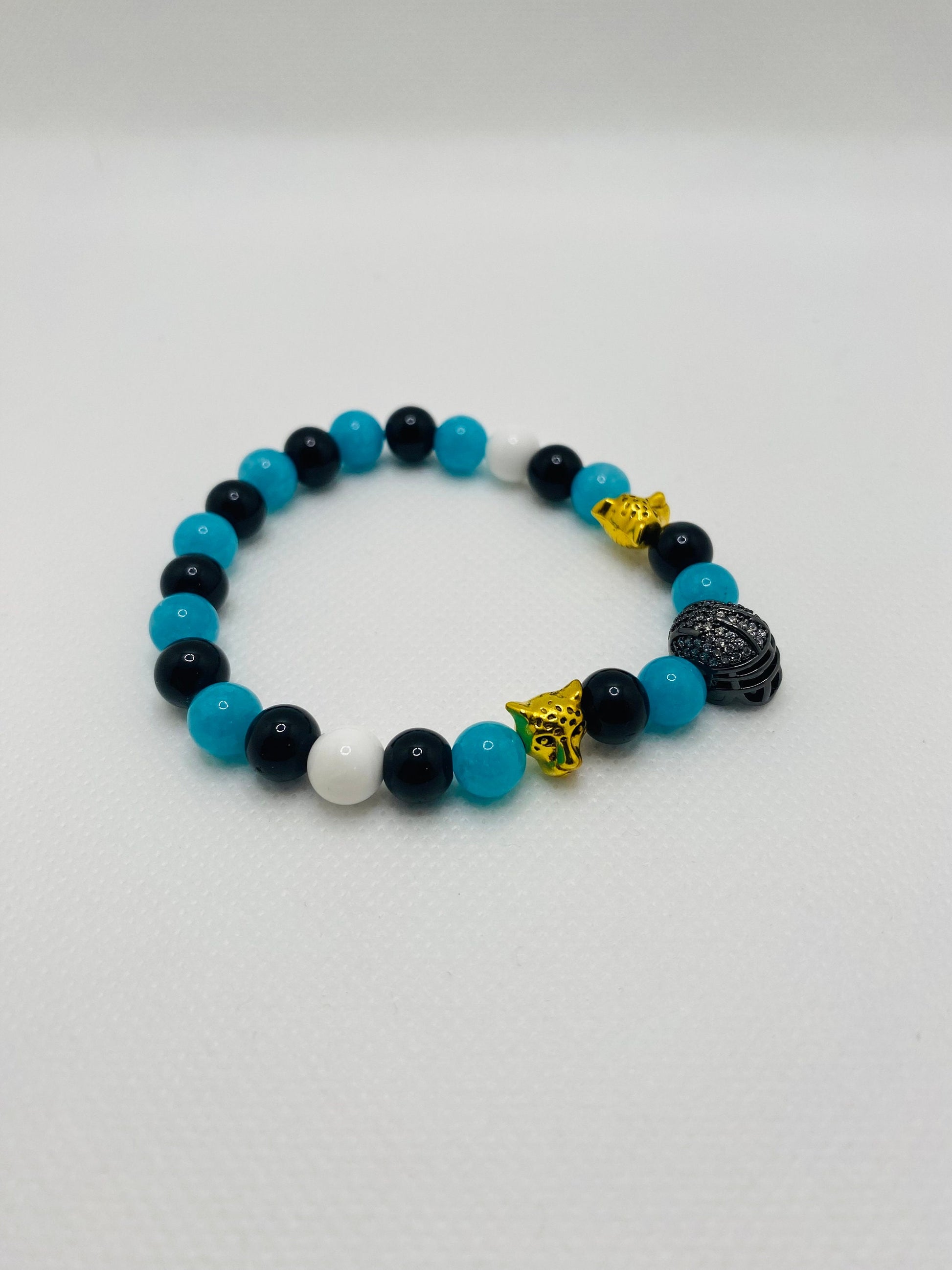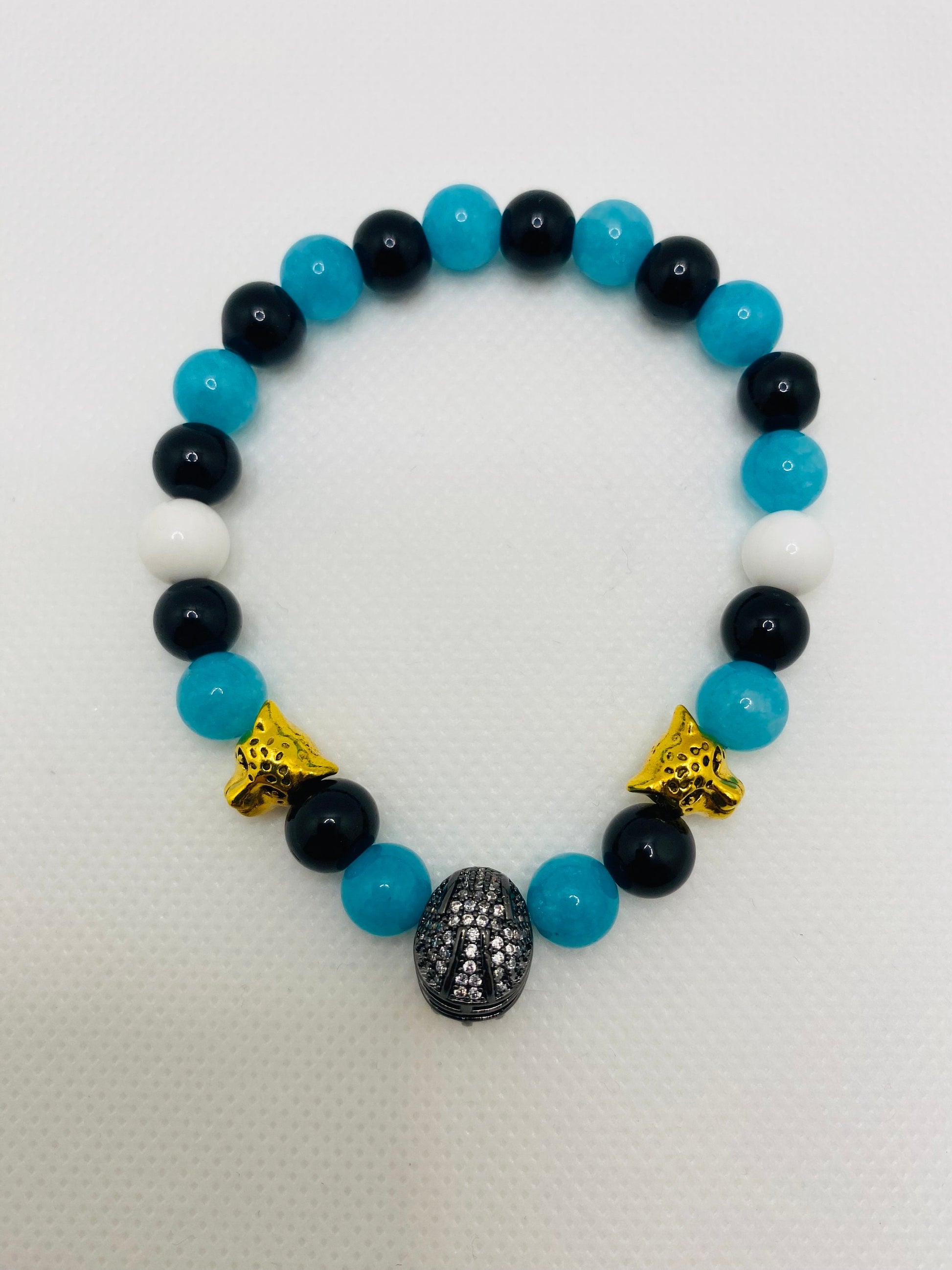 PRODUCT DETAIL - 8mm Black Onyx gemstone beads - 8mm Teal Jade gemstone beads - 8mm natural white jade gemstone beads - Gun Metal Metallic plated football helmet with inlaid cubic zirconia - Gold Jaguar head charm beads - Strong, stretchy cord - Handmade in a clean and safe environment