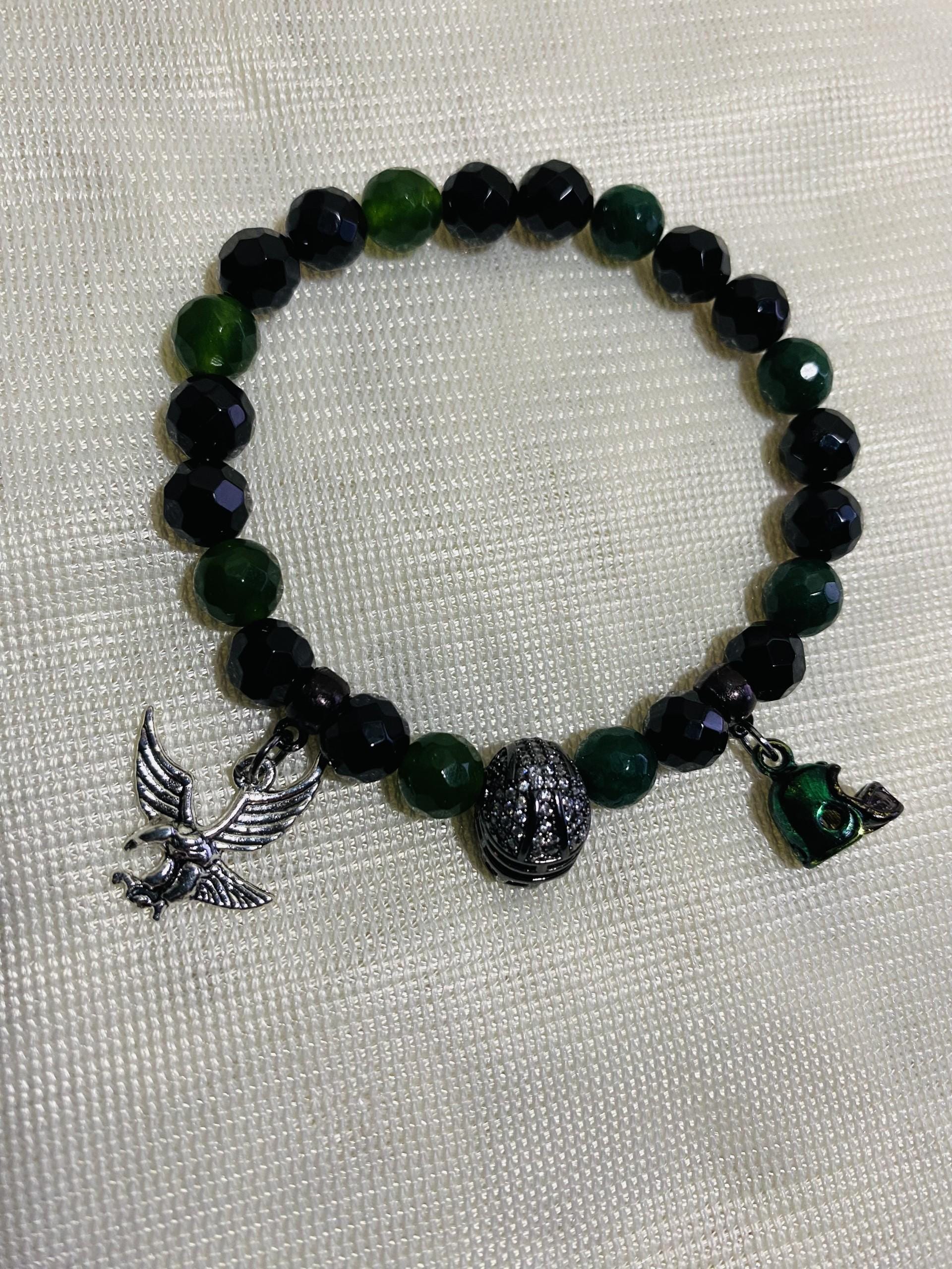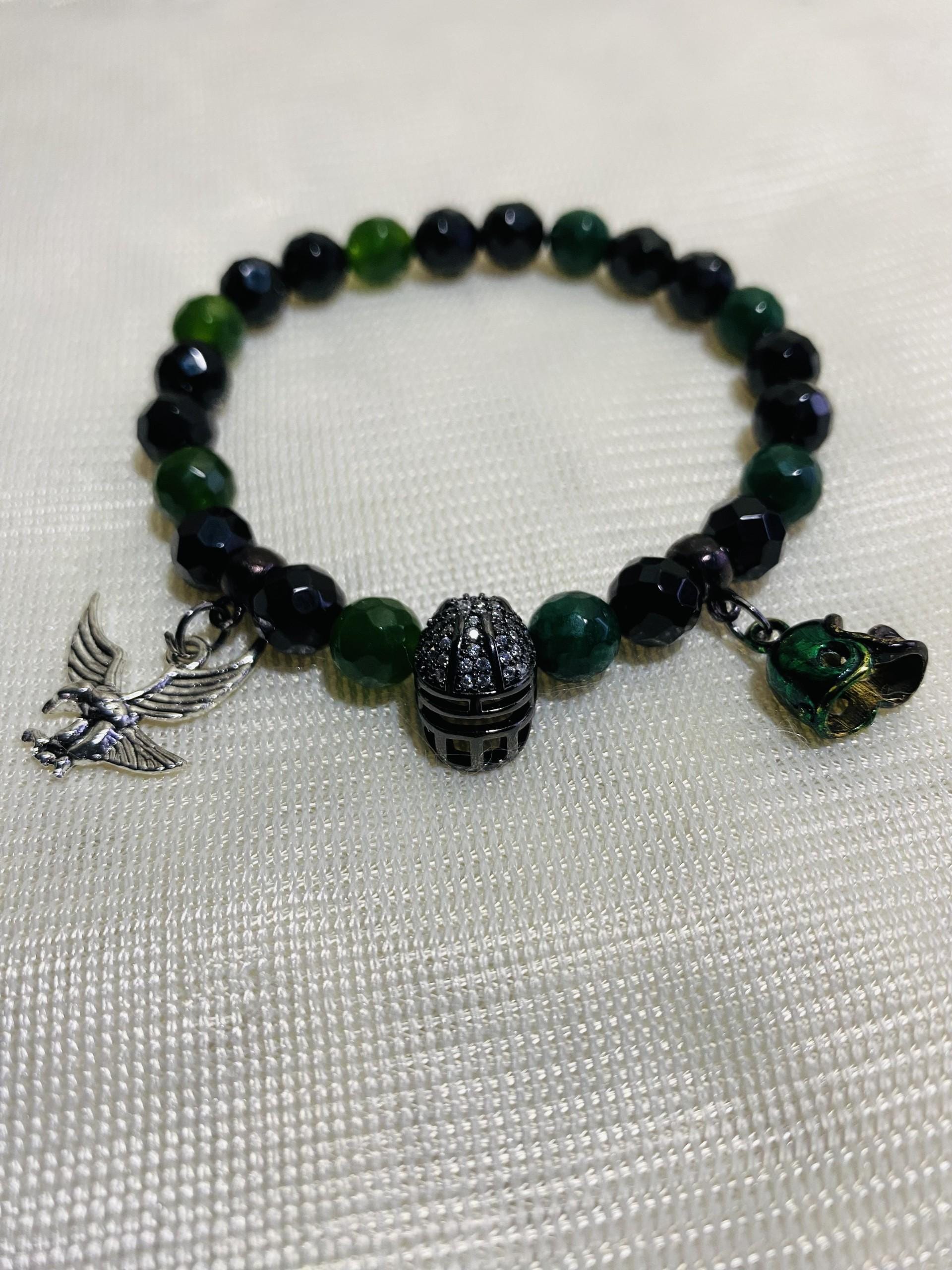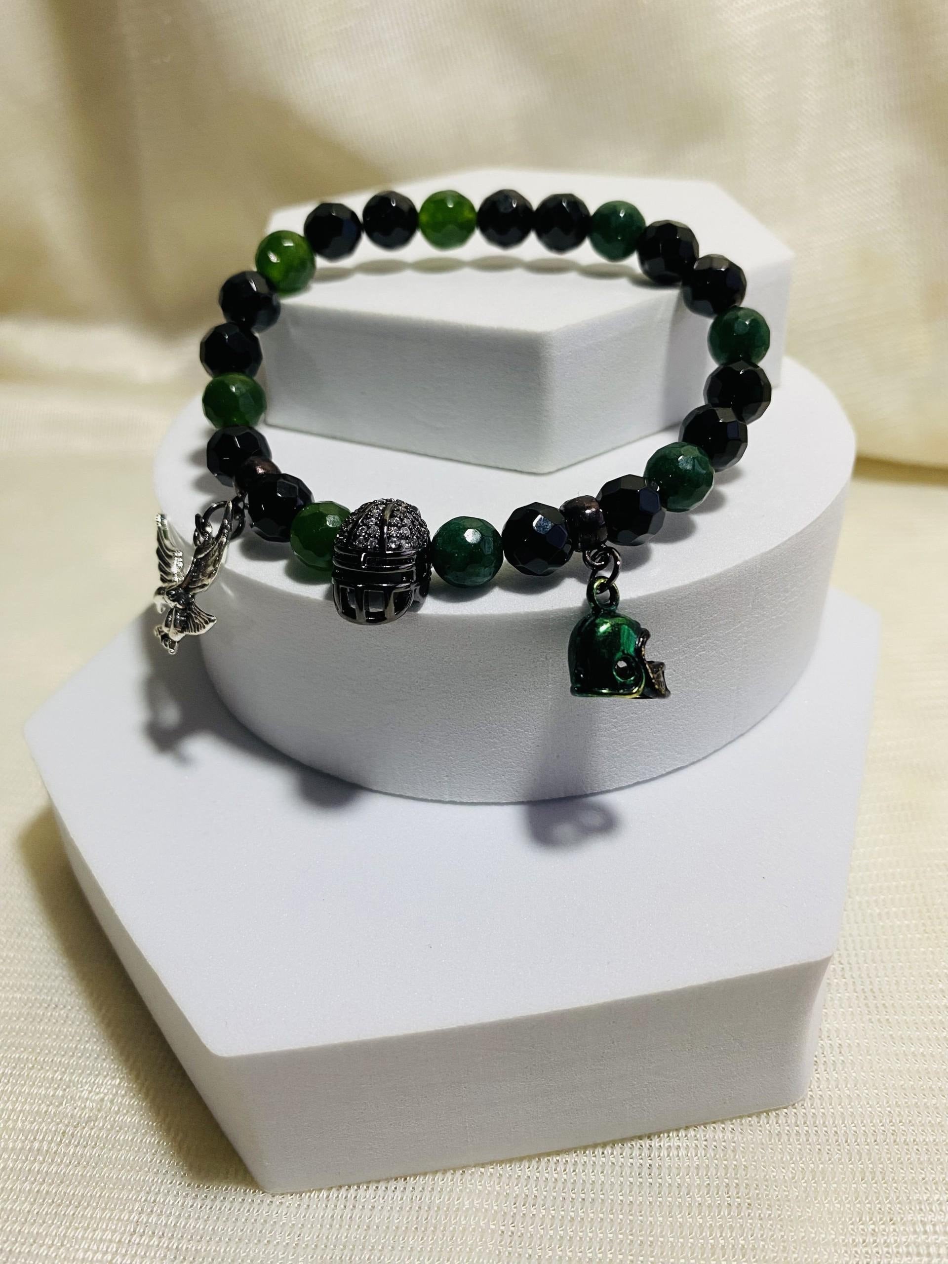 PRODUCT DETAILS - 8mm black natural faceted onyx gemstone beads - 8mm natural emerald green faceted jade gemstone beads - Metallic gun metal-plated football helmet with inlaid cubic zirconia - Micro mini football helmet charm - Antique silver eagle charm - Strong, stretchy cord - Handmade in a clean and safe environment