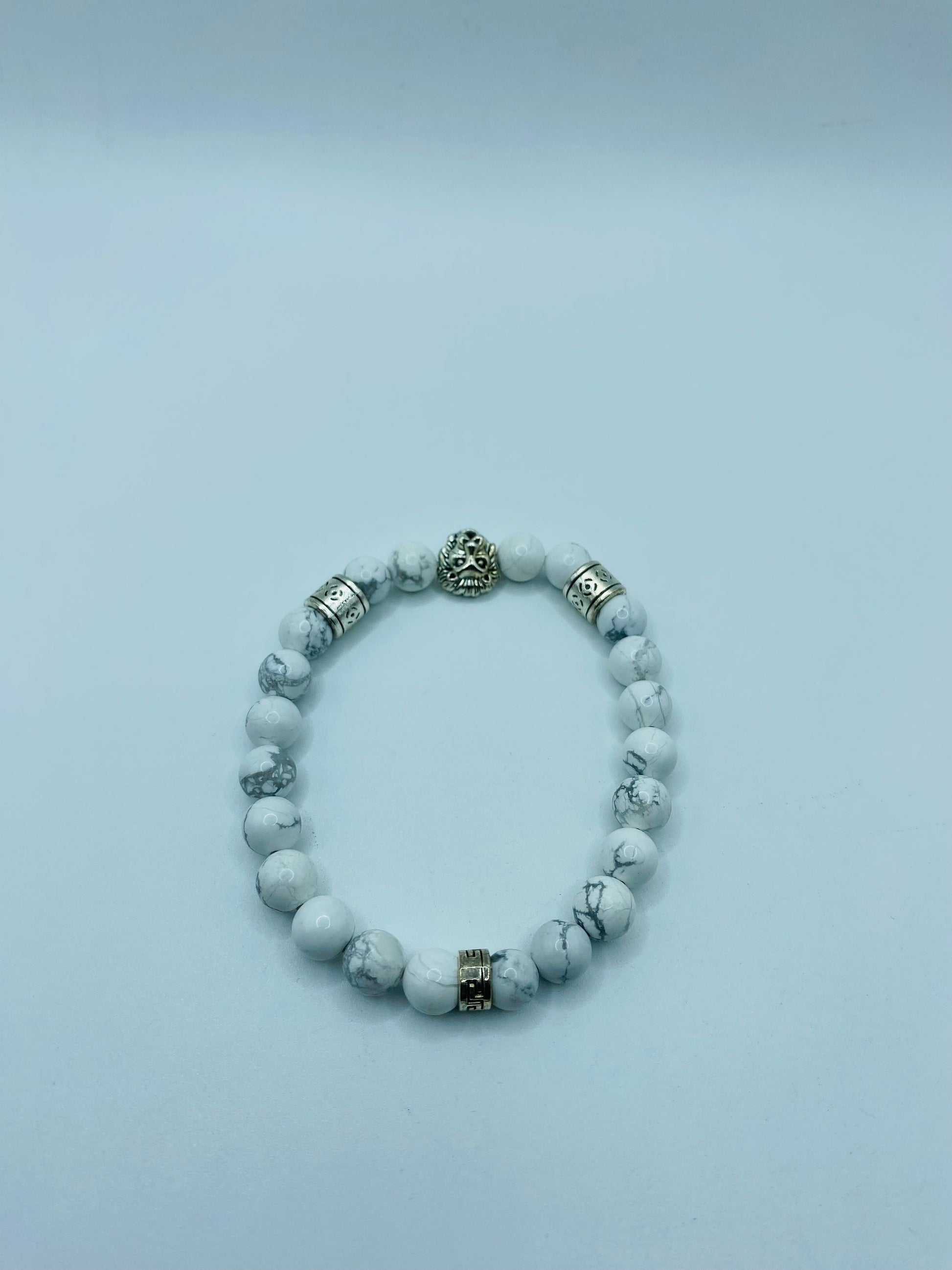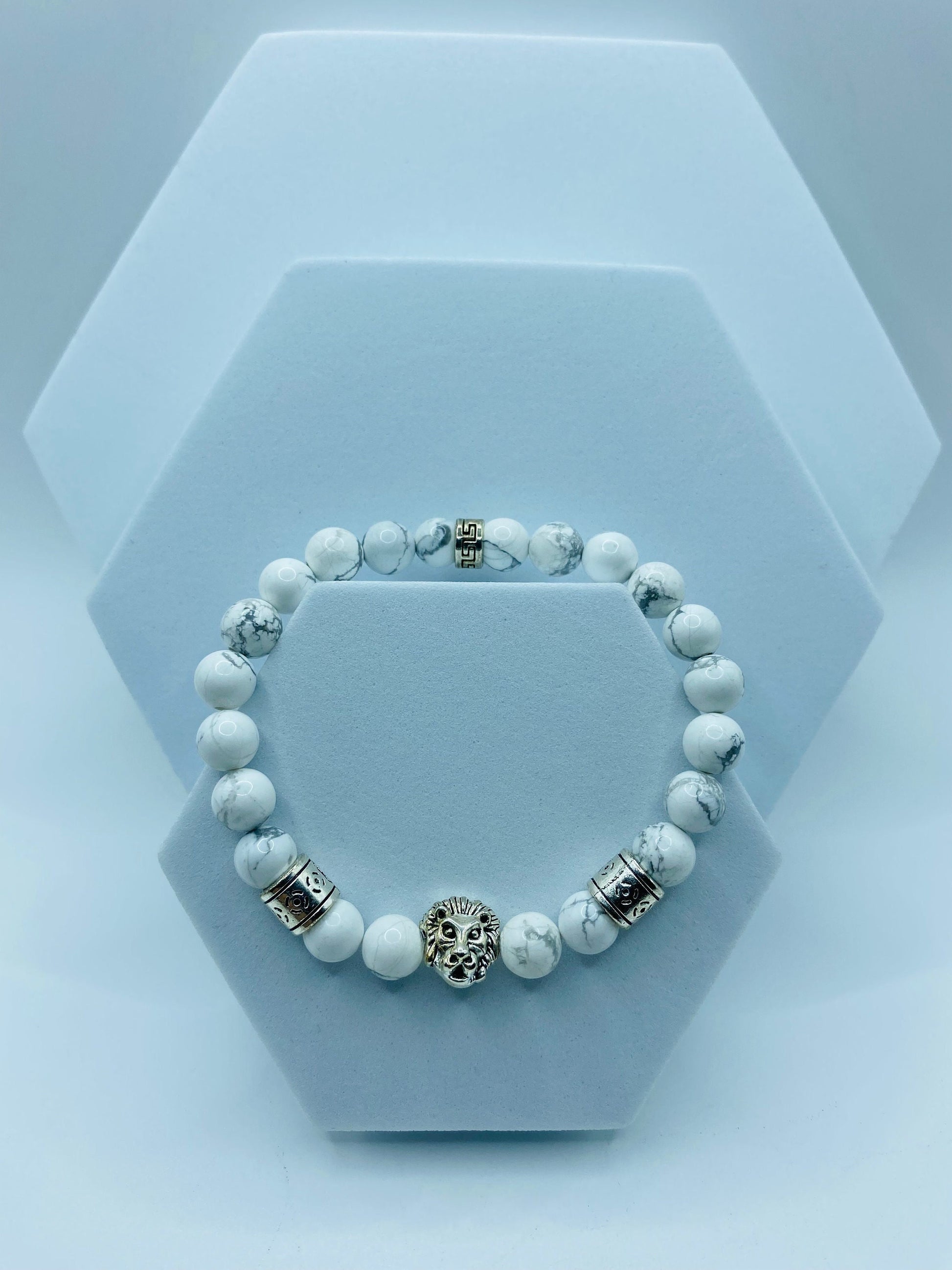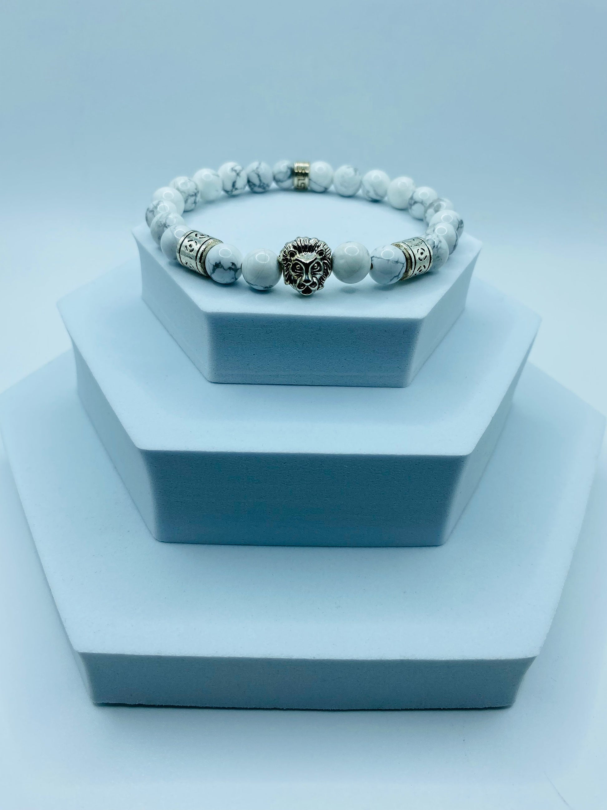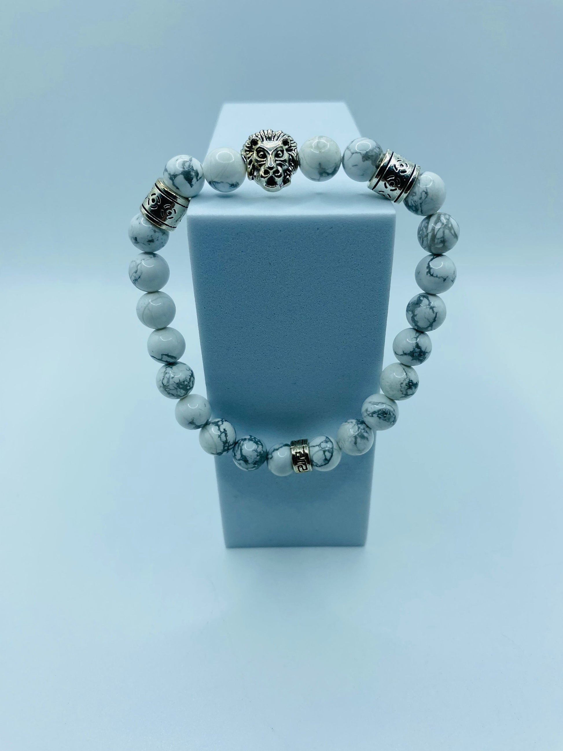 PRODUCT DETAILS - White howlite lion charm gemstone bracelet - 8mm white howlite natural gemstone beads - Antique silver lion charm head - Tibetan antique silver tube bead spacers - Strong, stretchy cord - Handmade in a clean and safe environment