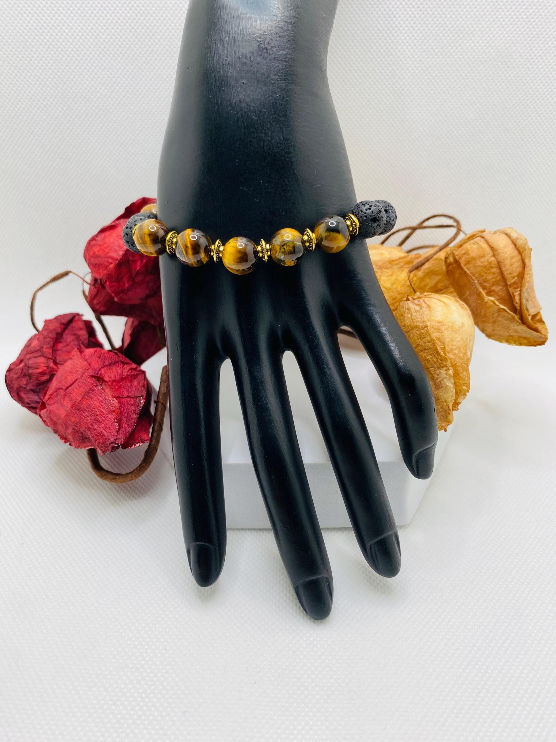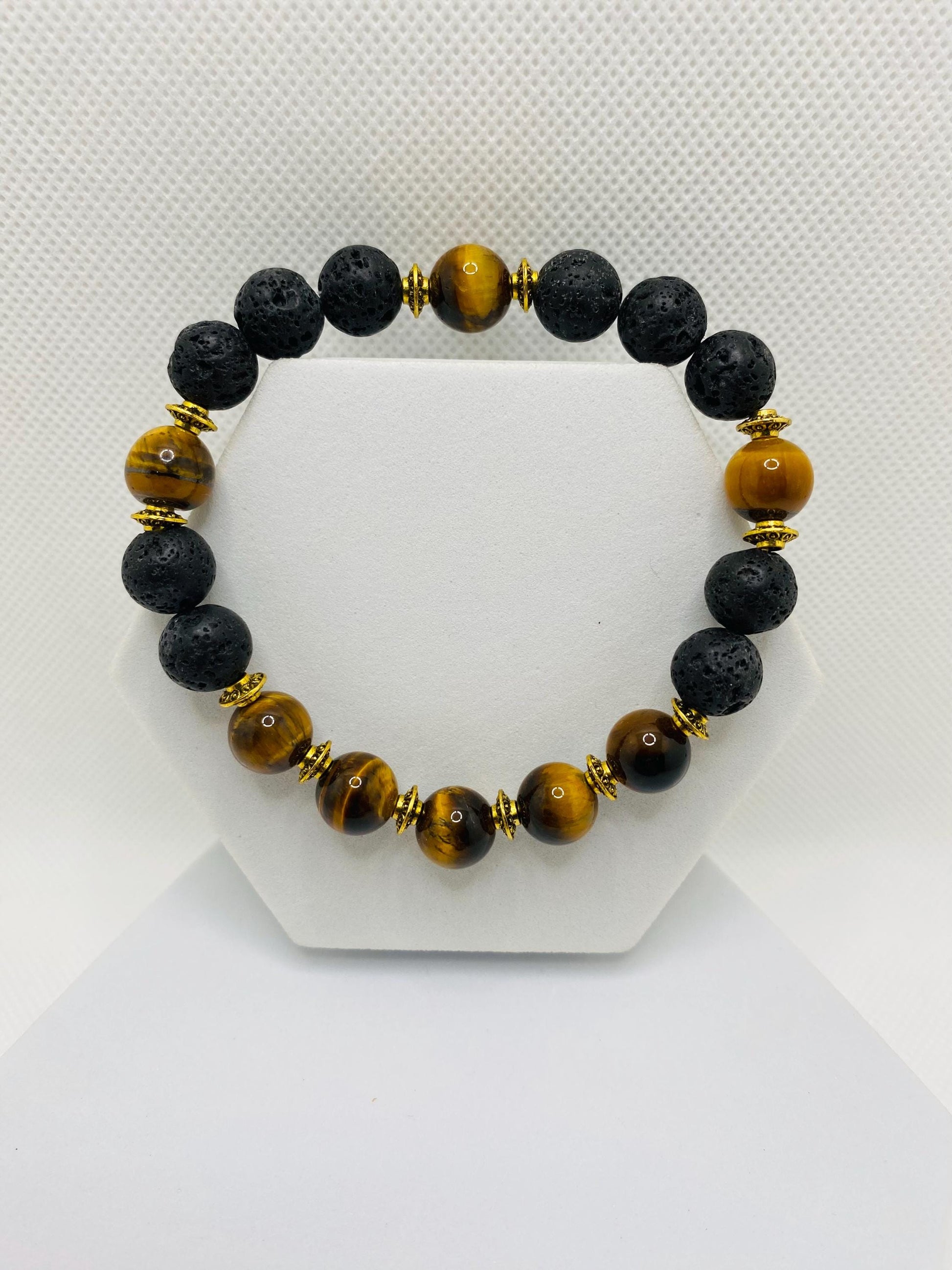 Product Details: 10mm Beautiful Natural Yellow Tigers Eye Gemstone Beads. 10mm Natural Black Lava Rock Gemstone Beads 8mm Antique Gold Tibetan Jewelry Spacers .8mm Super Strong Stretchy Cord.