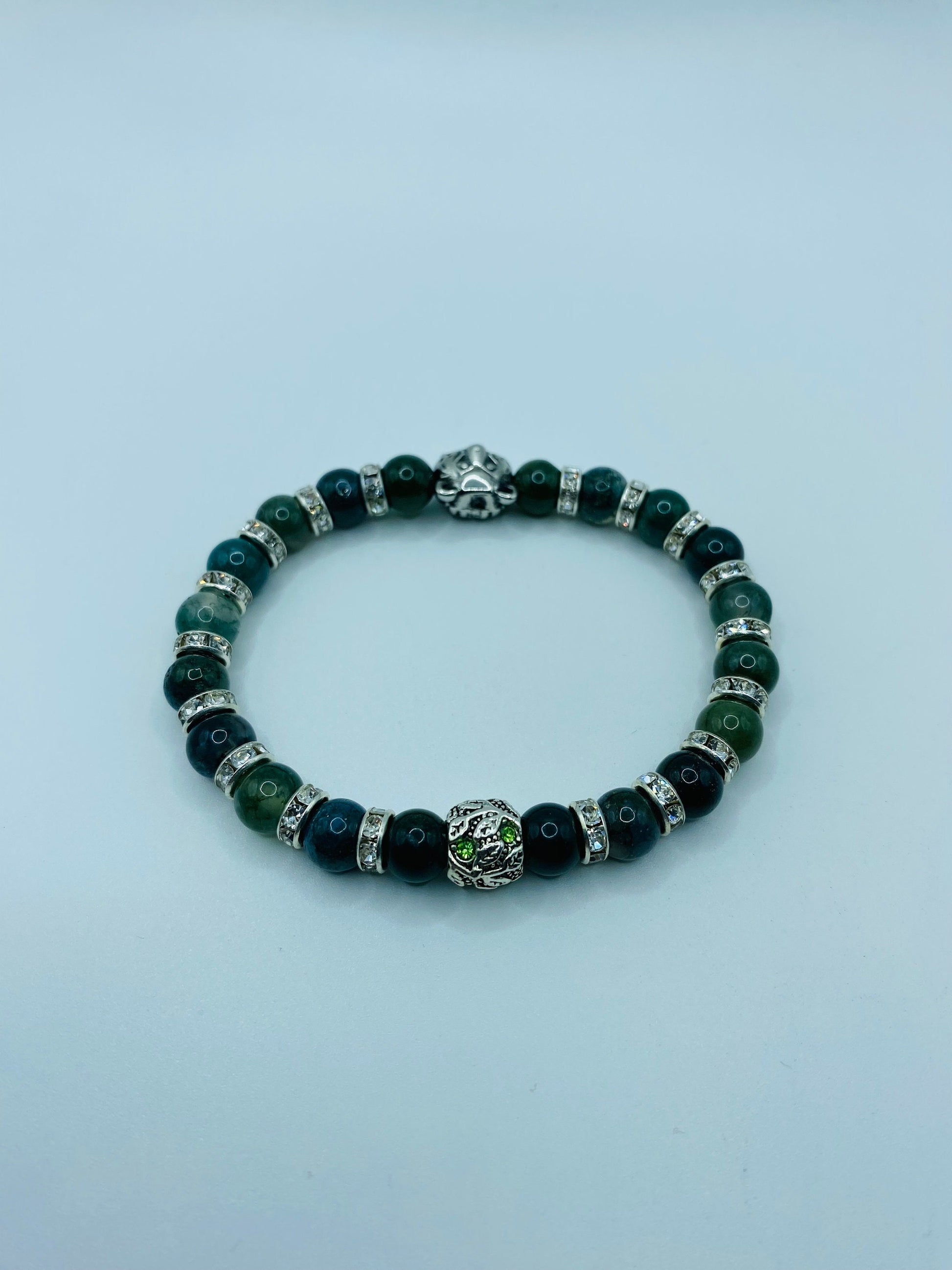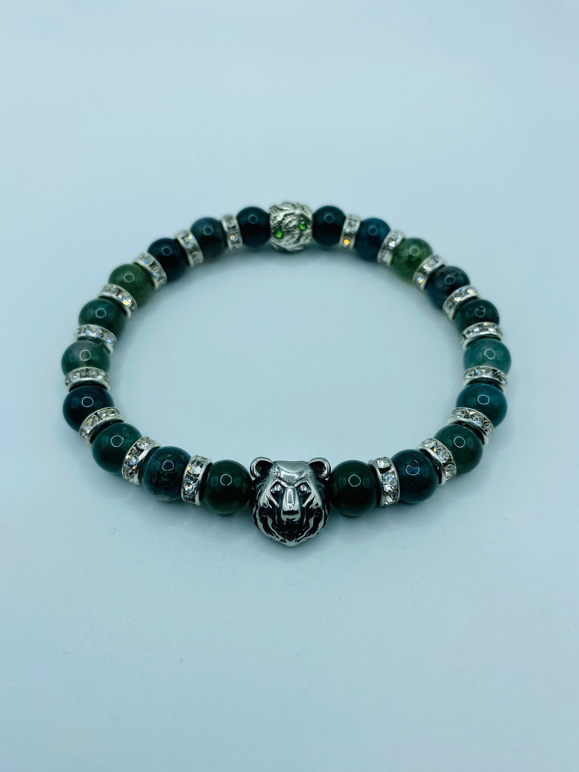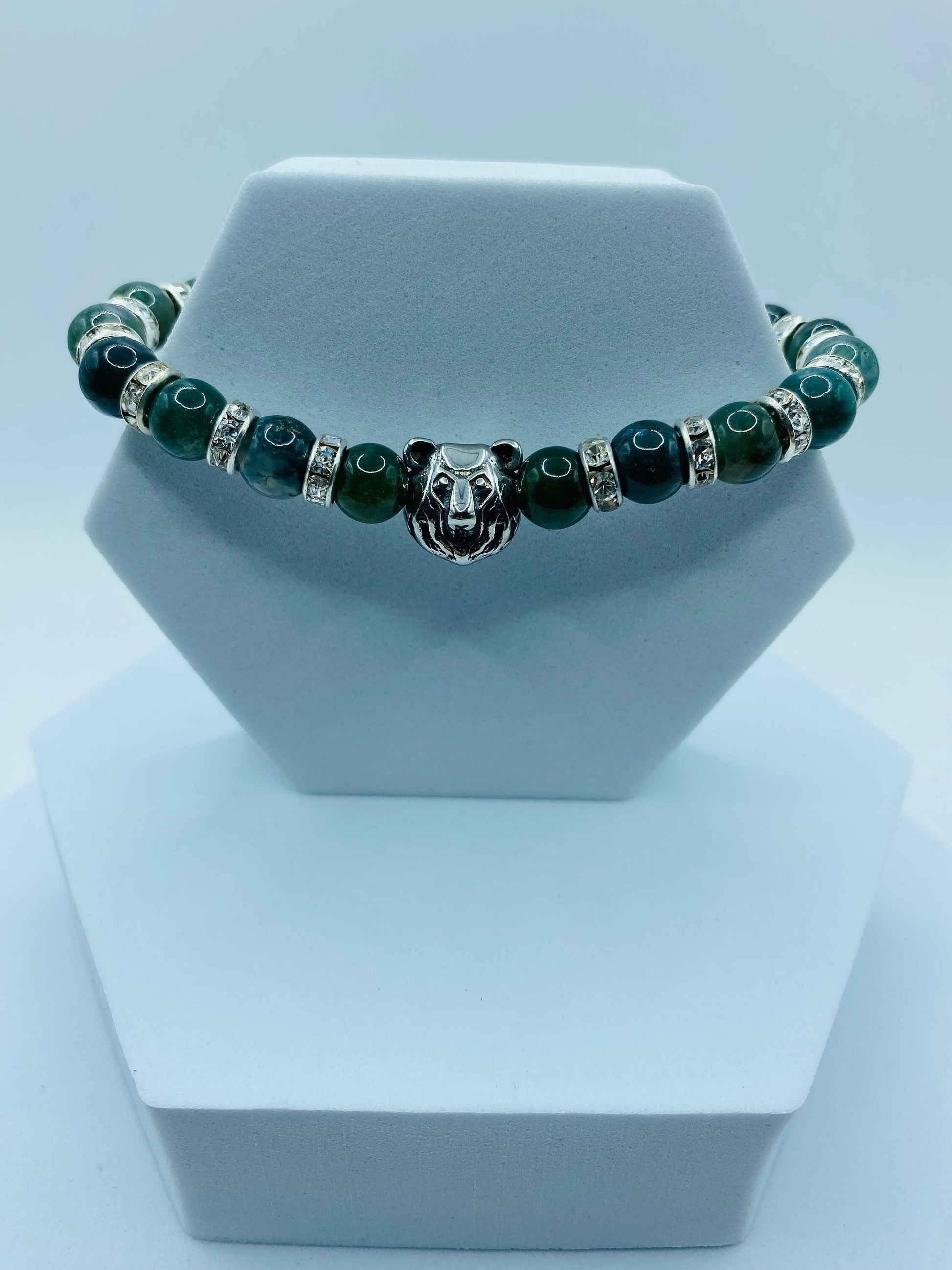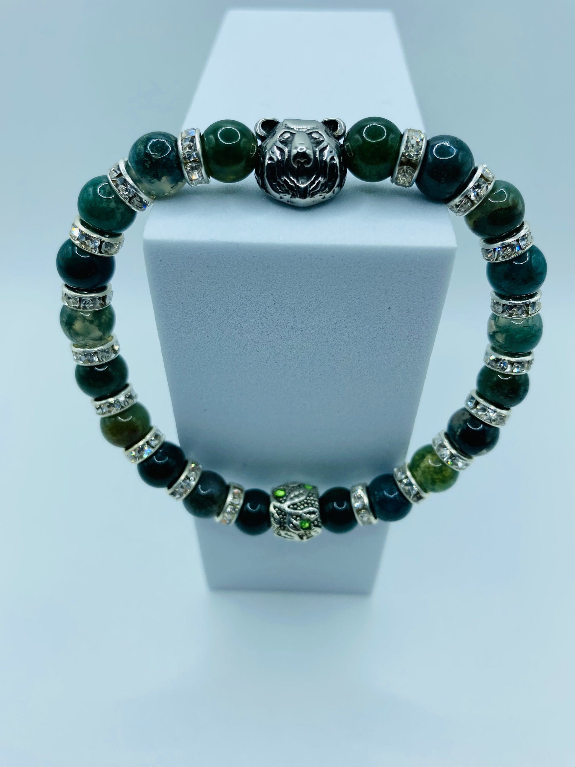 Mens Moss Agate Beaded Bracelet: Bear Charm, Rhinestone Spacers