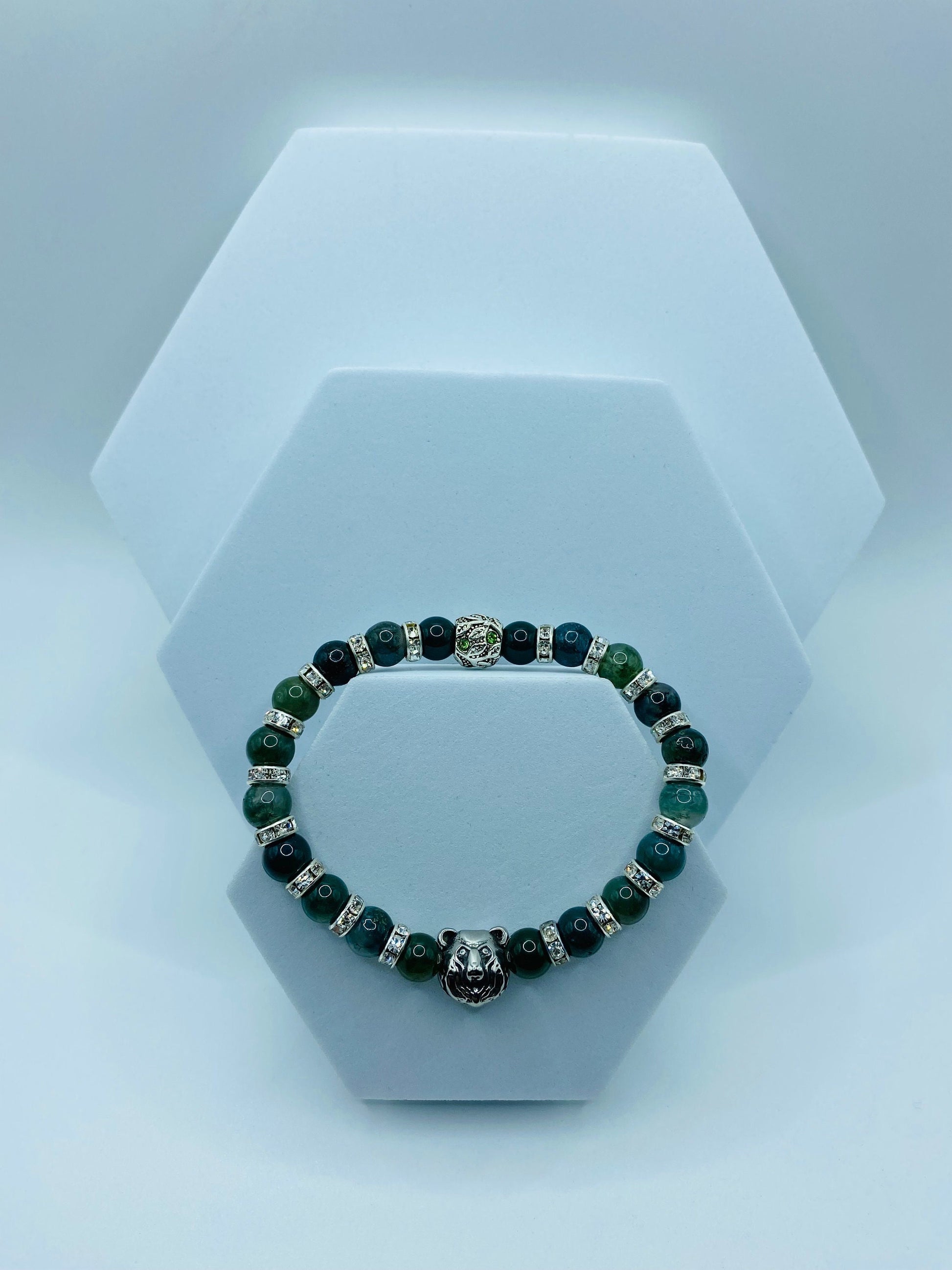 PRODUCT DETAILS - 8mm natural Aquatic Agate gemstone beads - Stainless steel bear head charm - Antique silver spacer with rhinestones - Silver plated rondelle's with rhinestone crystals - Strong, stretchy cord - Handmade in a clean and safe environment