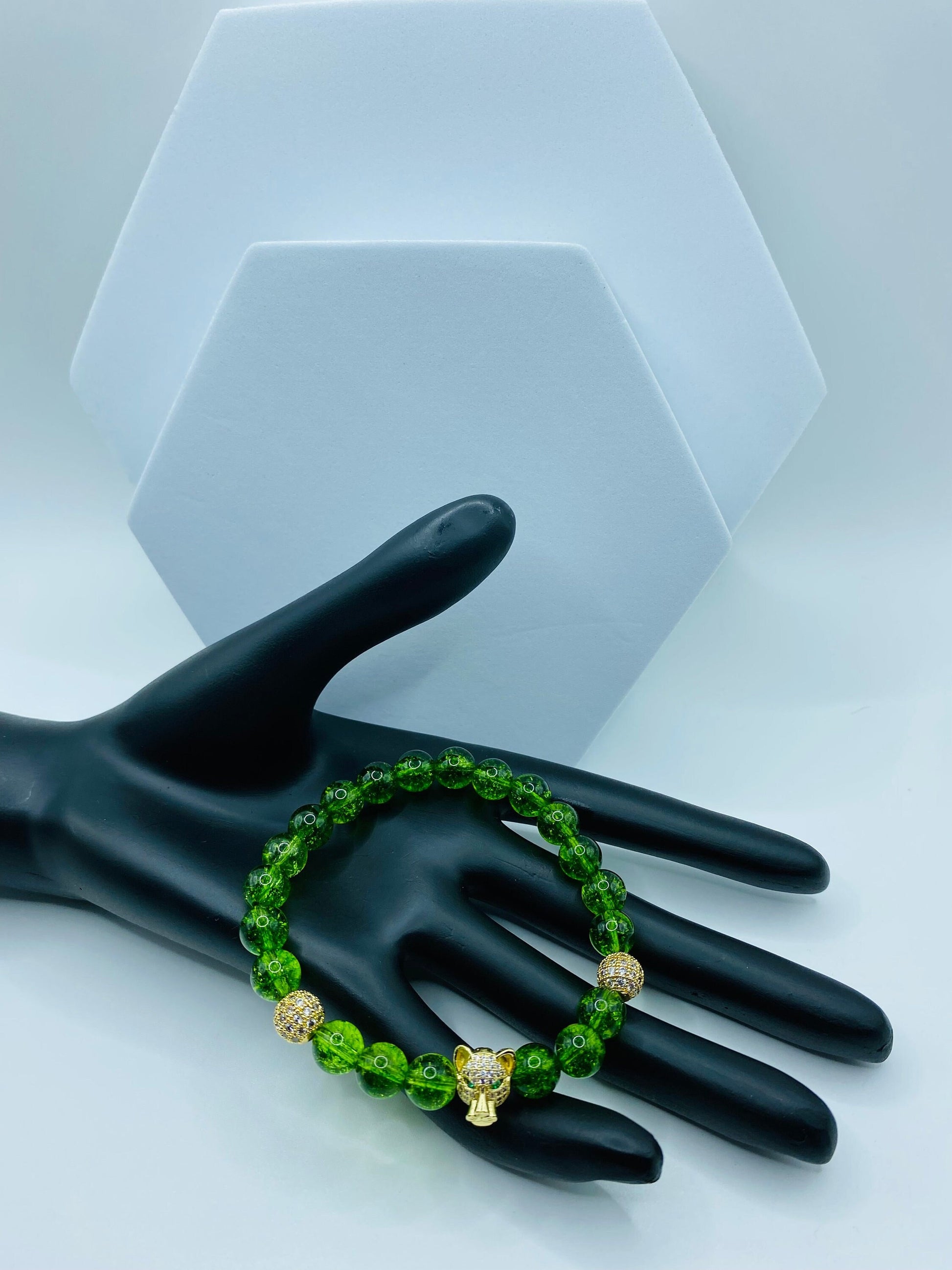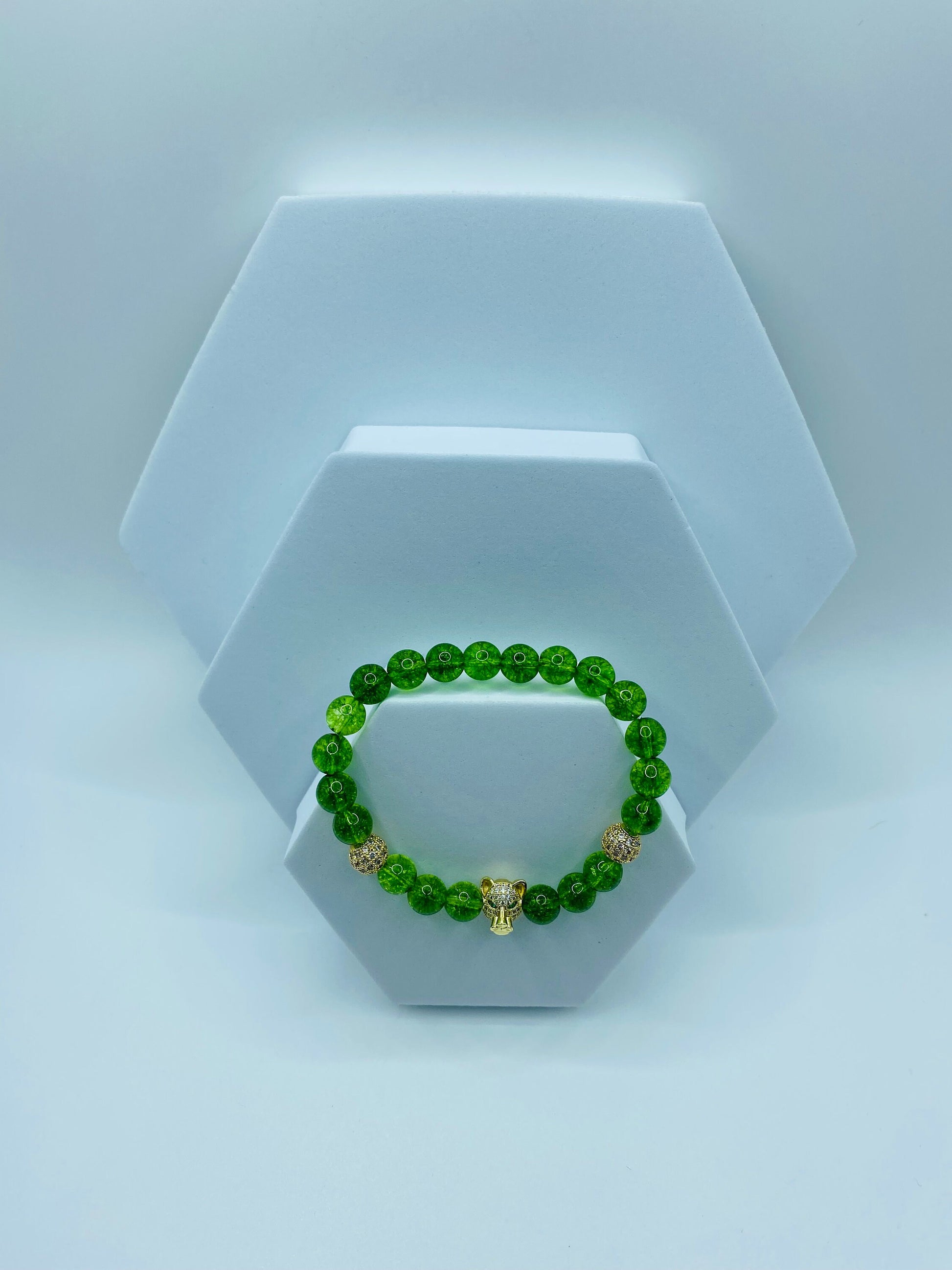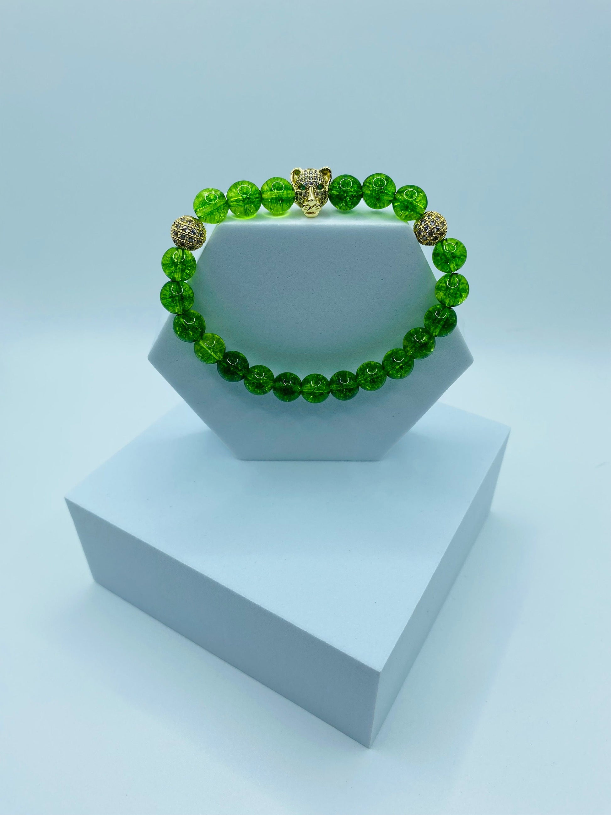 PRODUCT DETAILS - Beautiful tiger head pendant - 8mm green crystal quartz gemstone beads - 8mm 18k gold plated round beads with inlaid cubic zirconia crystals - Strong, stretchy cord - Handmade in a clean and safe environment
