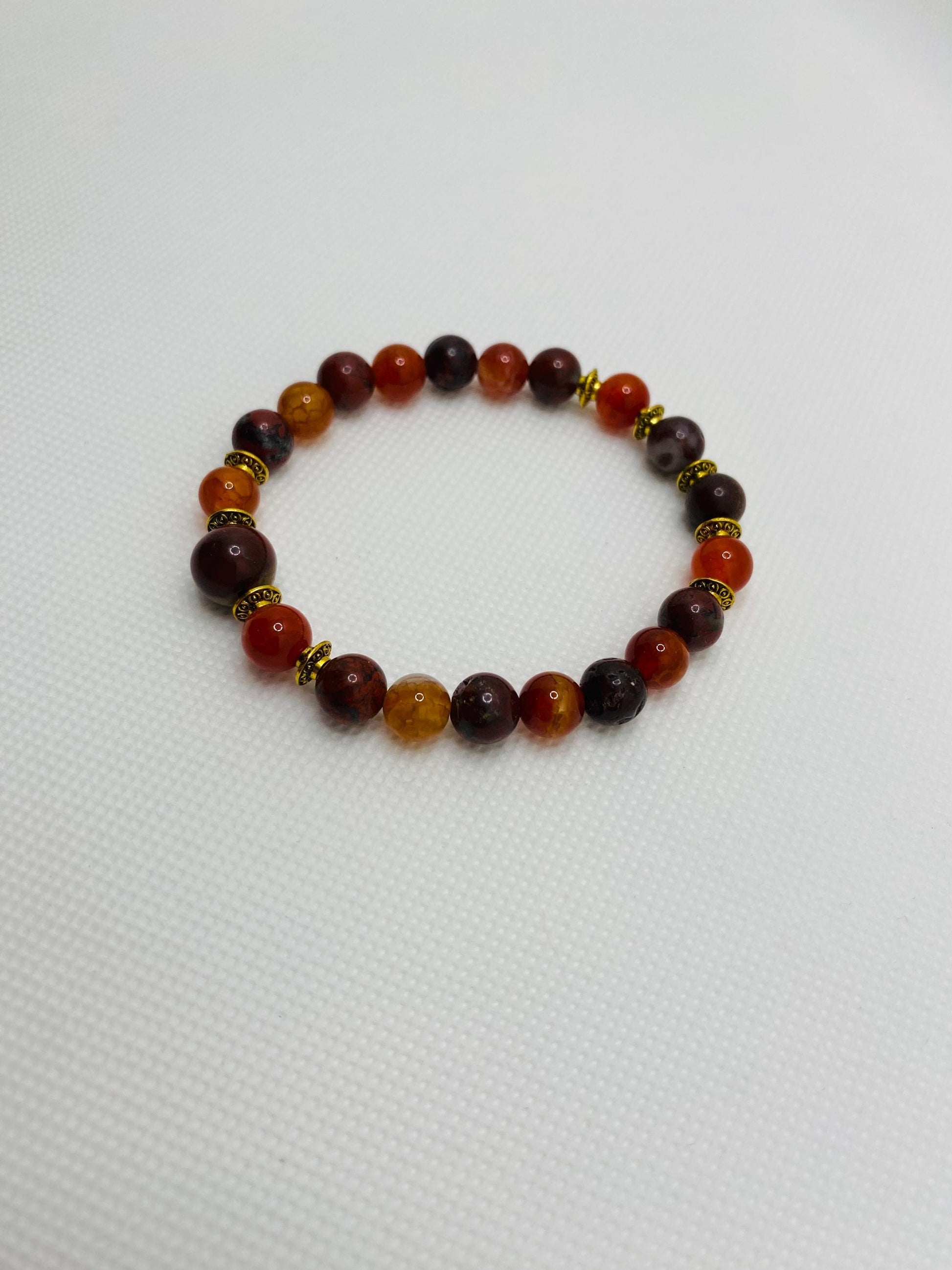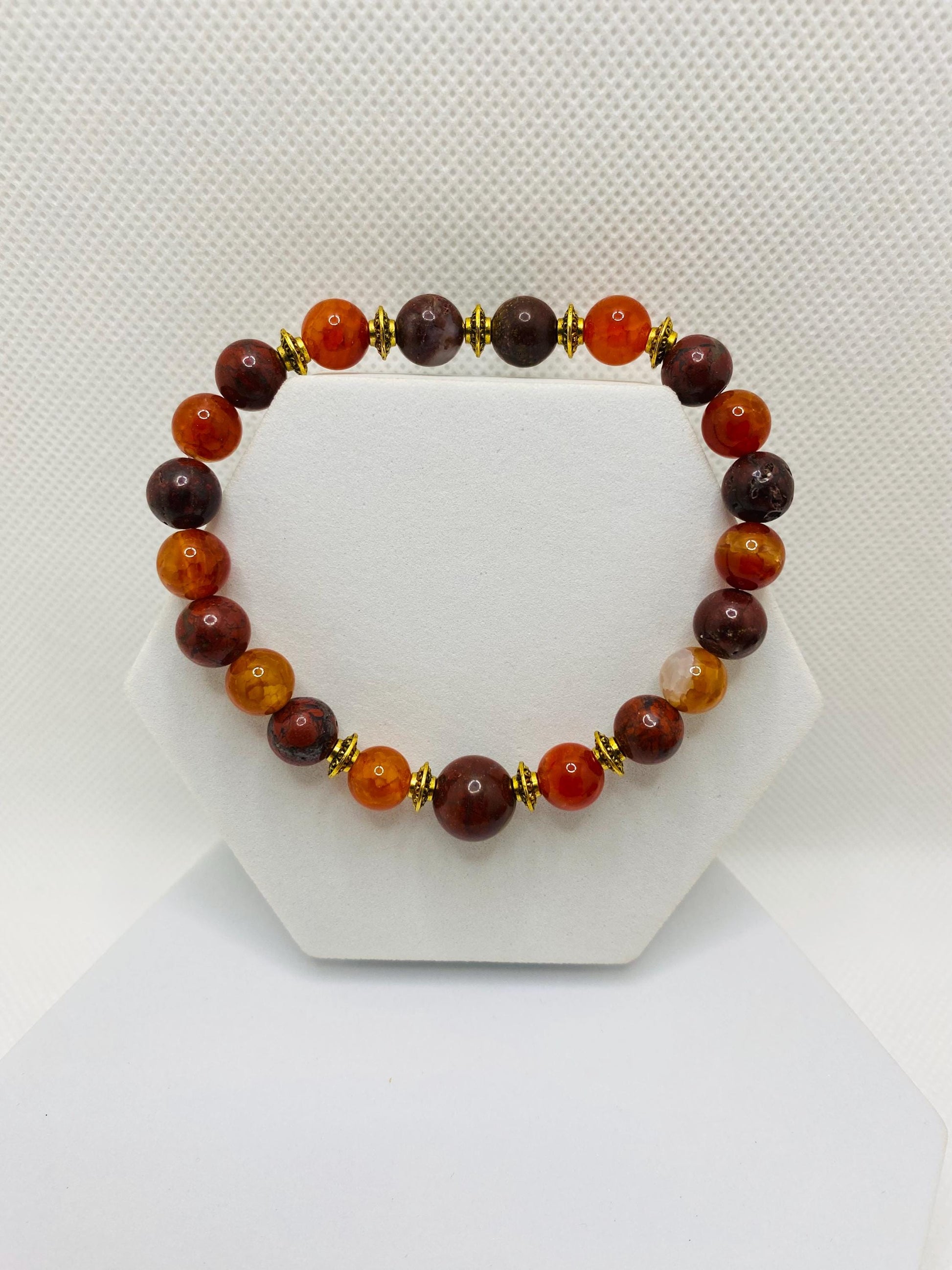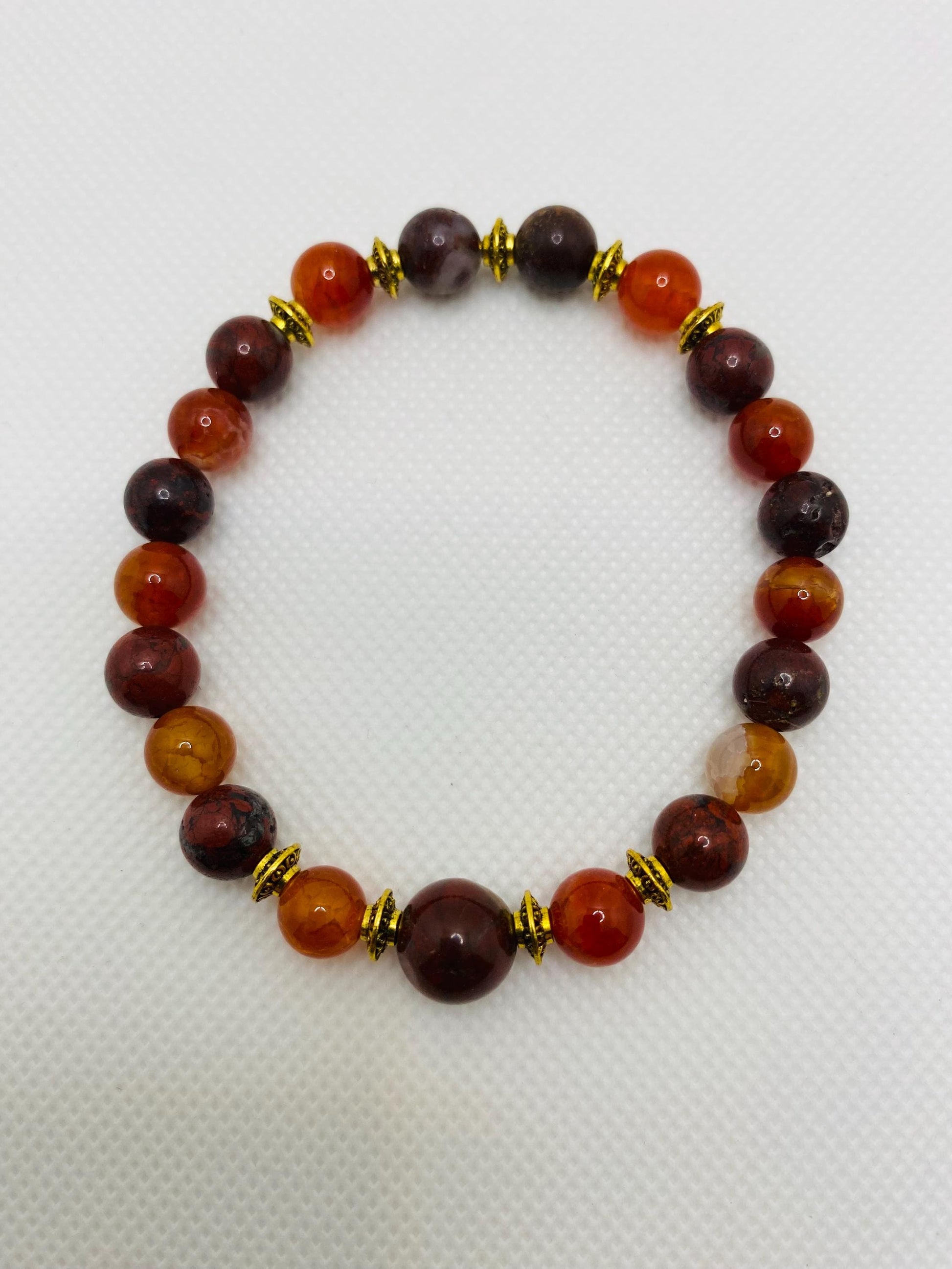 PRODUCT DETAILS - 10mm natural red jasper gemstone bead - 8mm natural red jasper gemstone beads - 8mm natural dragons vein agate gemstone beads - Antique Gold Tibetan Tube Spacers - Strong, stretchy cord - Handmade in a clean and safe environment