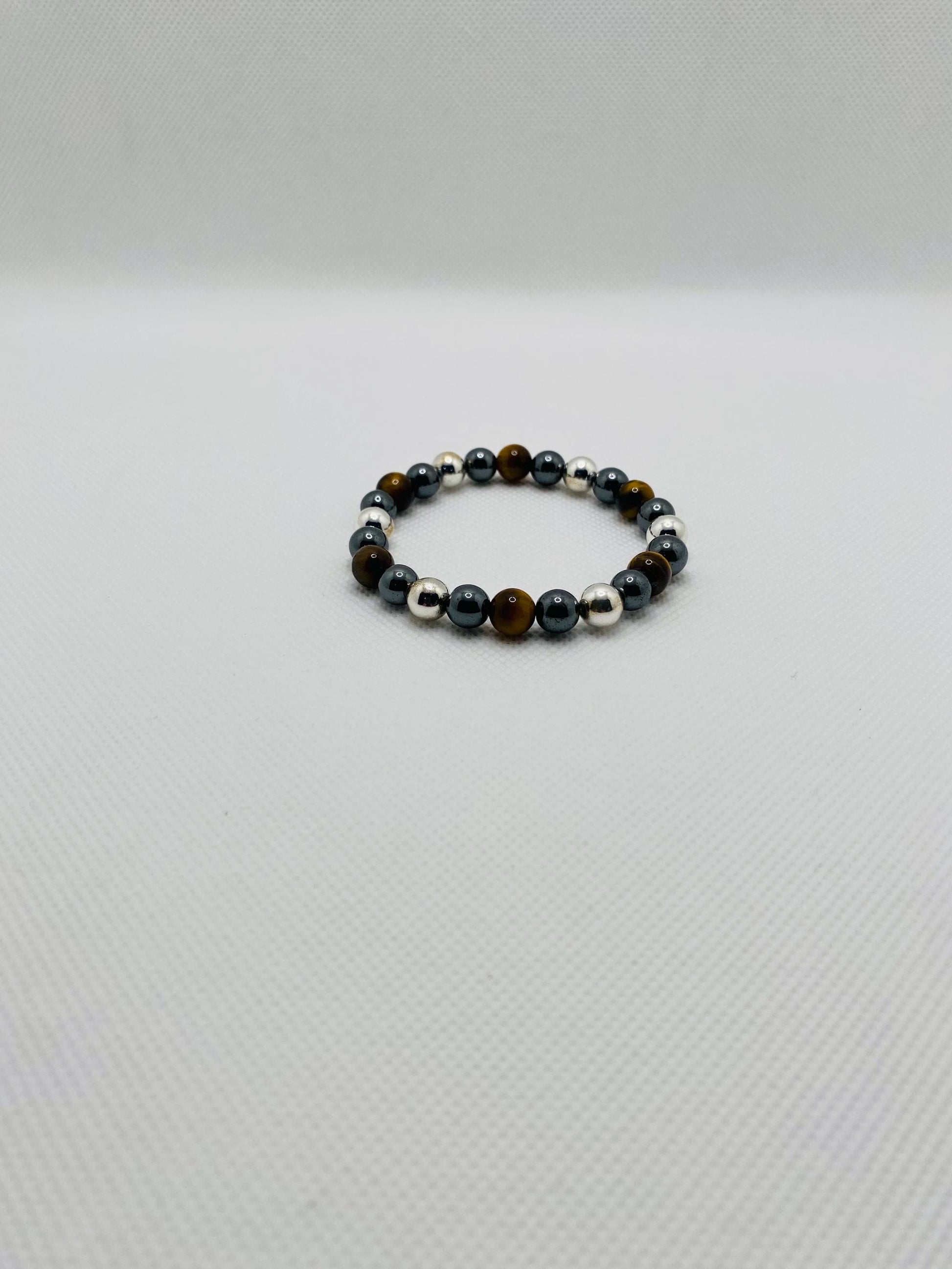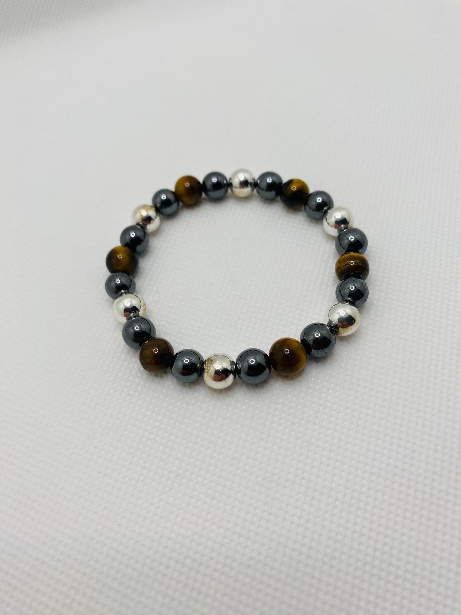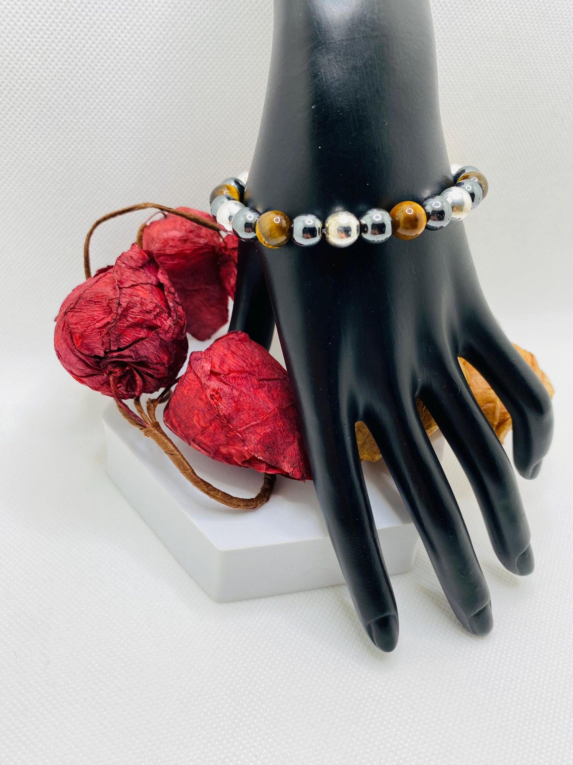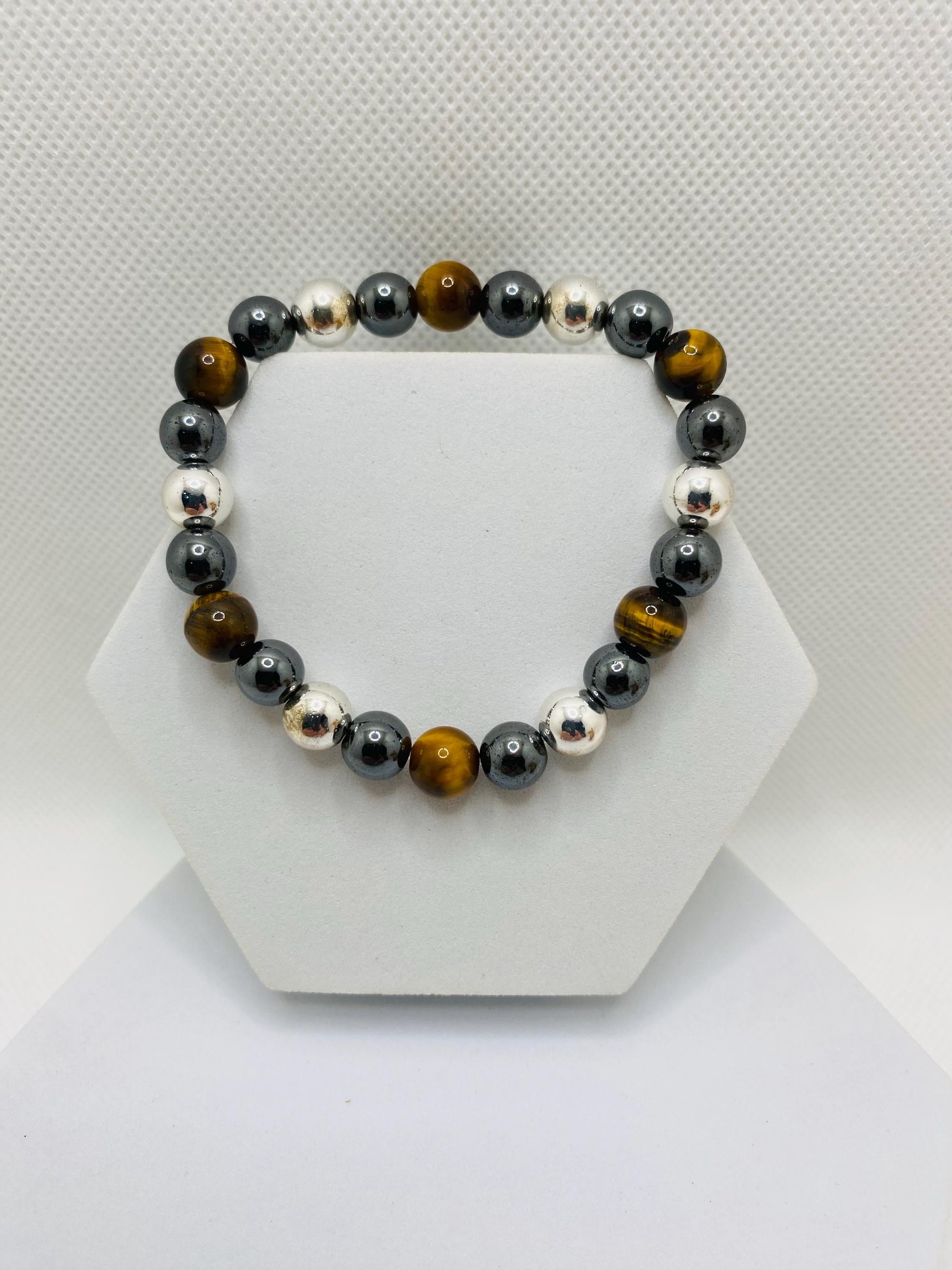 PRODUCT DETAILS - 8mm AAA natural black hematite gemstone beads - 8mm silver plated hematite gemstone beads - 8mm yellow tigers eye gemstone beads - Strong, stretchy cord - Handmade in a clean and safe environment