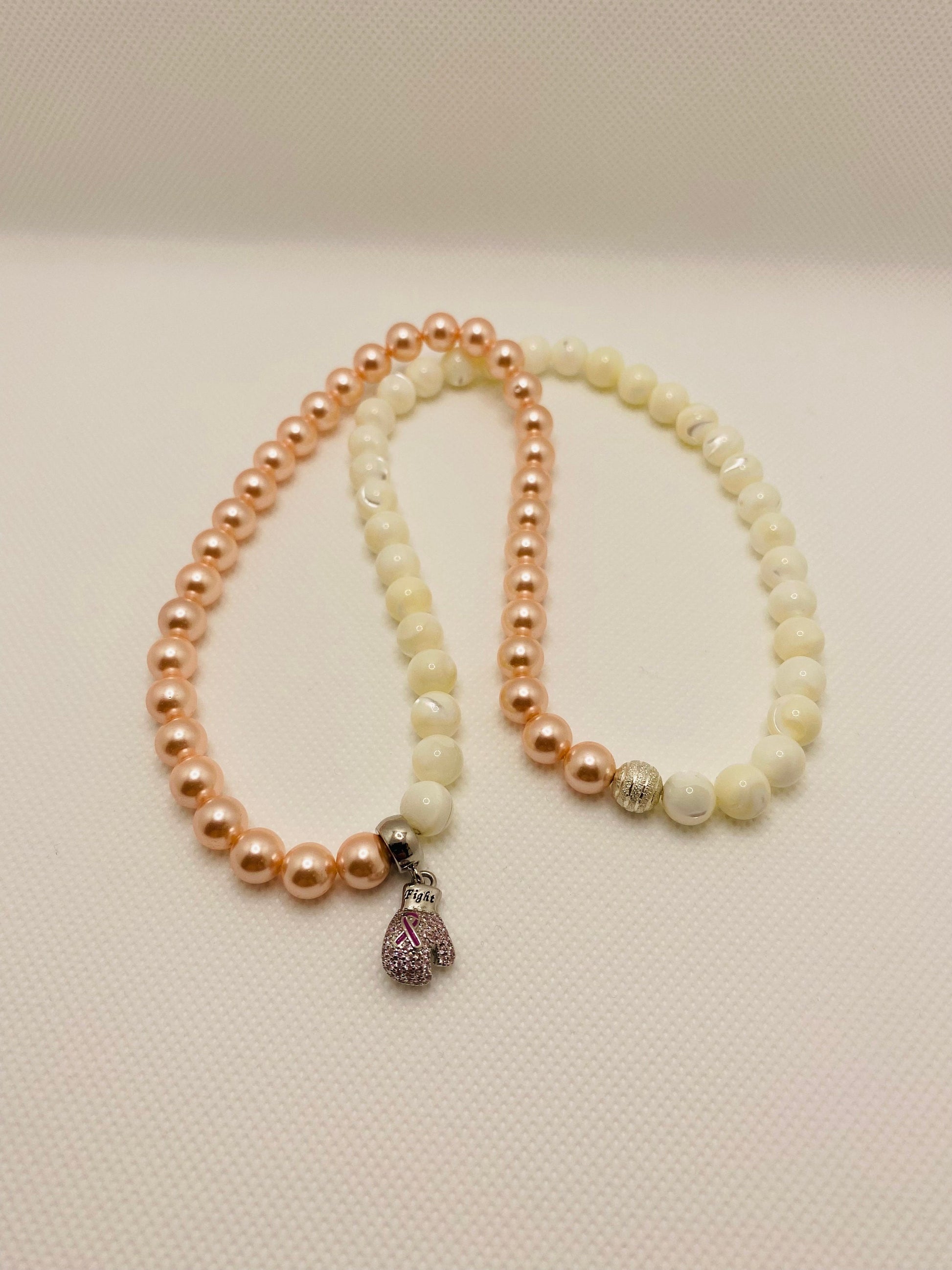 Mother of Pearl Beaded Necklace: Pink Ribbon Boxing Glove, Cancer Survivor Gift