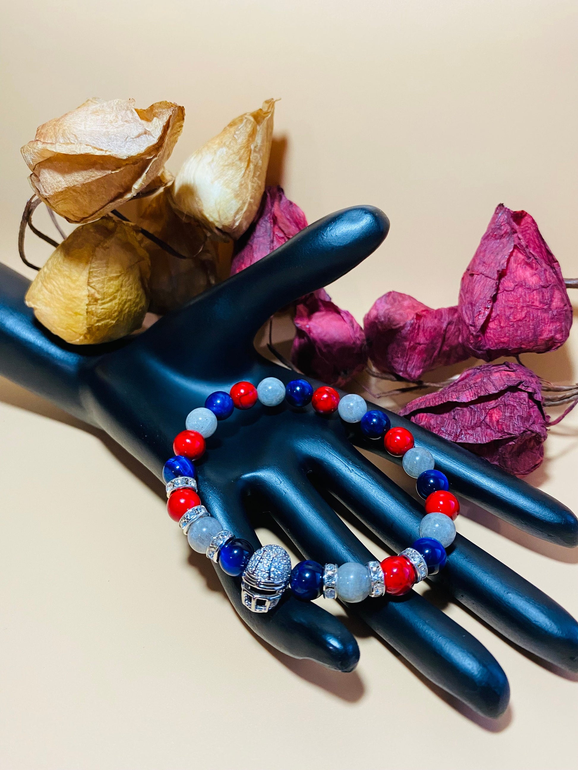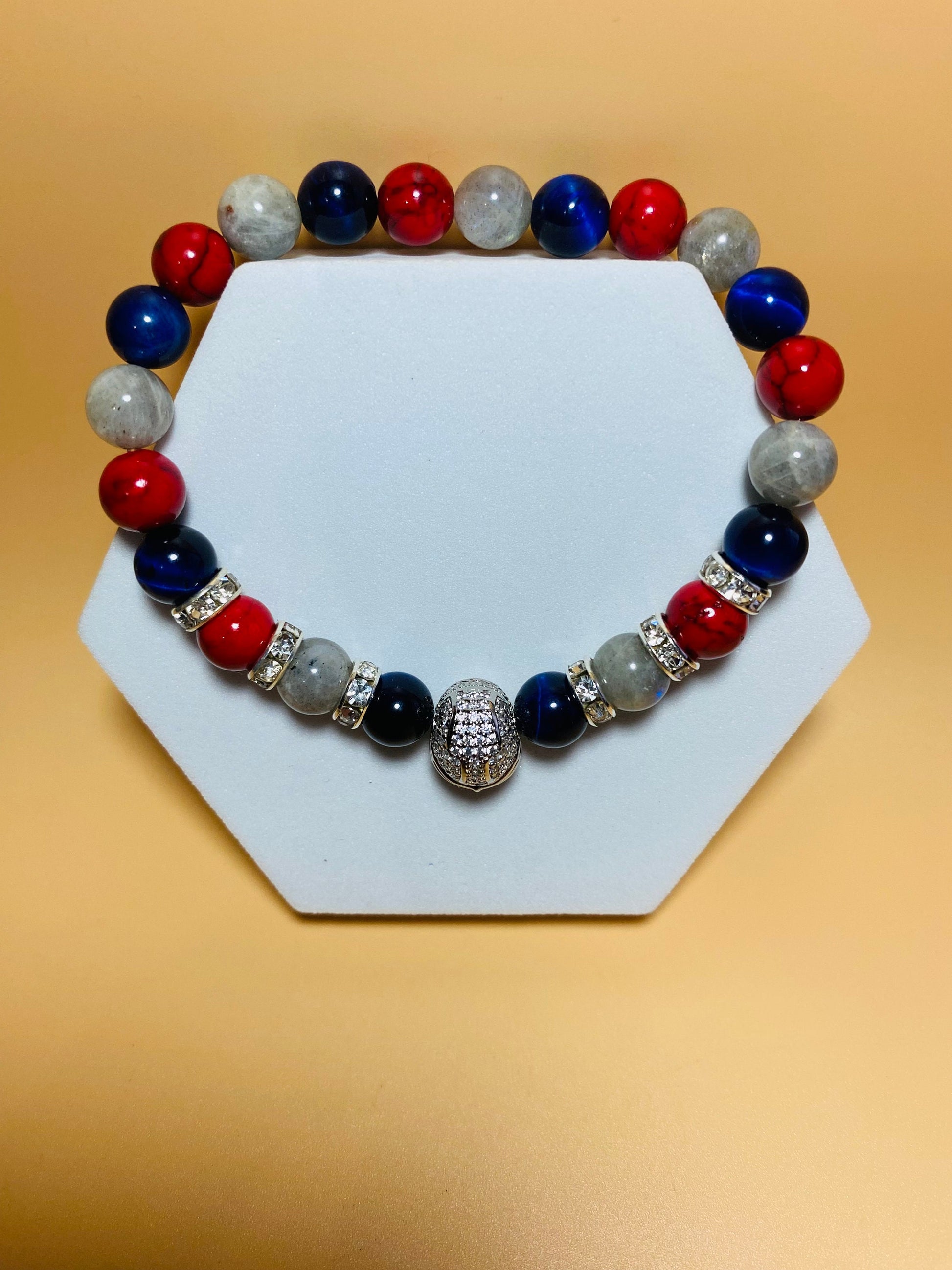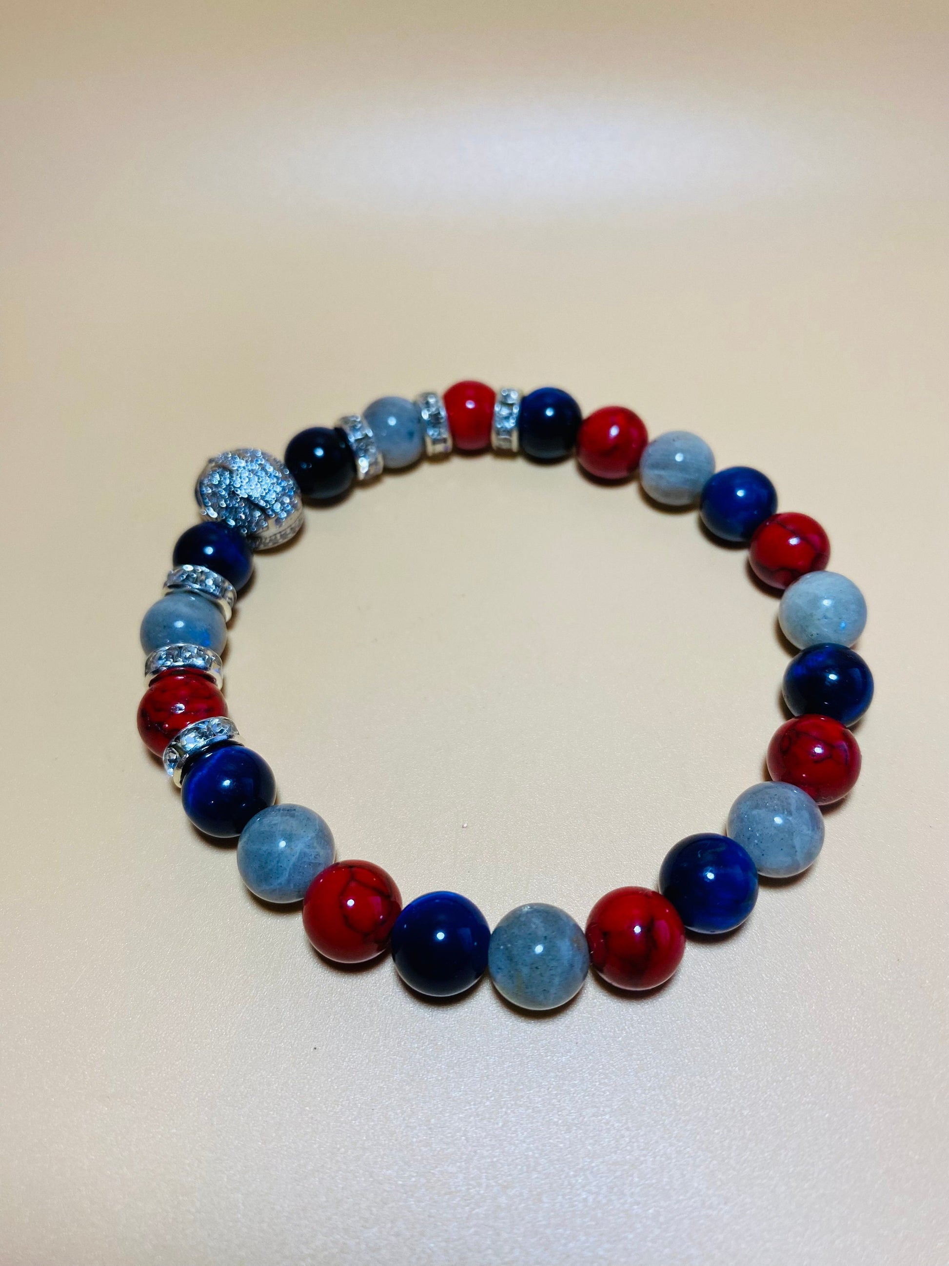 PRODUCT DETAILS - 8mm Silver Labradorite gemstone beads - 8mm blue tiger's eye gemstone beads - 8mm red Turquoise gemstone beads - Silver Metallic Plated Football Helmet with Inlaid Cubic Zirconia - Silver plated 8mm rondelles with rhinestones - Strong, stretchy cord - Handmade in a clean and safe environment
