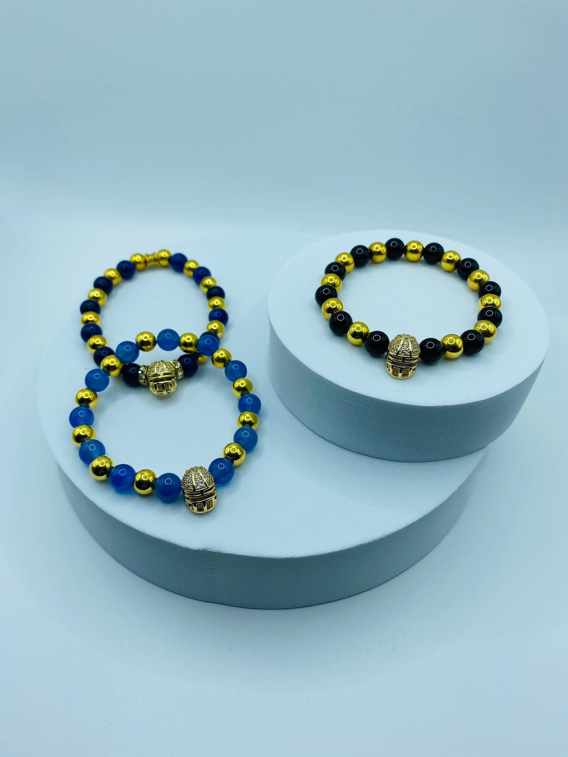 PRODUCT DETAILS - 8mm 18k gold plated hematite gemstone beads - 8mm natural onyx gemstone beads - Metallic gold-plated football helmet with inlaid cubic zirconia - Strong, stretchy cord - Handmade in a clean and safe environment
