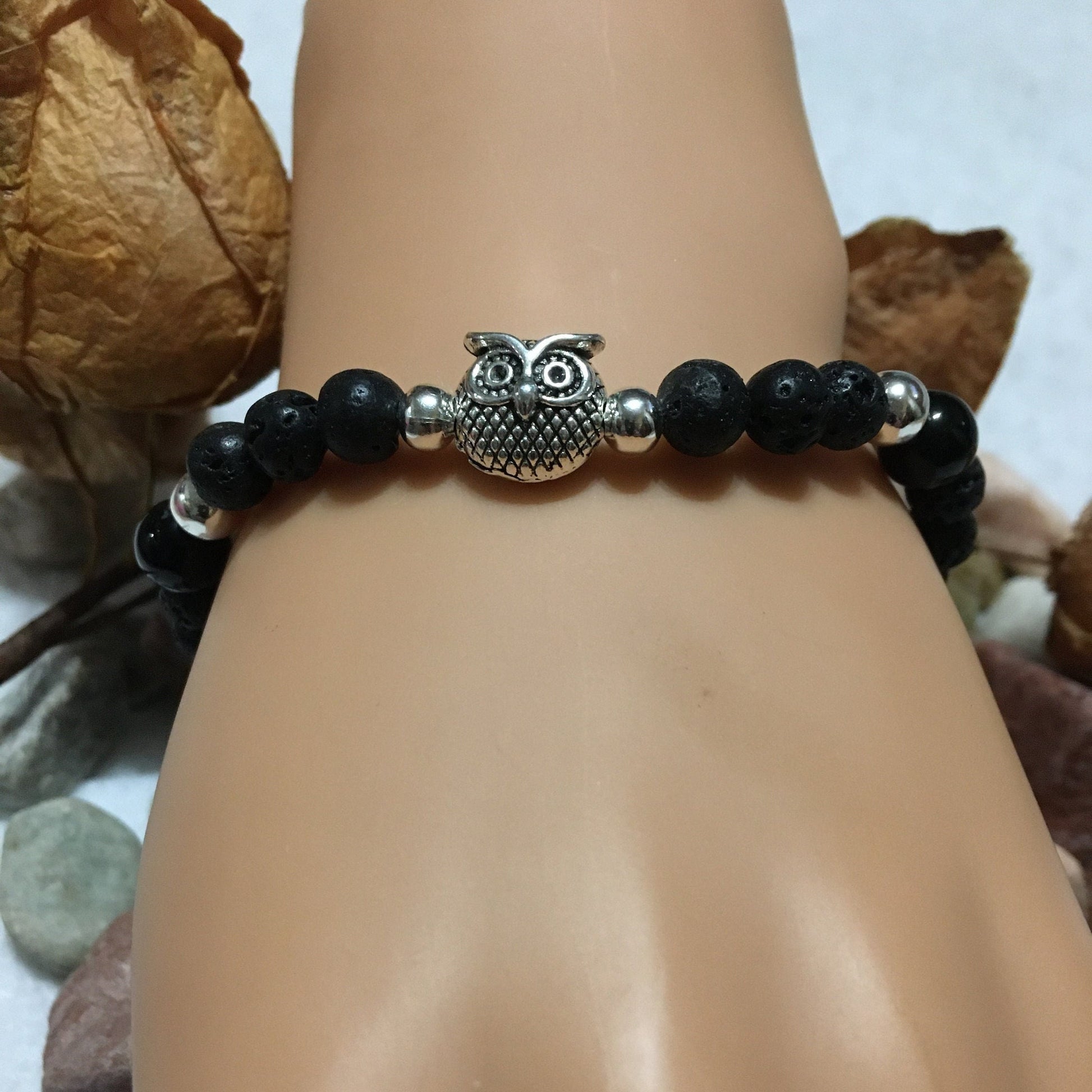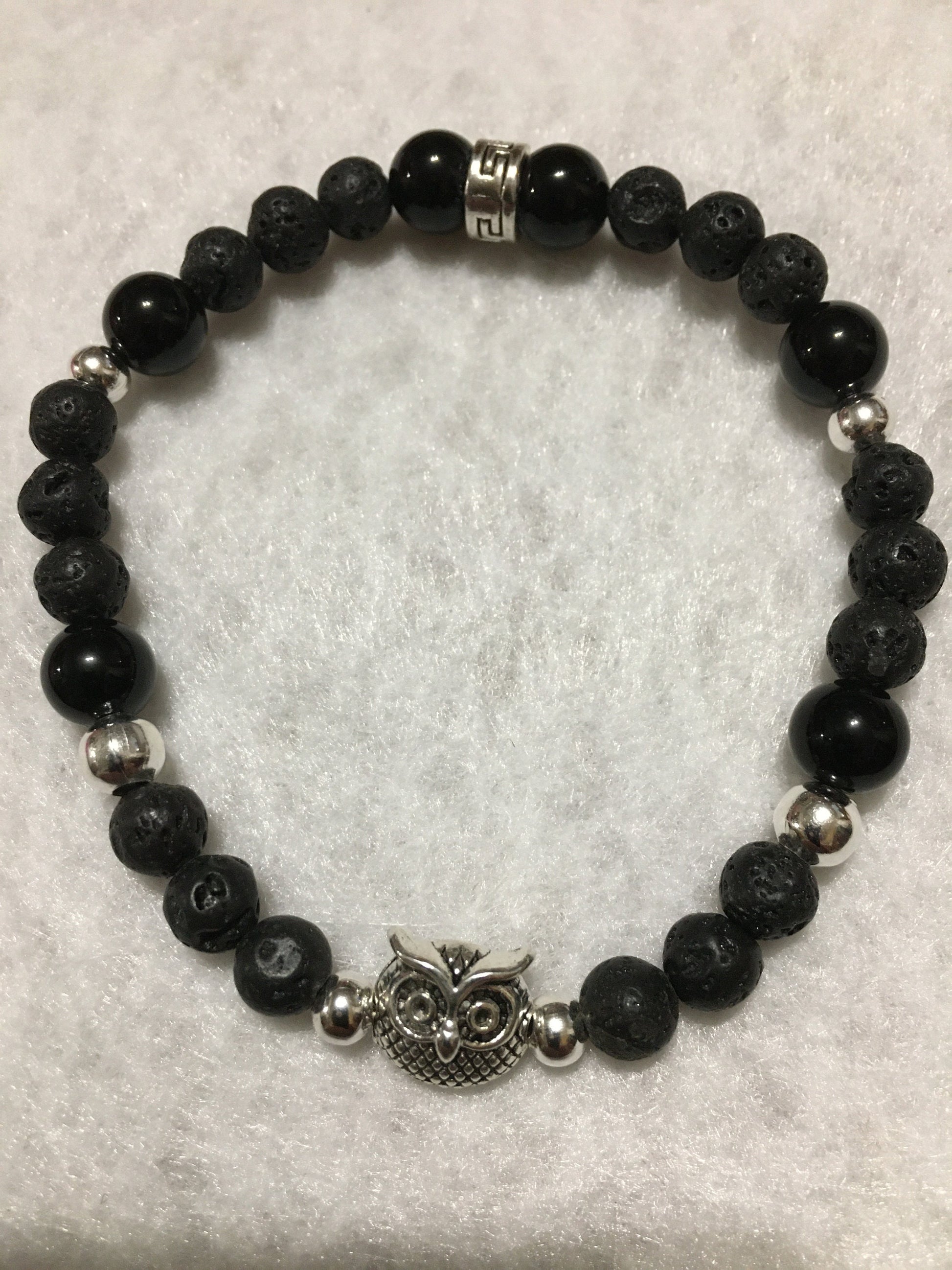 PRODUCT DETAILS - Black onyx, lava rocks owl head charm bracelet - 6mm black lava rock gemstone beads - 8mm black onyx gemstone beads - Antique silver owl head polished charm - 4mm silver plated hematite beads - Strong, stretchy cord - Handmade in a clean and safe environment