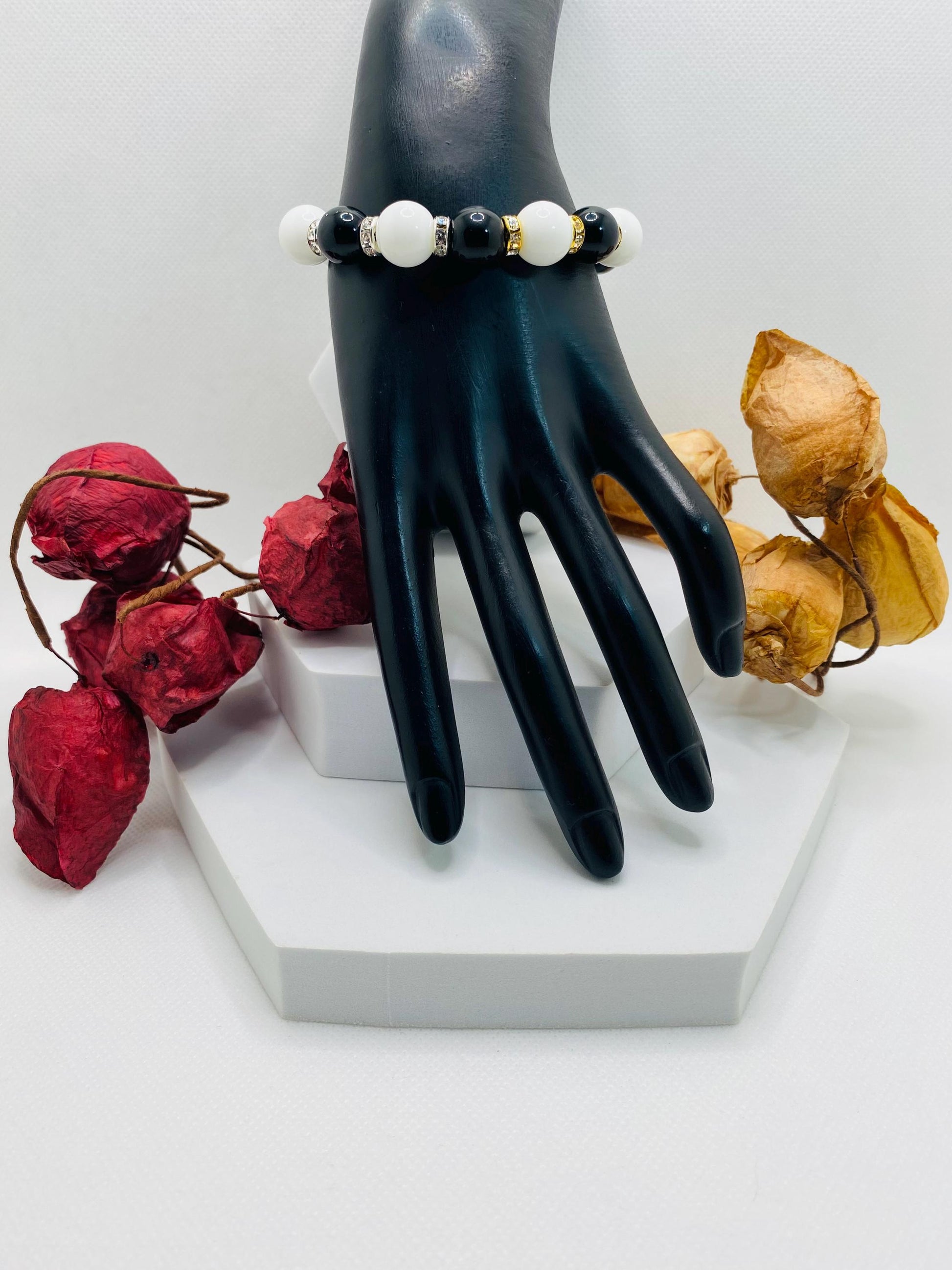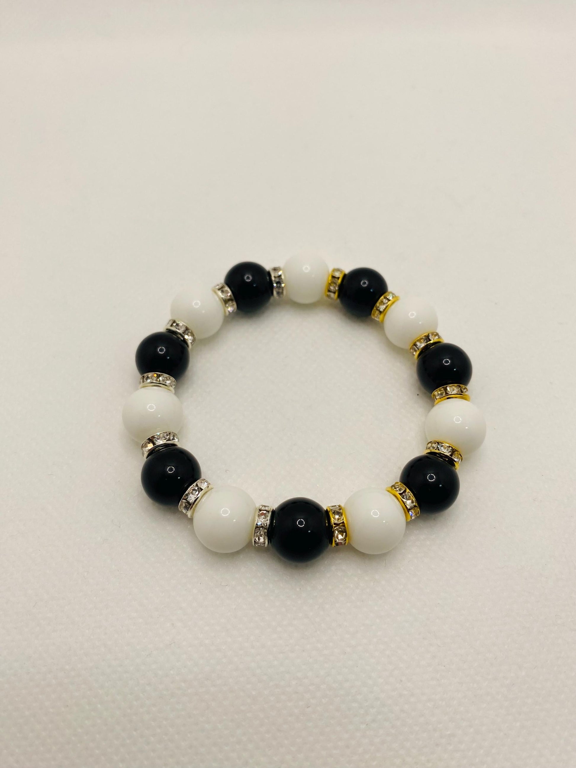 PRODUCT DETAIL - 12mm natural black onyx gemstone beads - 12mm natural white onyx gemstone beads - Gold plated rondelles with sparkling rhinestones - Silver plated rondelles with sparkling rhinestones - Strong, stretchy cord - Handmade in a clean and safe environment