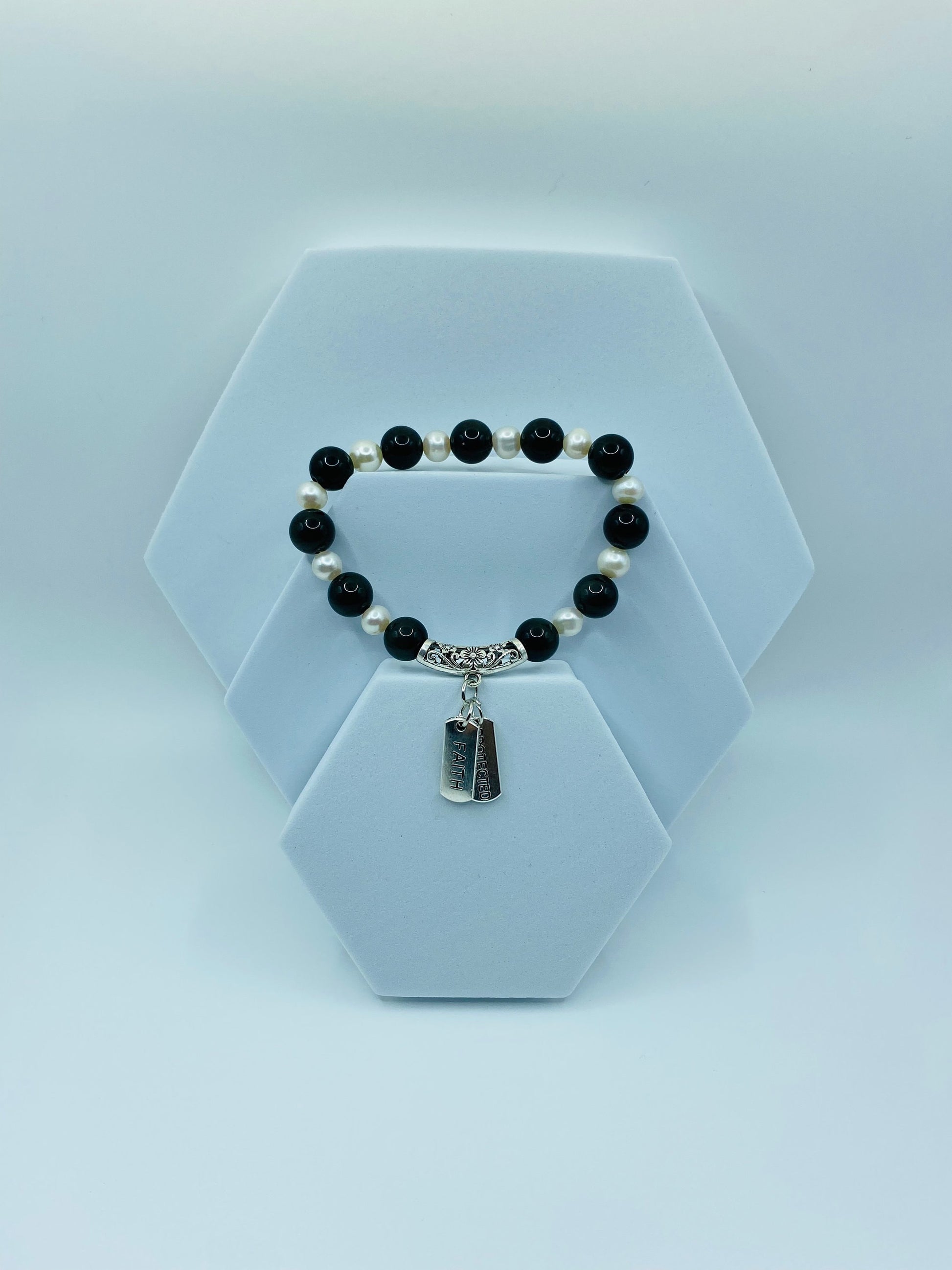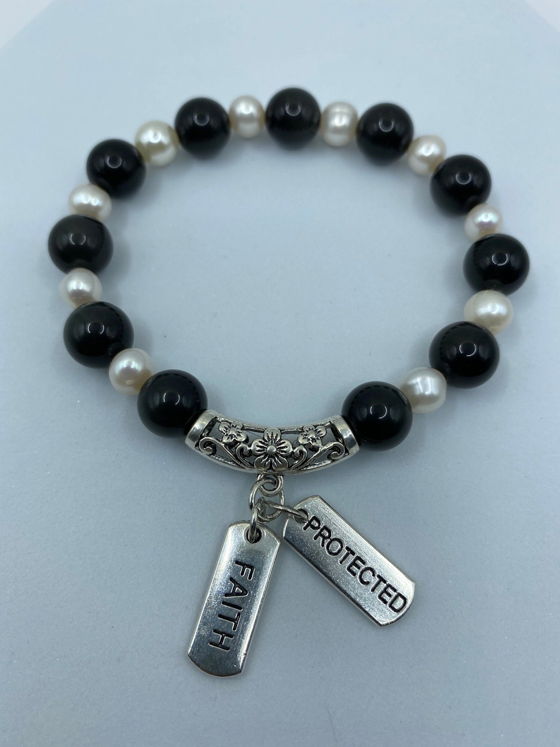 PRODUCT DETAILS - Onyx gemstone, cultured pearls word charm bracelet - 8mm natural onyx gemstone beads - 7/9mm natural cultured freshwater pearls - Stainless steel word charms (protected, faith) - Antique silver Tibetan tube bail charm holder - Strong, stretchy cord - Handmade in a clean and safe environment